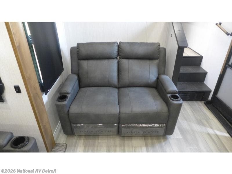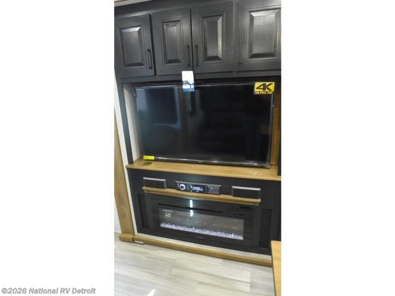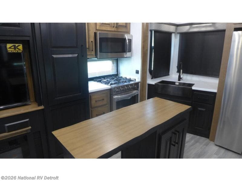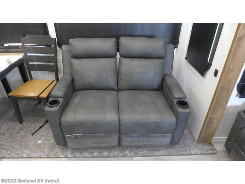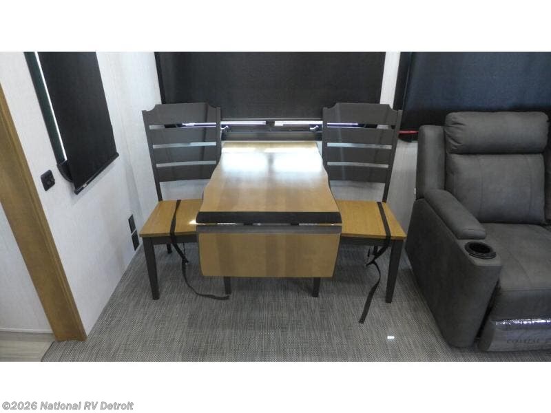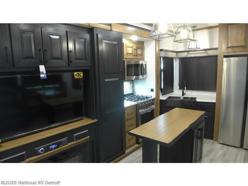 Looking for choices when you dine in your next RV? You have just that with the center island with stools or the live edge dinette table with two standard chairs and two folding chairs. You could work from these locations as well if needed. The rear kitchen offers windows for natural lighting and great views of your campsite, plus an 18 cu. ft. refrigerator, and a sink to keep everything clean. You will love your kitchen appliances nearby to make warm meals, plus there is a pantry. Everyone can gather to watch the 55" LED TV with recessed fireplace below while sitting on the two sofas. The bathroom offers a teak wood seat for maximum comfort when getting cleaned up, and the front bedroom gives you your own space to relax and watch the 32" LED TV, wash a load of clothes if you added the washer/dryer option, and enjoy the views out of all the windows.