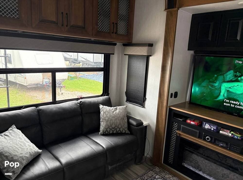 The rear living area features items like a flip-and-fold sleeper sofa, power theater seating, a large LED TV, plus a fireplace.