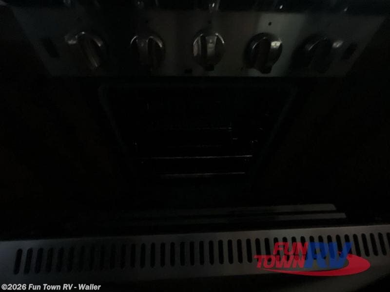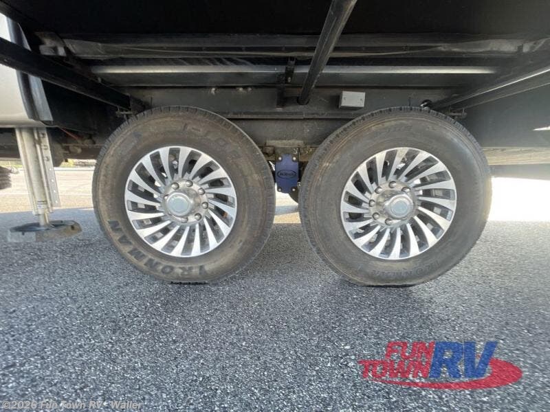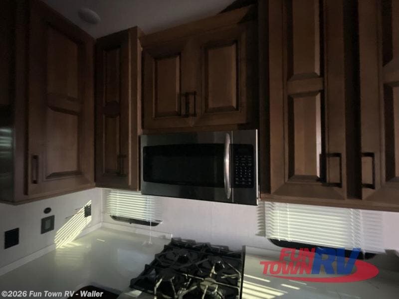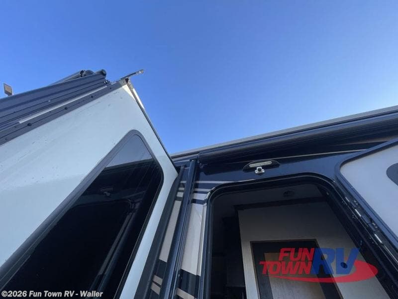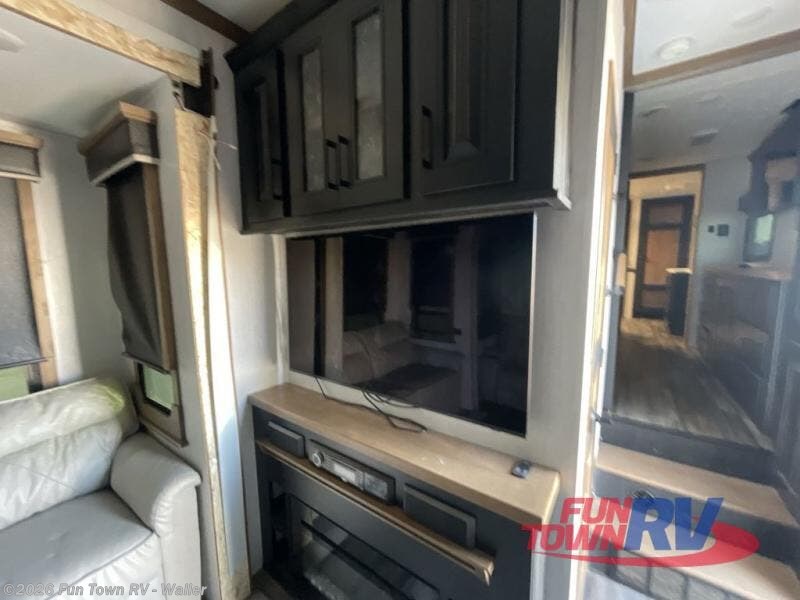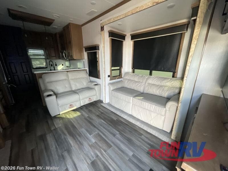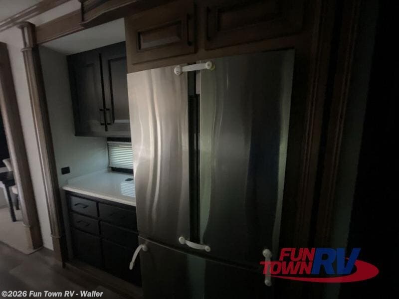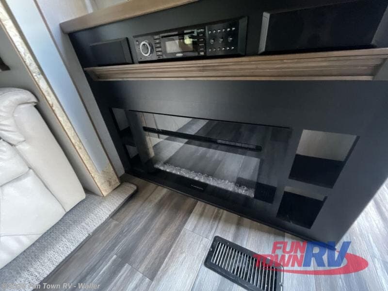 Life will be easier at the campground with a bath and a half in this fifth wheel! The front full bathroom has a shower with a seat to freshen up in each morning, a front walk-in closet to keep your clothes looking nice, and an area prepped to add an optional washer and dryer, plus it creates a master suite with a tilting king bed slide. Inside the rear kitchen is in-house milled and finished solid surface countertops, an in-wall double oven, a residential refrigerator with water and ice, and a residential size farmhouse stainless steel sink with butcher block cutting board sink cover for easier meal prepping. Relax in true comfort each night in the middle living area with a sofa slide and theater seating across from entertainment center with a 5,100 BTU fireplace!
