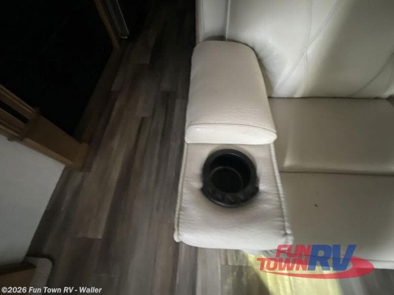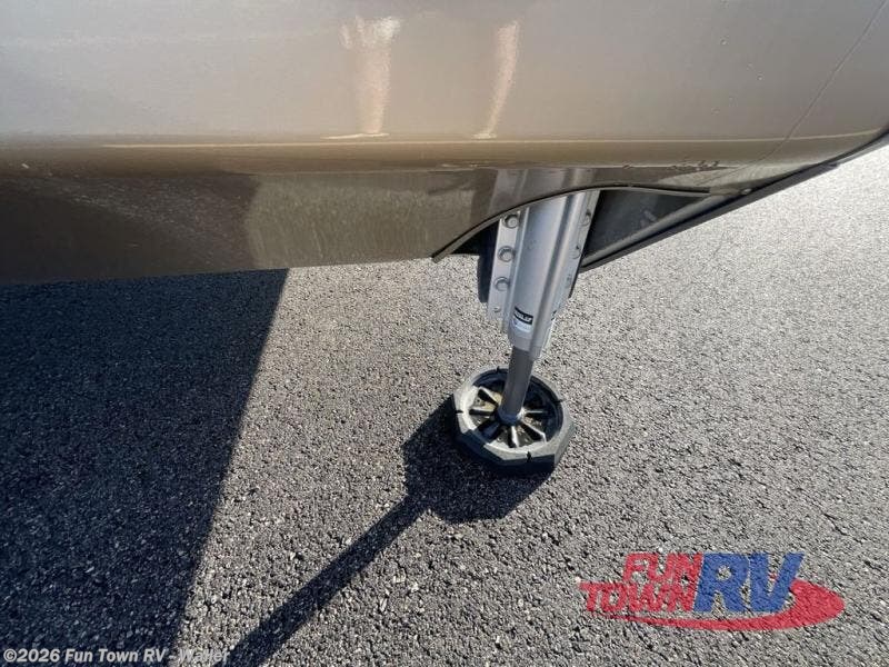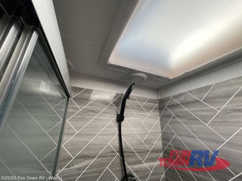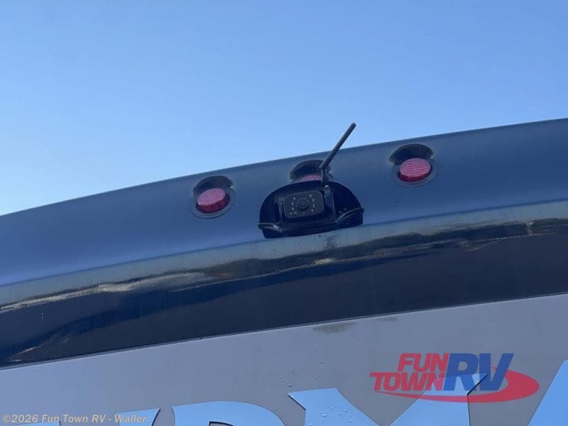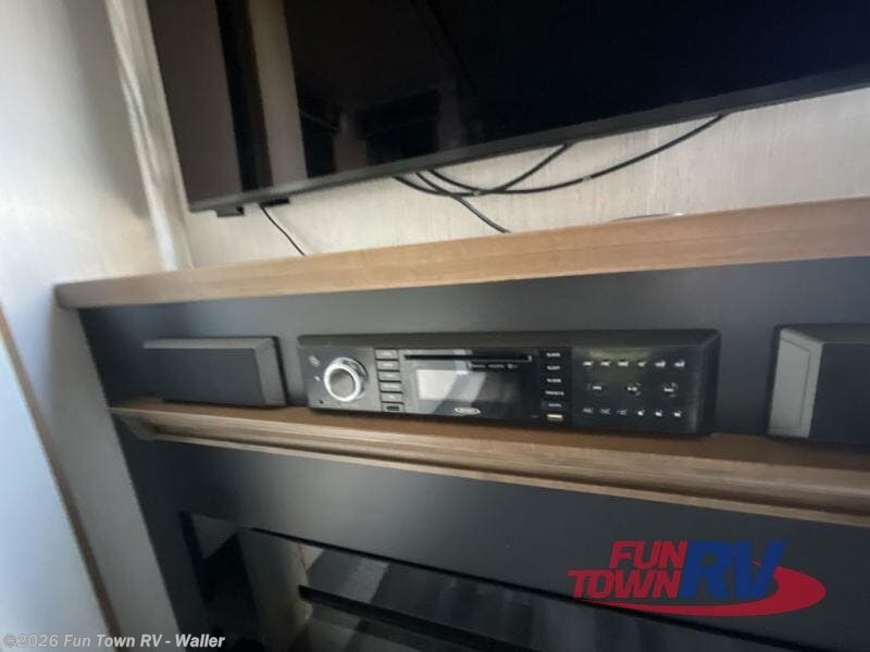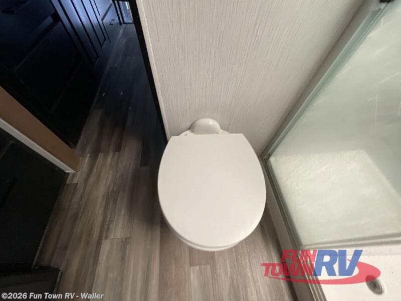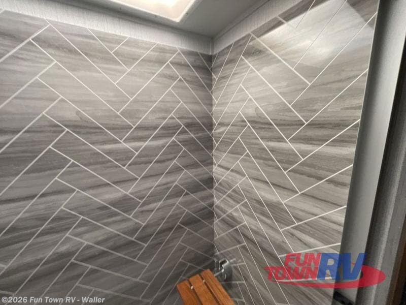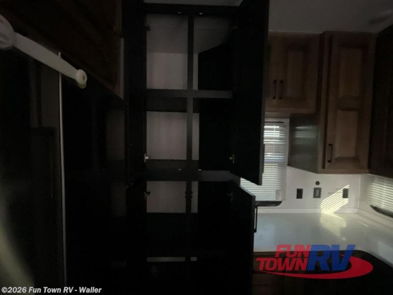 Life will be easier at the campground with a bath and a half in this fifth wheel! The front full bathroom has a shower with a seat to freshen up in each morning, a front walk-in closet to keep your clothes looking nice, and an area prepped to add an optional washer and dryer, plus it creates a master suite with a tilting king bed slide. Inside the rear kitchen is in-house milled and finished solid surface countertops, an in-wall double oven, a residential refrigerator with water and ice, and a residential size farmhouse stainless steel sink with butcher block cutting board sink cover for easier meal prepping. Relax in true comfort each night in the middle living area with a sofa slide and theater seating across from entertainment center with a 5,100 BTU fireplace!