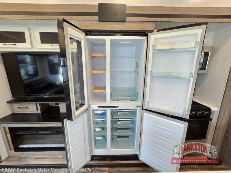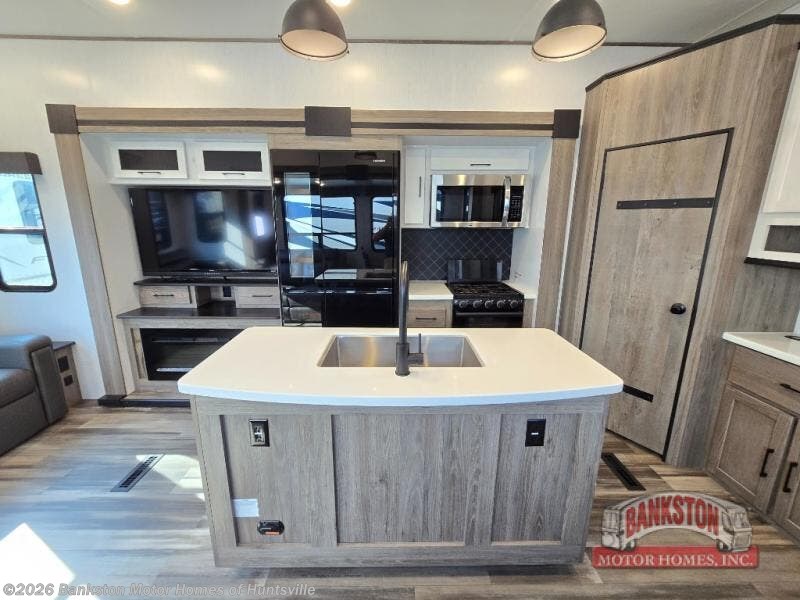 You can make many memories with this Milestone fifth wheel! There is an accommodating kitchen that offers you a residential refrigerator with wine cooler, a large corner pantry, a 30" over-the-range microwave, and a 21" large RV oven. The entertainment center holds a 50" TV with integrated sound bar so that you can enjoy a movie or two, and there is comfortable seating with the two sofas. One of the sofas even has foot rests in front to help you relax. The free-standing table with chairs will give you a place to eat your meals, and you can use the exterior camp kitchen to create meals when you want to remain outdoors.