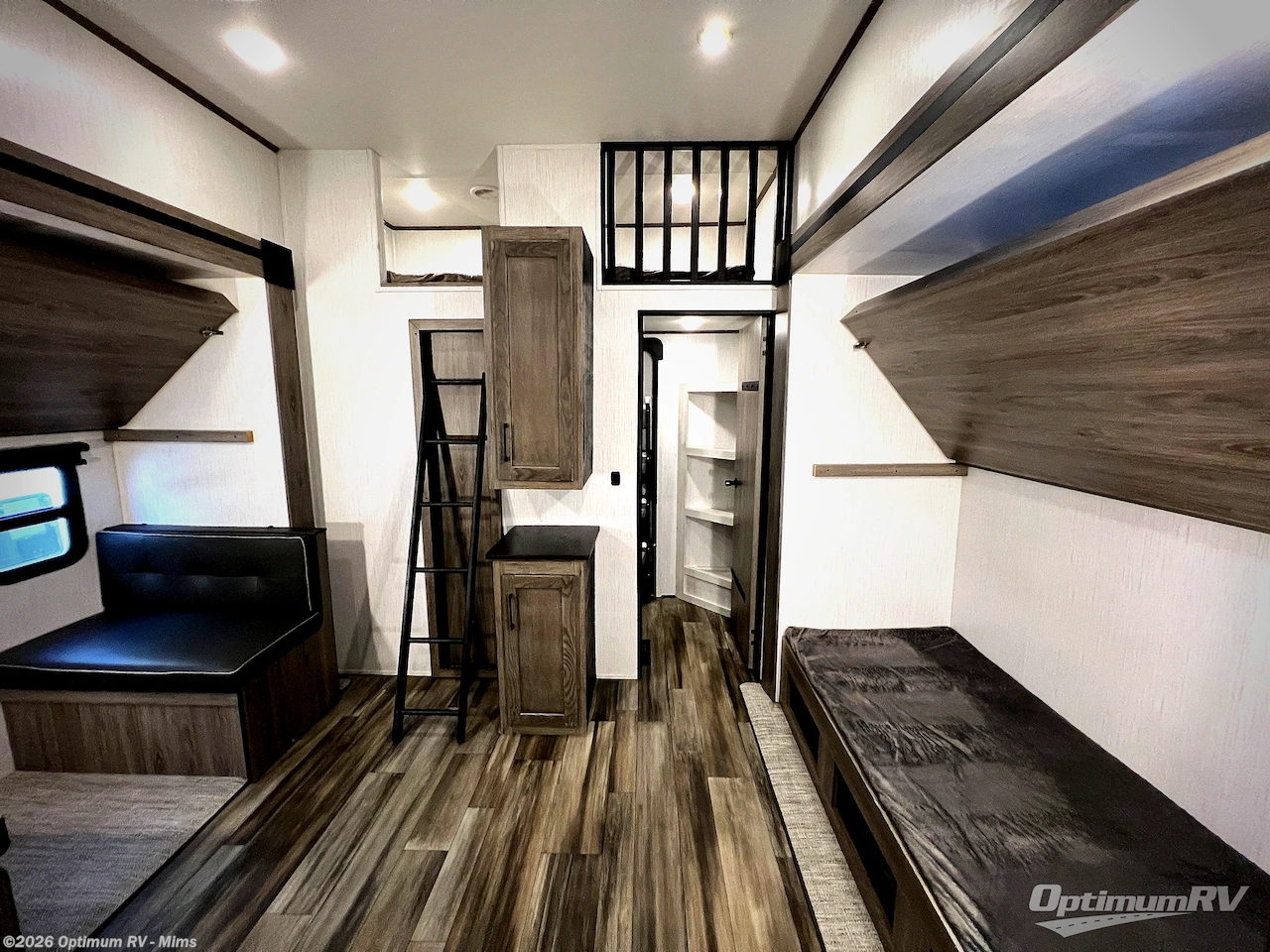 Live with no regrets in this Milestone fifth wheel! You will have a private bedroom all to yourself, and the rest of your group can occupy the rear bunkhouse suite which offers its own full bathroom, a set of bunk beds on a slide out, a loft with ladder, and another slide out with a flip-up bunk above a dinette. The main living area has a large slide that holds the sofa, refrigerator, and pantry, and you can easily watch the 50" TV from the comfort of the sofa. The front bedroom contains a full-size wardrobe that has space prepped for a washer/dryer, so you'll have plenty of room for your clothes.