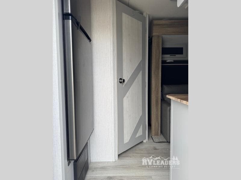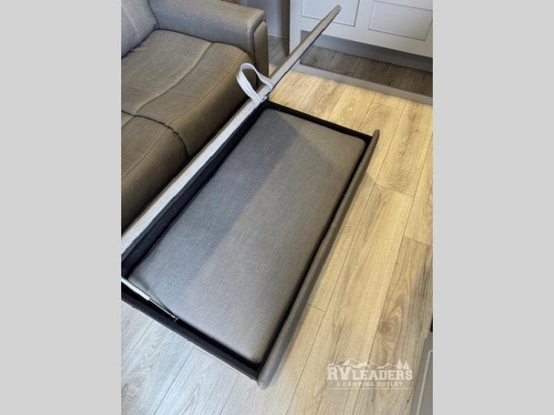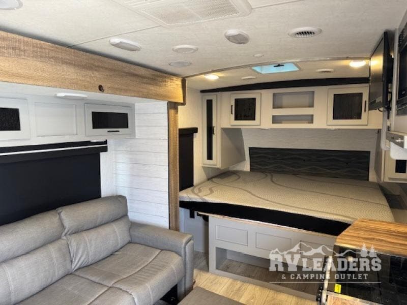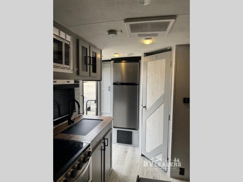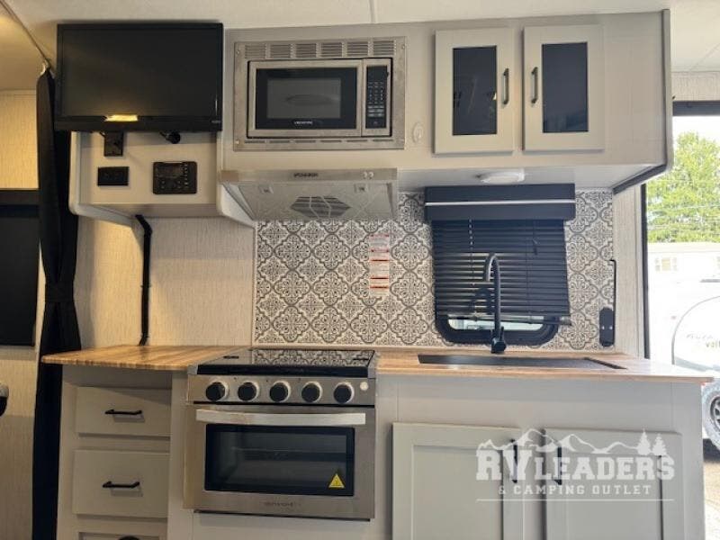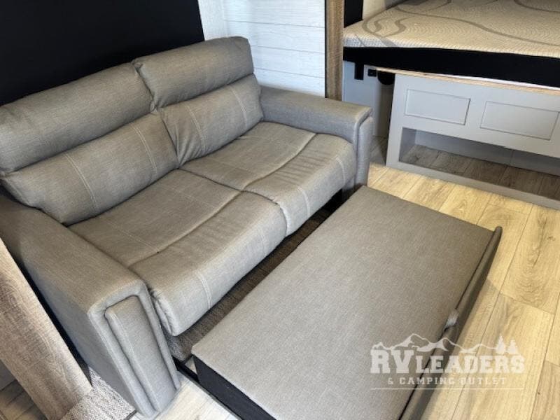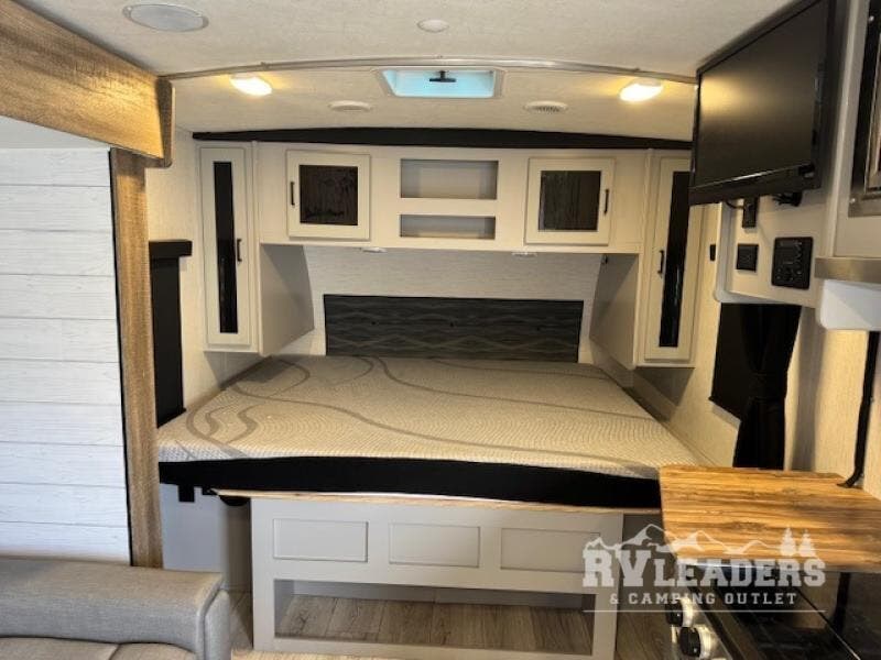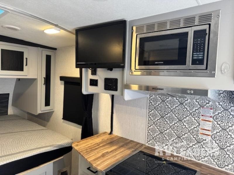 This is the perfect couple's trailer for your weekend excursions. You will love having your own king bed up front that also includes a privacy curtain. The sofa with a table will provide a place to dine at each day, and an overnight guest can sleep here as well. You'll find a three burner cooktop and a microwave oven in the kitchen, as well as a stainless steel sink and a pantry for snacks. After dinner, head outdoors to relax under the 12' power awning LED lights before turning in for the night.