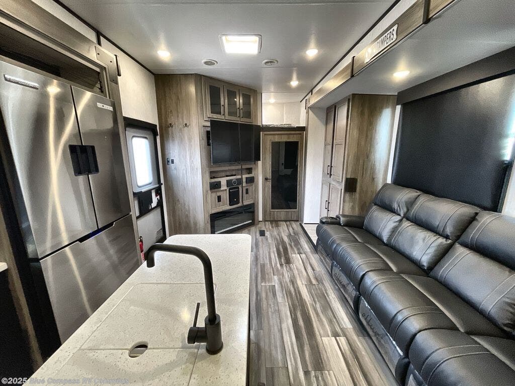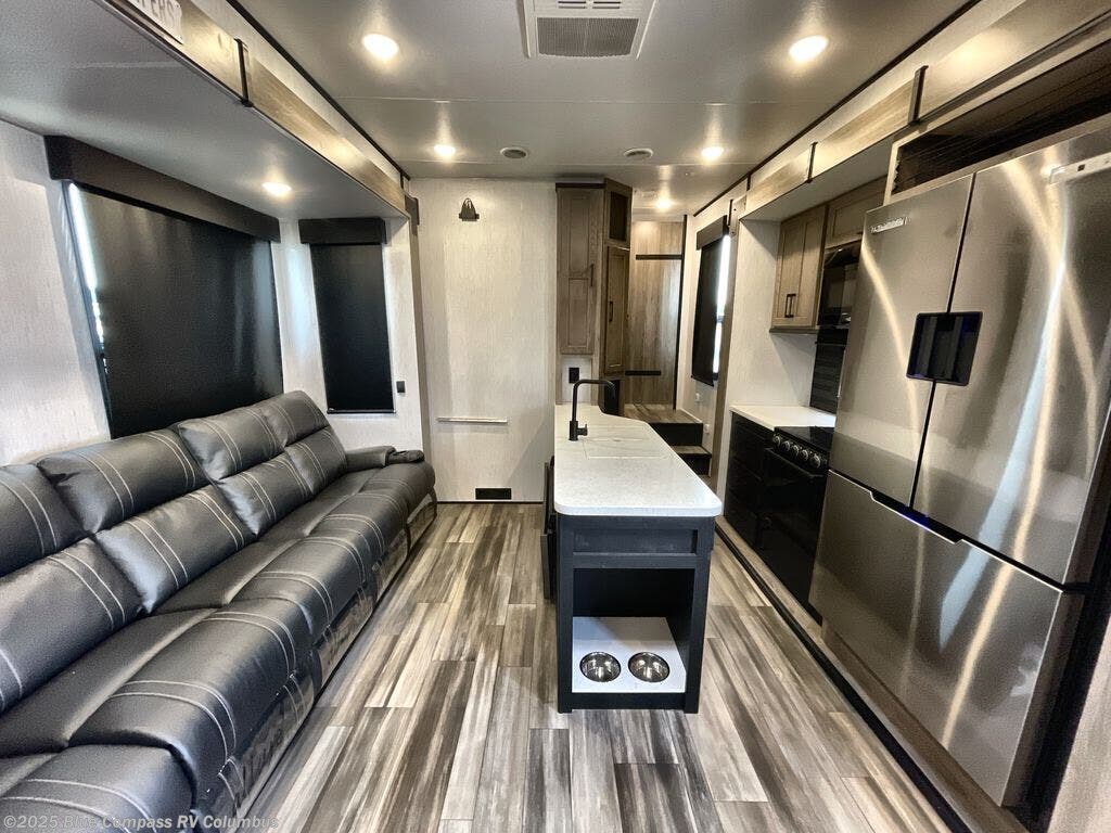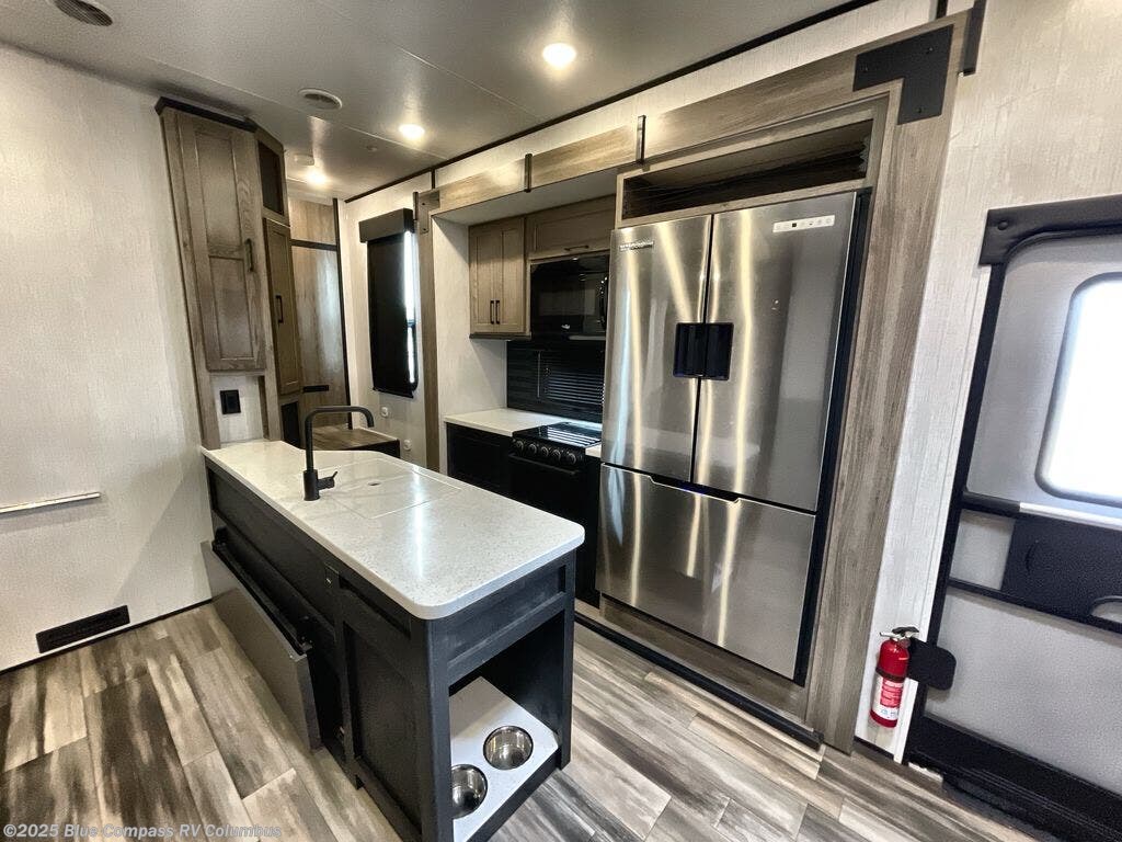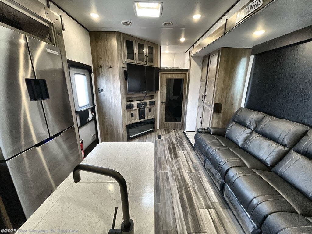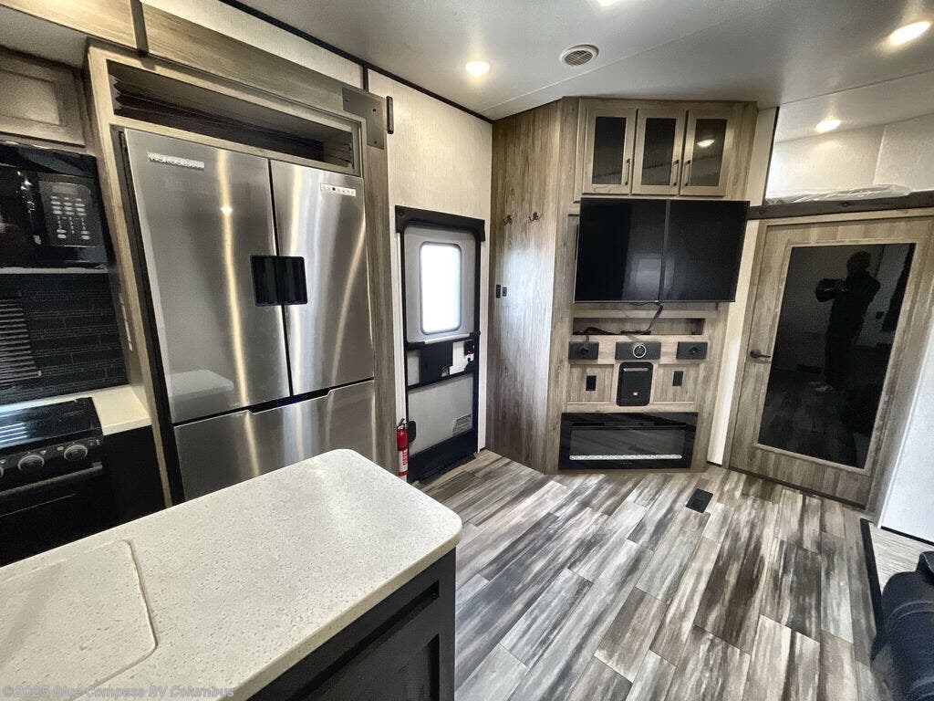 It's time to seek adventure and stay in luxury in this fifth wheel that allows you to bring along your toys be it mountain bikes, motorcycles and/or an ATV! After easily loading up the ramp door into 13'8" of garage space, you can head out. You will appreciate having dual entry for easy access to your toys and the main living and kitchen area, plus having a half bath in the garage is super convenient. You might even like to add the electric queen bed-split bench seat/bed option for more dining and sleeping space. Relax inside the main area on the large sofa and dine at the drop down dinette with flip-up bench. The cook will have full kitchen amenities to make meals, plus a peninsula counter with as sink to prepare and serve meals. The full bathroom has double access, and the front bedroom offers a king bed, plus a slide out with a wardrobe and dresser for more floor space and storage. And the 30 gallon fuel station with a second 30 gallon aux tank will keep the fun going!