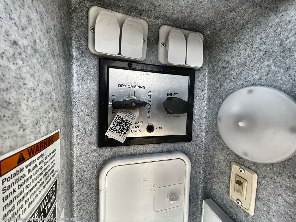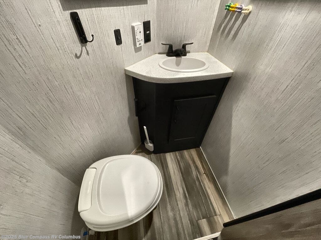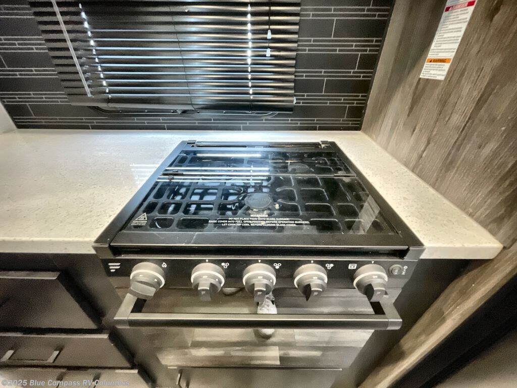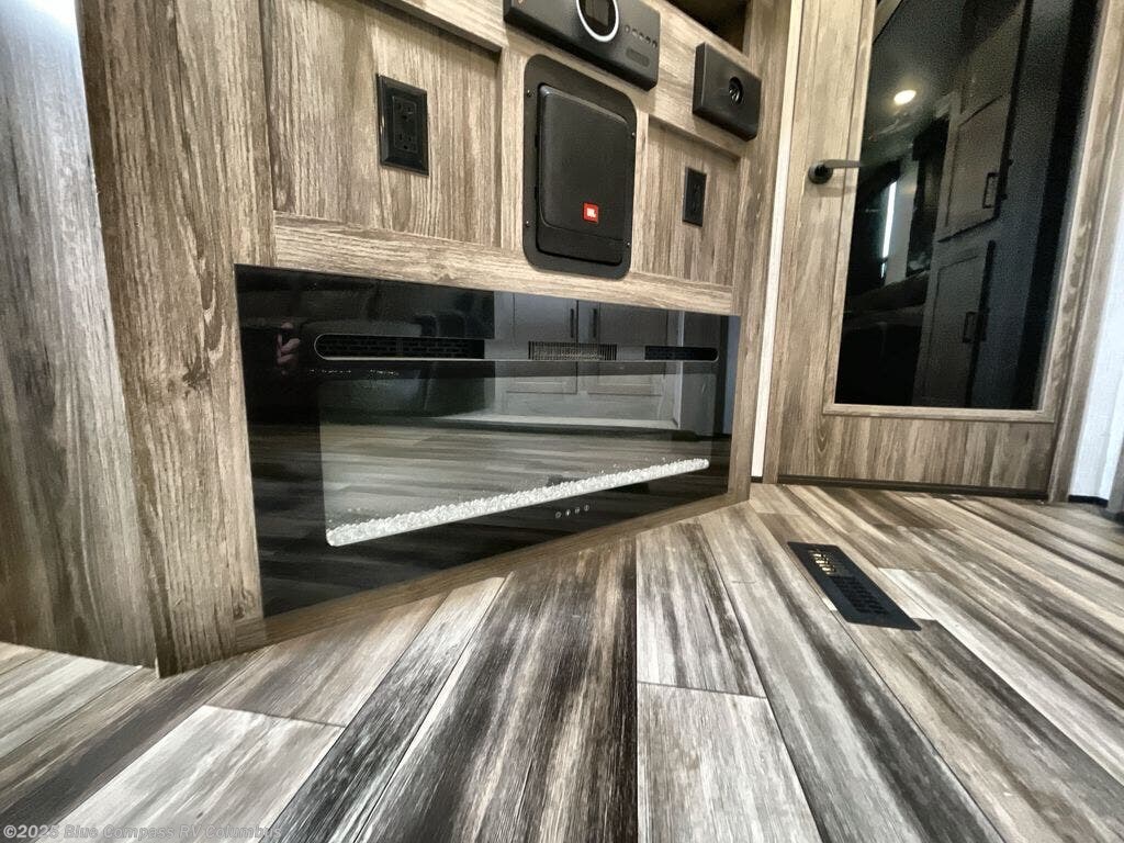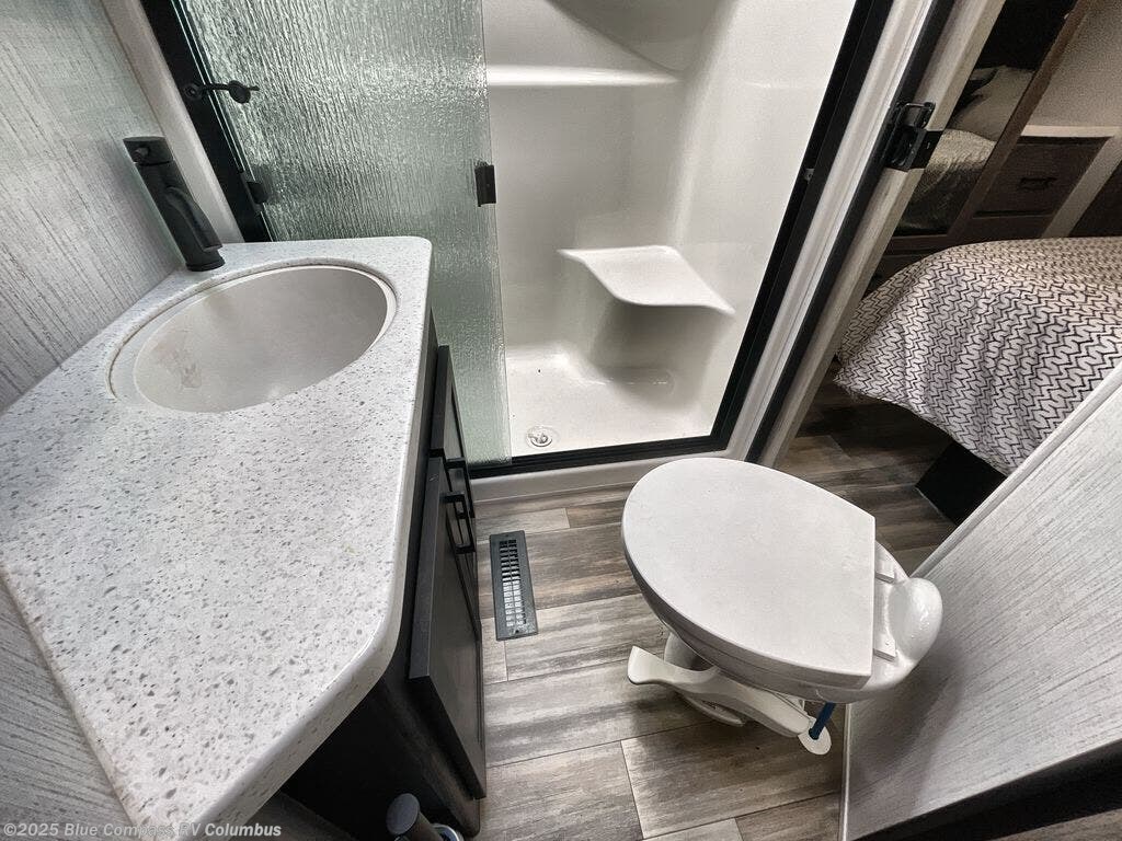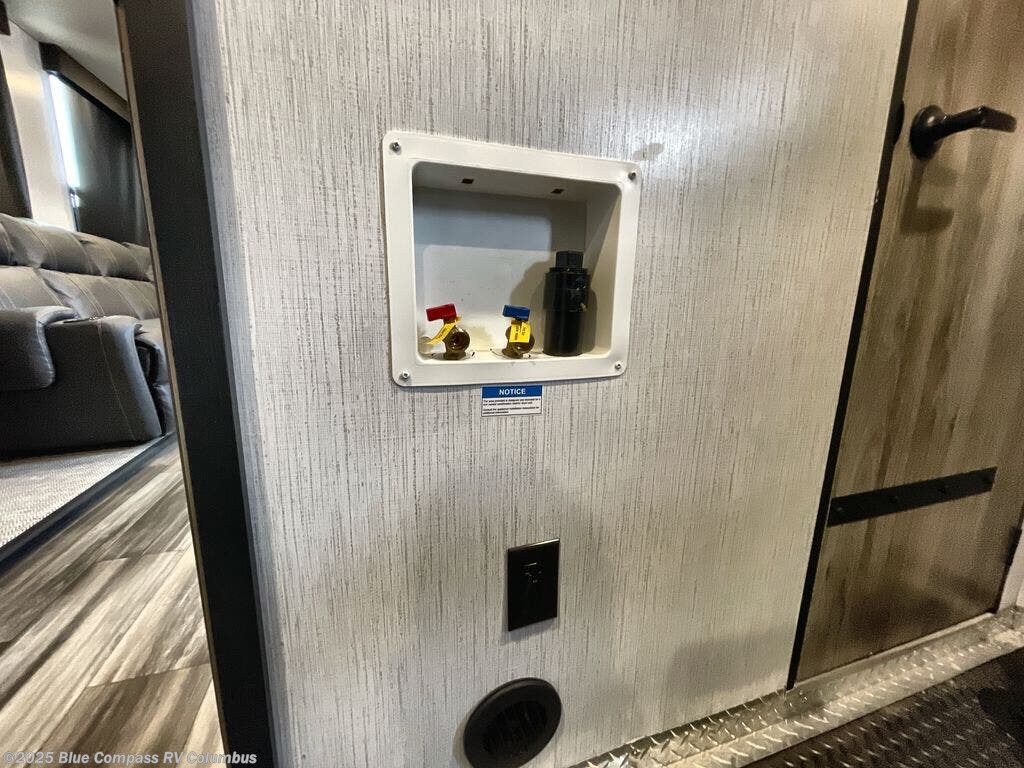 It's time to seek adventure and stay in luxury in this fifth wheel that allows you to bring along your toys be it mountain bikes, motorcycles and/or an ATV! After easily loading up the ramp door into 13'8" of garage space, you can head out. You will appreciate having dual entry for easy access to your toys and the main living and kitchen area, plus having a half bath in the garage is super convenient. You might even like to add the electric queen bed-split bench seat/bed option for more dining and sleeping space. Relax inside the main area on the large sofa and dine at the drop down dinette with flip-up bench. The cook will have full kitchen amenities to make meals, plus a peninsula counter with as sink to prepare and serve meals. The full bathroom has double access, and the front bedroom offers a king bed, plus a slide out with a wardrobe and dresser for more floor space and storage. And the 30 gallon fuel station with a second 30 gallon aux tank will keep the fun going!