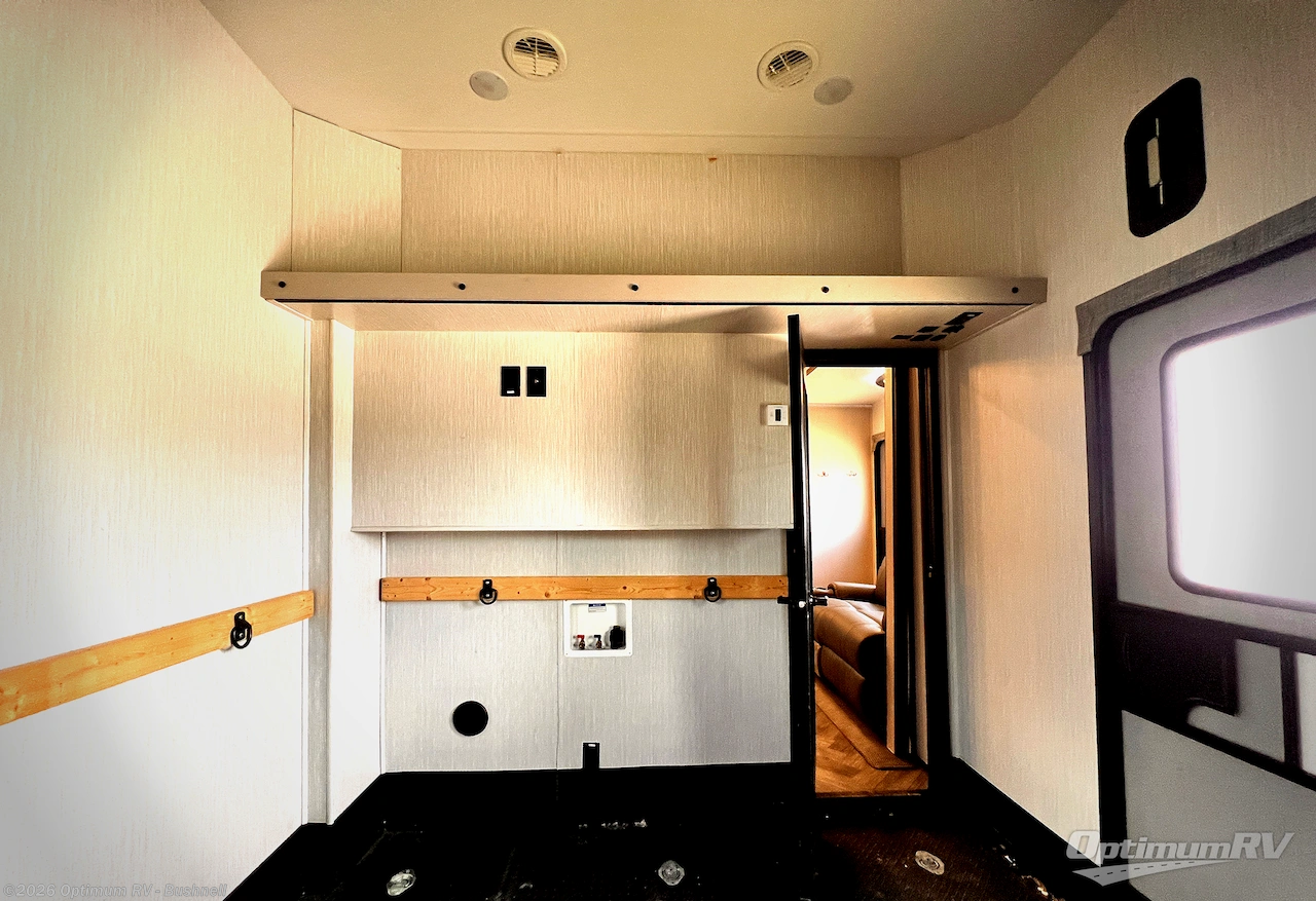 Pack your bags and load up your toys into the 11' 1" garage area of this toy hauler! Once you have arrived, you can set up the optional electric queen bed with split bench seating below it. As you enter one of the dual entry doors, you will see the fully equipped kitchen and living area which has a theater seating and a L-shaped sofa slide across from the TV prepped area. After a fun day on the trails, clean the mud out of your hair in the dual entry bathroom with the spacious bathtub with skylight above for added natural lighting, plus it leads directly into the front master suite. Inside the bedroom is a tilting king bed slide, a front closet, and a TV prepped area to watch your favorite movies in true comfort!