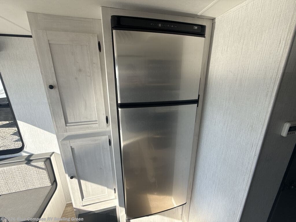 Head to your favorite campground with your favorite person in this travel trailer! The front queen bed has under-bed storage for more blankets and since there are wireless cell charging stations you don't have to worry about bringing your chargers. Freshen up each morning in the full bathroom with the ABS tub/shower surround with a skylight above to bring the outdoors inside. Keep your bellies full with a three burner cooktop and 10 cu. ft. stainless steel refrigerator, and the rear U-shaped dinette offers a comfortable place to eat meals, play games, and even transform into an extra sleeping space for a guest or two to tag along!