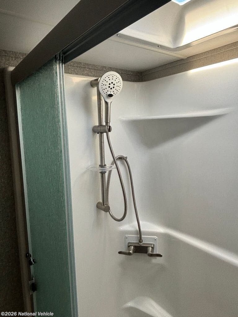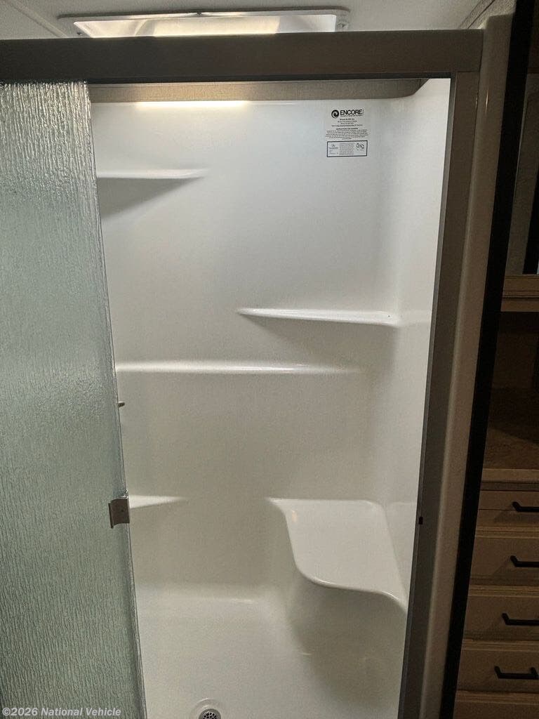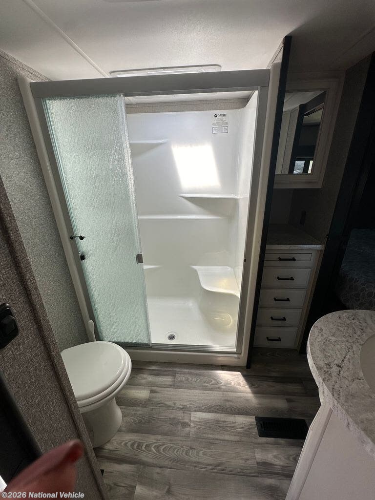 The spacious bathroom includes a large shower with glass enclosure, vanity with storage, porcelain toilet, and linen cabinet?providing everyday comfort wherever the road takes you.