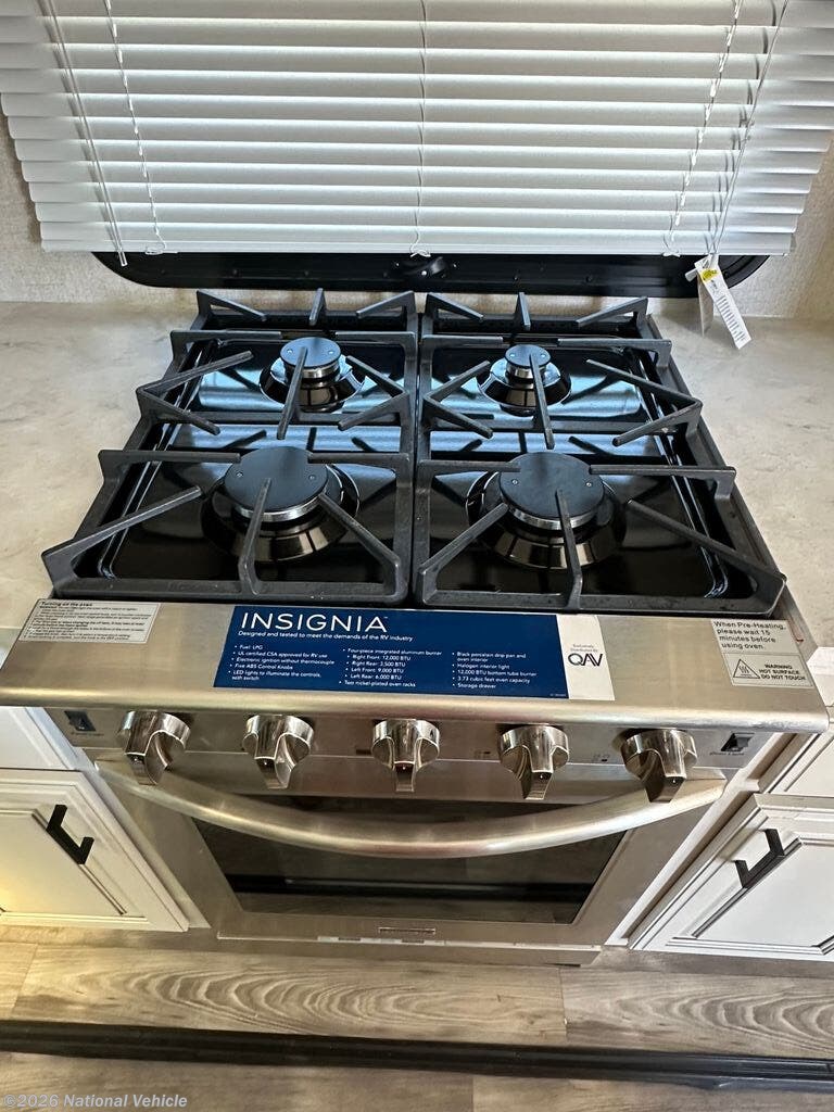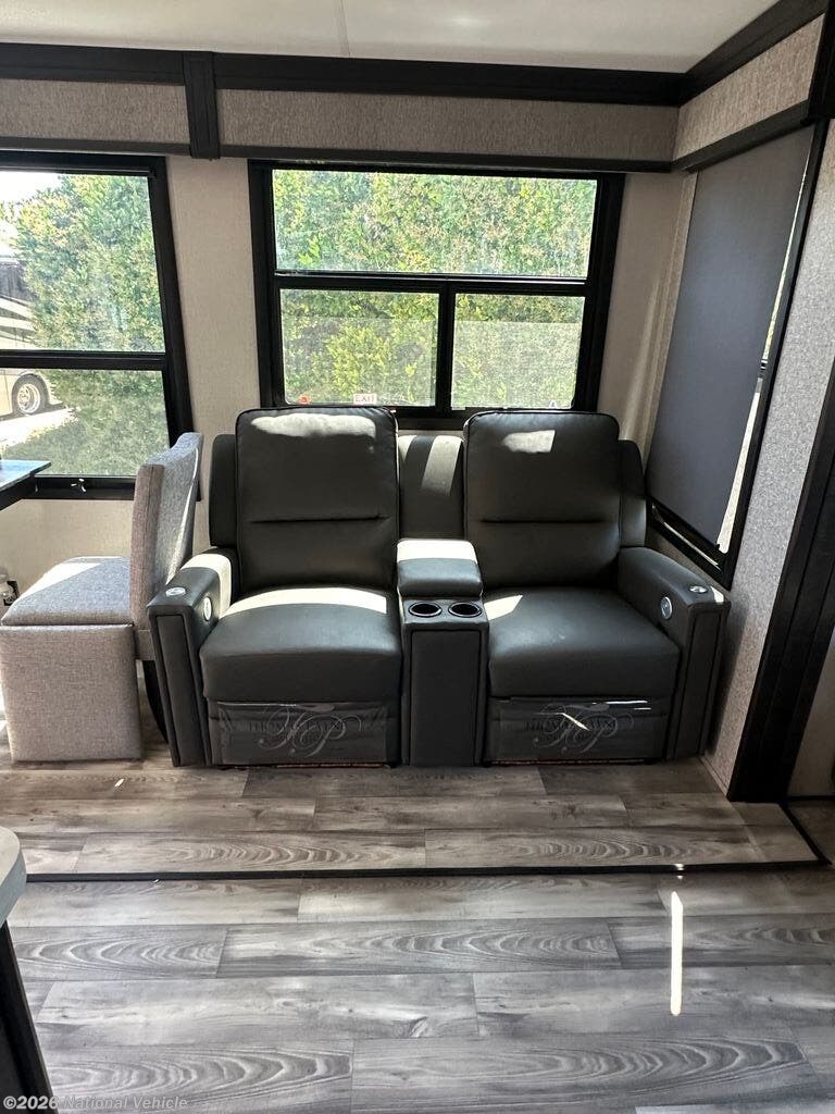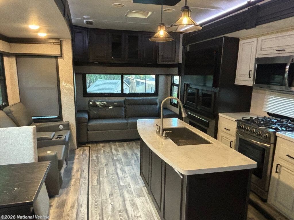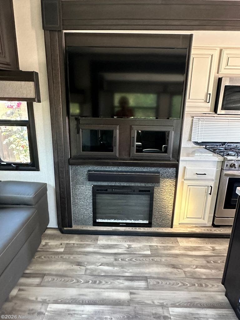 The 314RLS features a wide-open rear living area with opposing slide-outs that create an inviting space for relaxing or entertaining. Large panoramic windows provide natural light and scenic views, while theater seating and a tri-fold sofa offer comfortable accommodations for guests. An entertainment center with fireplace adds warmth and a true residential feel.