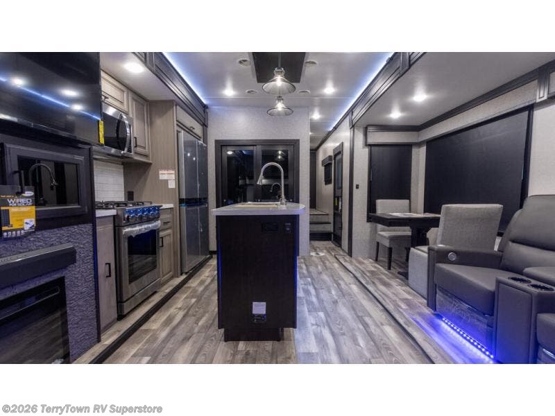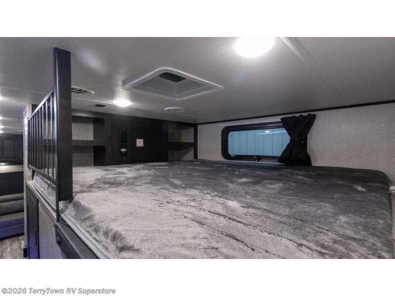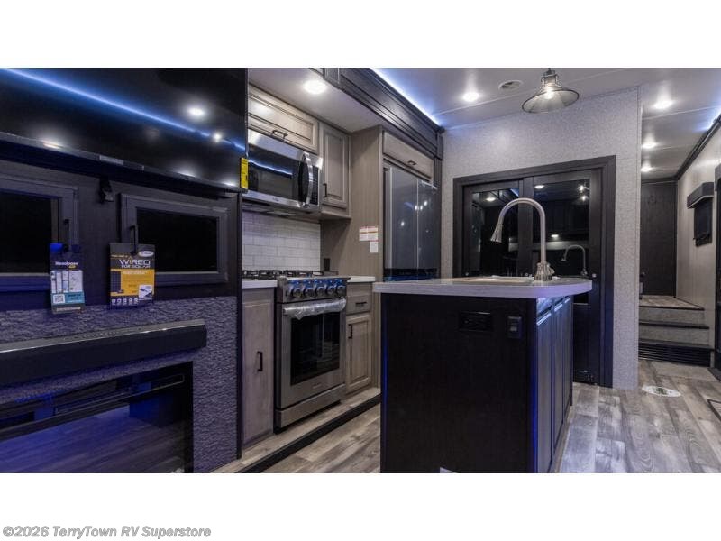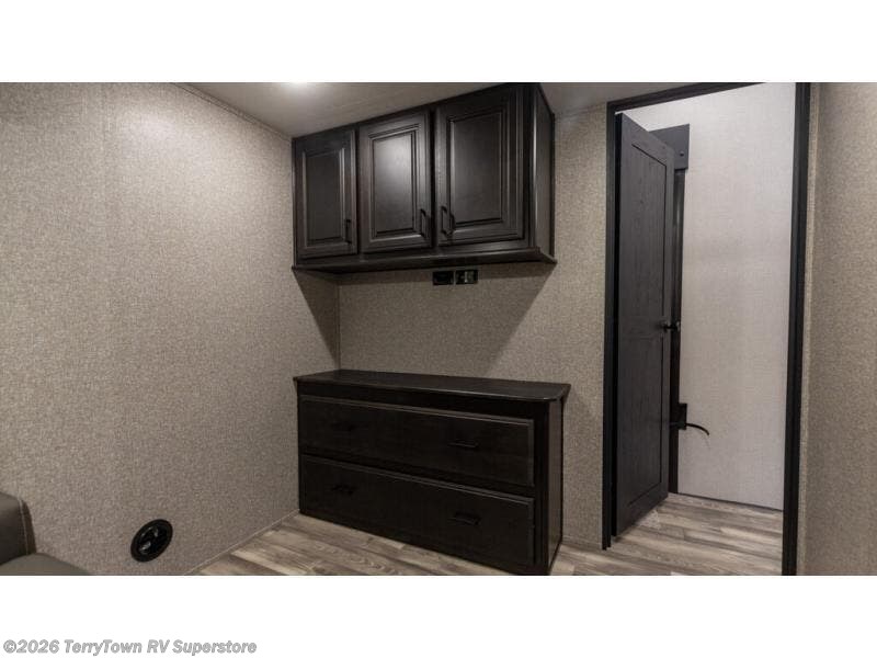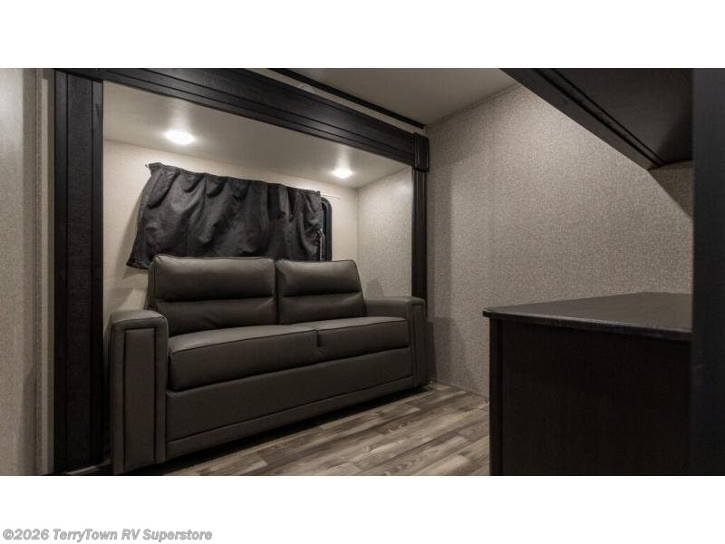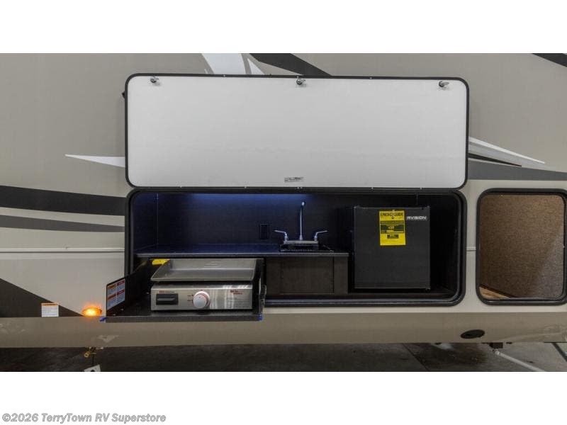 Make this fifth wheel your office on wheels thanks to the extra room that can be utilized as an office, a living area or even a bedroom thanks to the bi-fold sofa slide and all the storage, plus there is a loft above for sleeping space and/or storage! The dual entry bathroom not only has a medicine cabinet, a closet, and overhead cabinets above the sink, but also an entrance that leads directly into the front private bedroom. Inside the bedroom there is a queen bed slide across from a dresser with a desk and a front wardrobe that is prepped to add an optional washer and dryer. The chef can choose to cook either indoors with the four burner cooktop and kitchen island or head to the outside kitchen to grill up some burgers on the griddle. Plus, there is a BBQ hookup and an outside TV hookup so you can watch the big game at the same time if you add those optional features!
