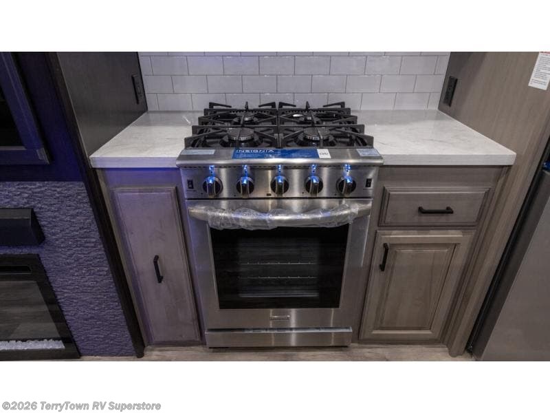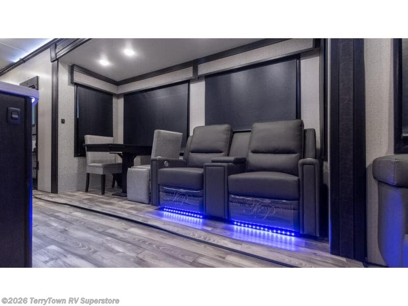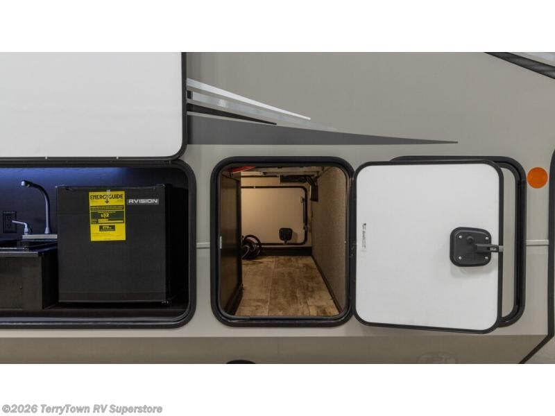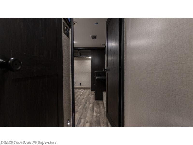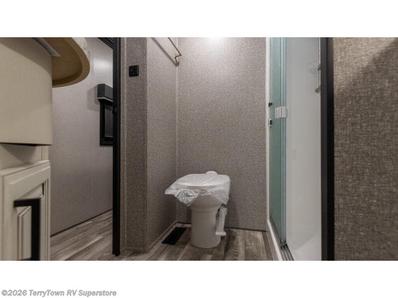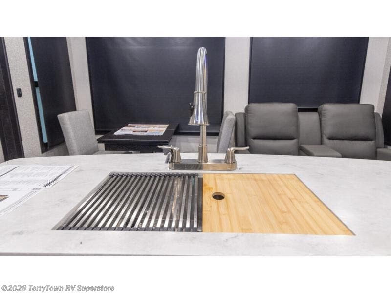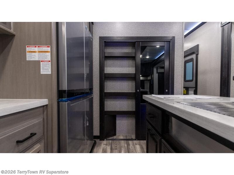 Make this fifth wheel your office on wheels thanks to the extra room that can be utilized as an office, a living area or even a bedroom thanks to the bi-fold sofa slide and all the storage, plus there is a loft above for sleeping space and/or storage! The dual entry bathroom not only has a medicine cabinet, a closet, and overhead cabinets above the sink, but also an entrance that leads directly into the front private bedroom. Inside the bedroom there is a queen bed slide across from a dresser with a desk and a front wardrobe that is prepped to add an optional washer and dryer. The chef can choose to cook either indoors with the four burner cooktop and kitchen island or head to the outside kitchen to grill up some burgers on the griddle. Plus, there is a BBQ hookup and an outside TV hookup so you can watch the big game at the same time if you add those optional features!