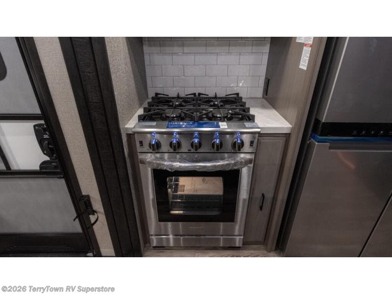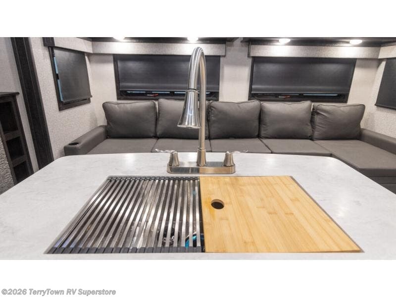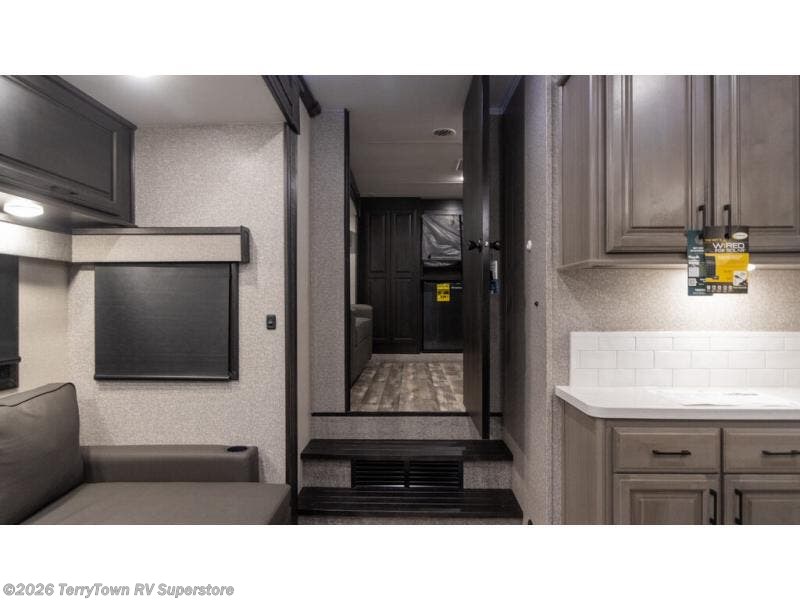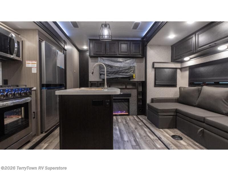 You will have everything you could need for movie night in this fifth wheel! The front separate living area is unique in that it has a half bath attached, a fridge, a 40" TV, a dresser, dual wardrobes, plus opposing tri-fold sofa slides. You might even call this a bedroom, just depends how you utilize this space. If you don't feel like watching a movie then head to the U-lounge dinette slide in the kitchen area and enjoy the fireplace below the 50" TV. As you step up from the kitchen area to head to the front private bedroom, you will find the dual entry bathroom to the right where there is a radius shower and an area prepped to add an optional washer and dryer. After a fun-filled day, lay your head on the queen bed!