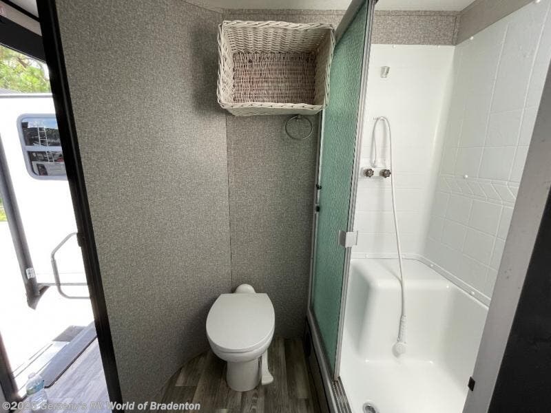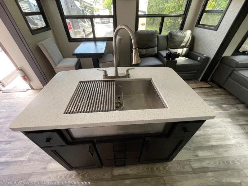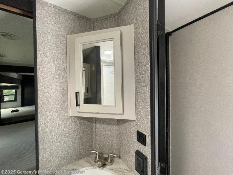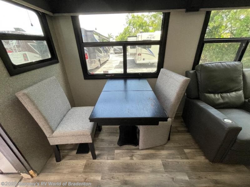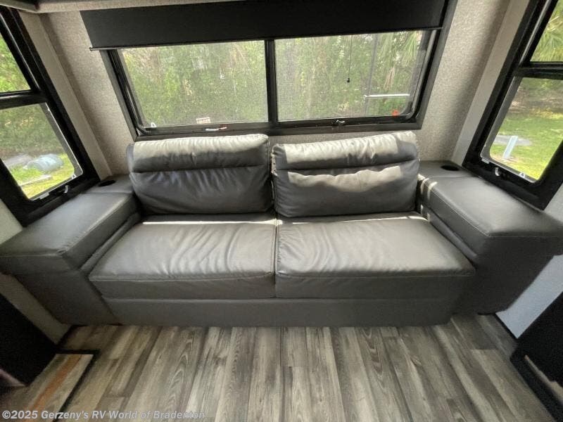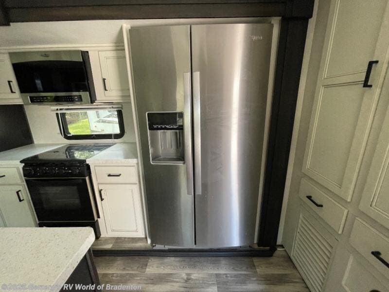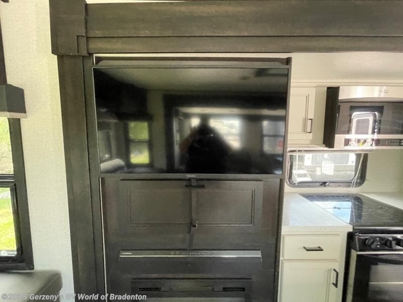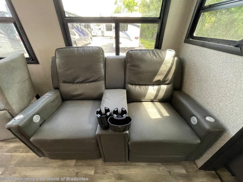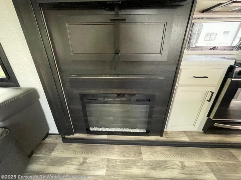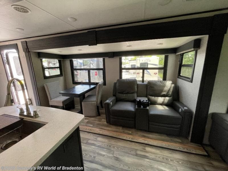 A couple will enjoy staying in this trailer whether it is full-time, part-time or for long weekends. The front master bedroom provides easy access to the double entry bathroom which is super convenient at night, a queen bed slide or choose the king option, a dresser with a window above, and a mirrored wardrobe, plus a wardrobe prepped for a washer/dryer option. The bathroom has everything you will need to stay clean and refreshed for the next activity as well as two medicine cabinets. The rear living area offers a tri-fold sofa with adjustable headrests to sit on while watching the 39" LED HDTV with fireplace below, and the theater seats are perfect for a movie night. You can dine, play games and work from the free standing table and chairs, and the kitchen amenities allow the cook to make meals for two or more!