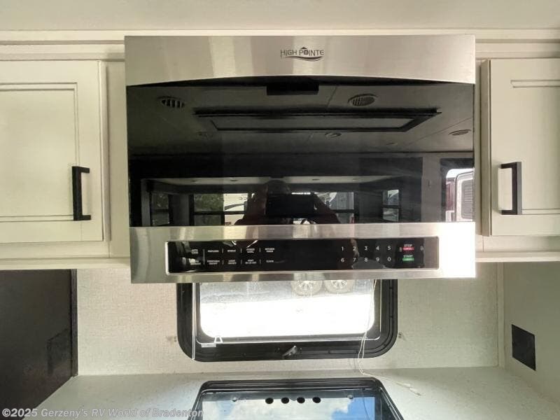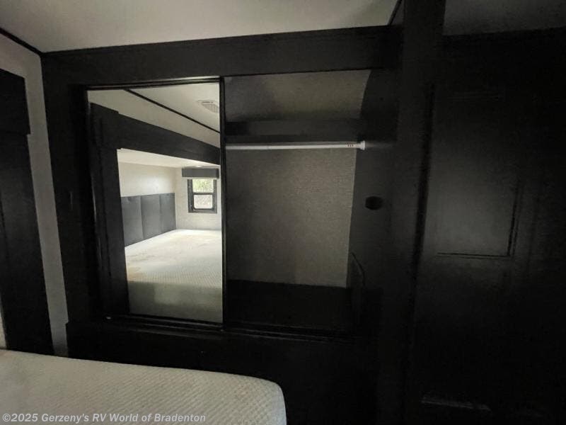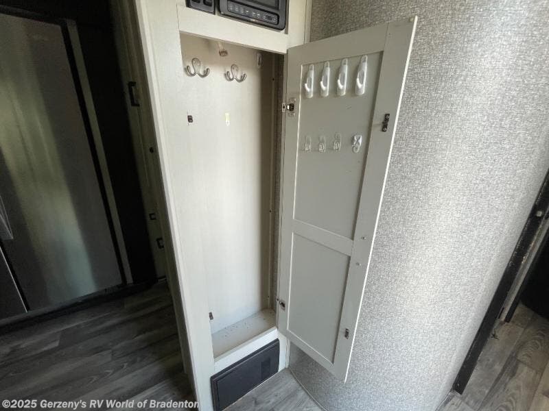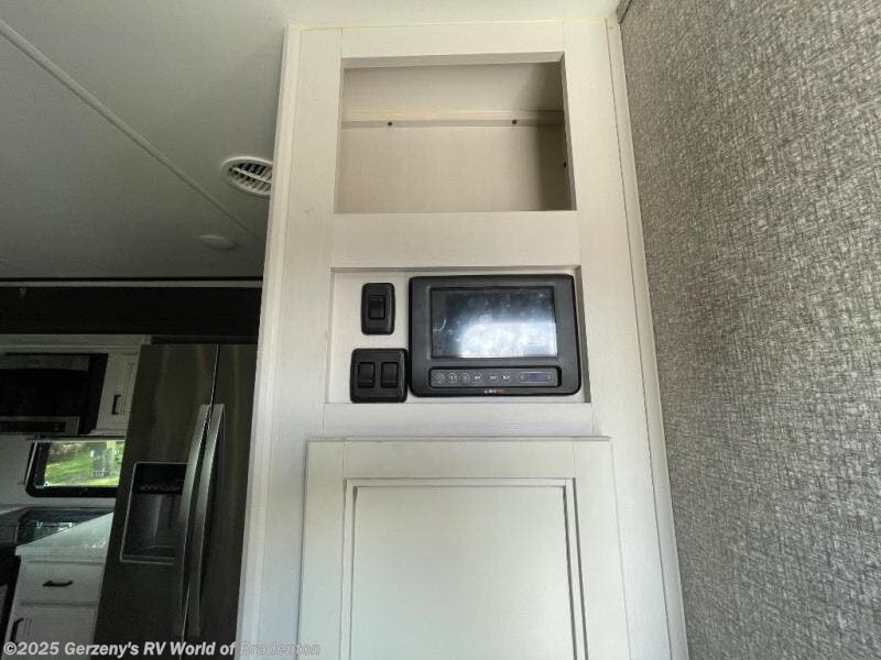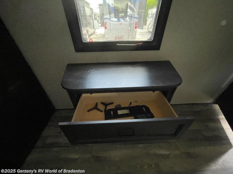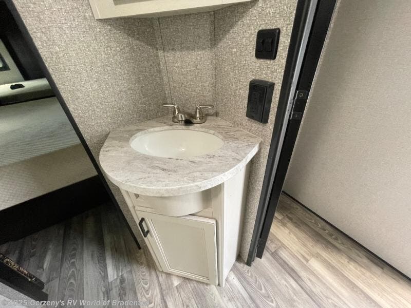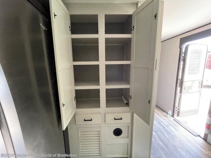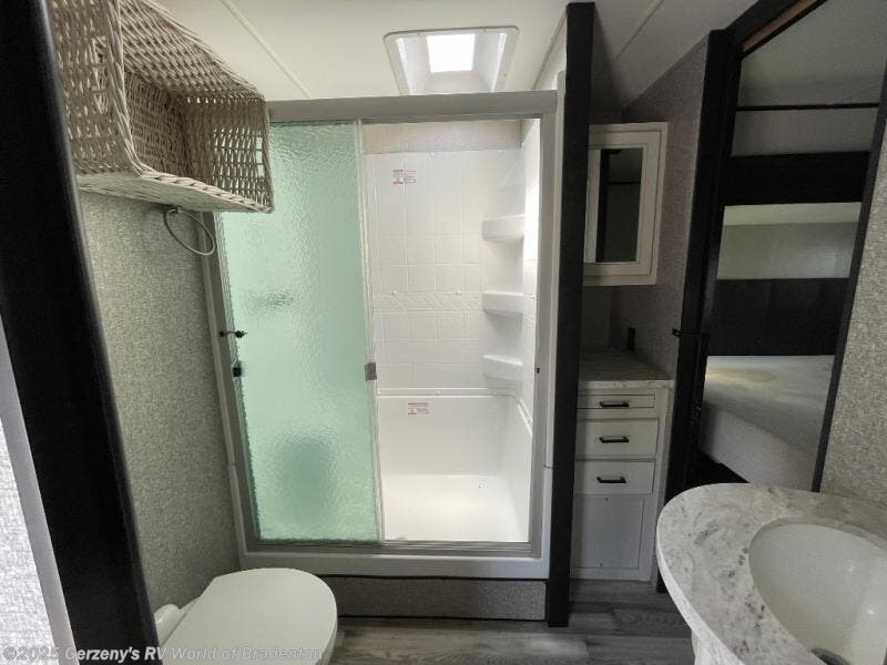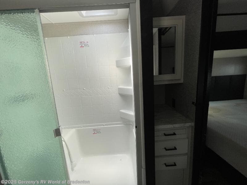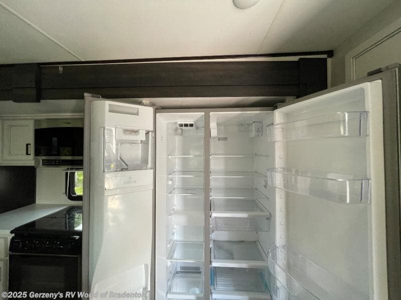 A couple will enjoy staying in this trailer whether it is full-time, part-time or for long weekends. The front master bedroom provides easy access to the double entry bathroom which is super convenient at night, a queen bed slide or choose the king option, a dresser with a window above, and a mirrored wardrobe, plus a wardrobe prepped for a washer/dryer option. The bathroom has everything you will need to stay clean and refreshed for the next activity as well as two medicine cabinets. The rear living area offers a tri-fold sofa with adjustable headrests to sit on while watching the 39" LED HDTV with fireplace below, and the theater seats are perfect for a movie night. You can dine, play games and work from the free standing table and chairs, and the kitchen amenities allow the cook to make meals for two or more!