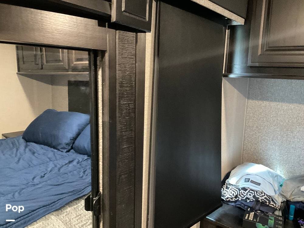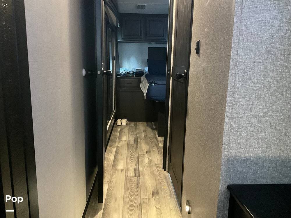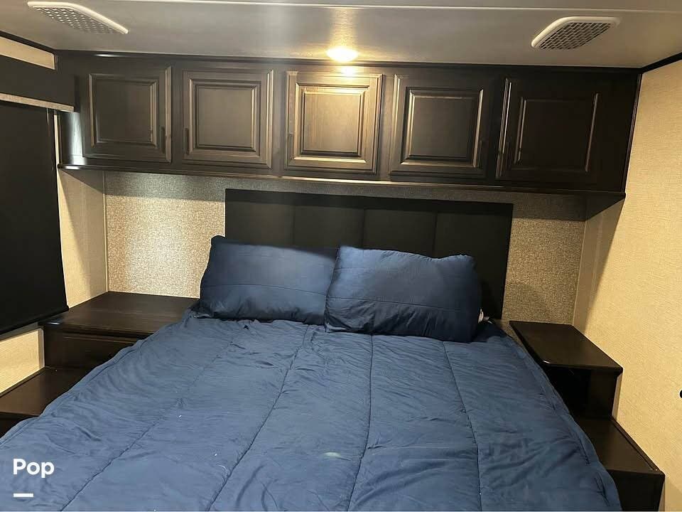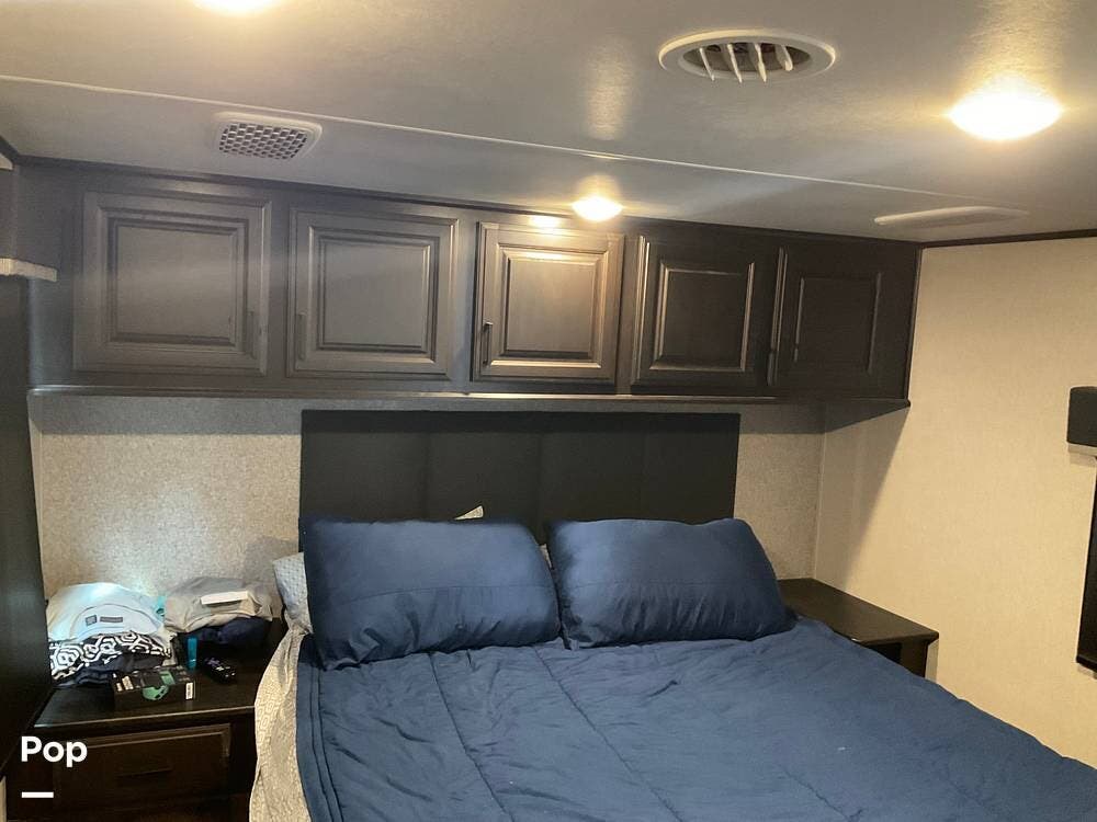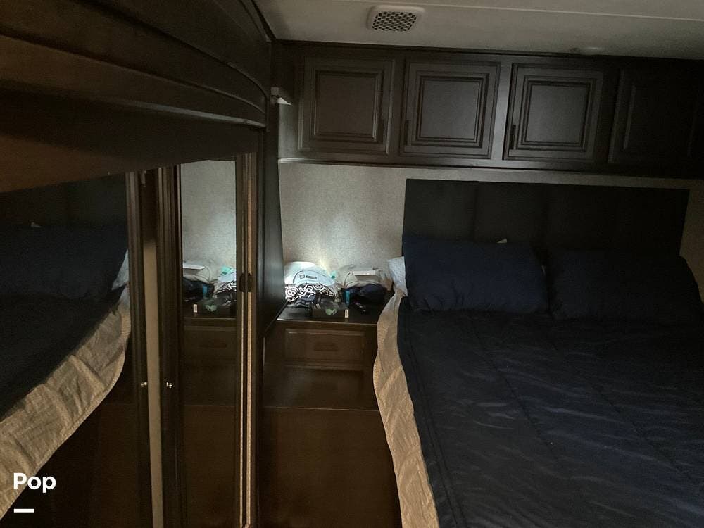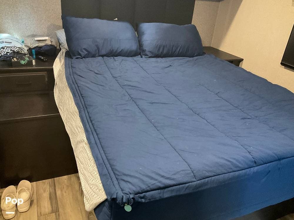 At the far end of the RV is the master bedroom, offering a queen-size bed, a large wardrobe, and its own private master bathroom for added comfort and convenience.