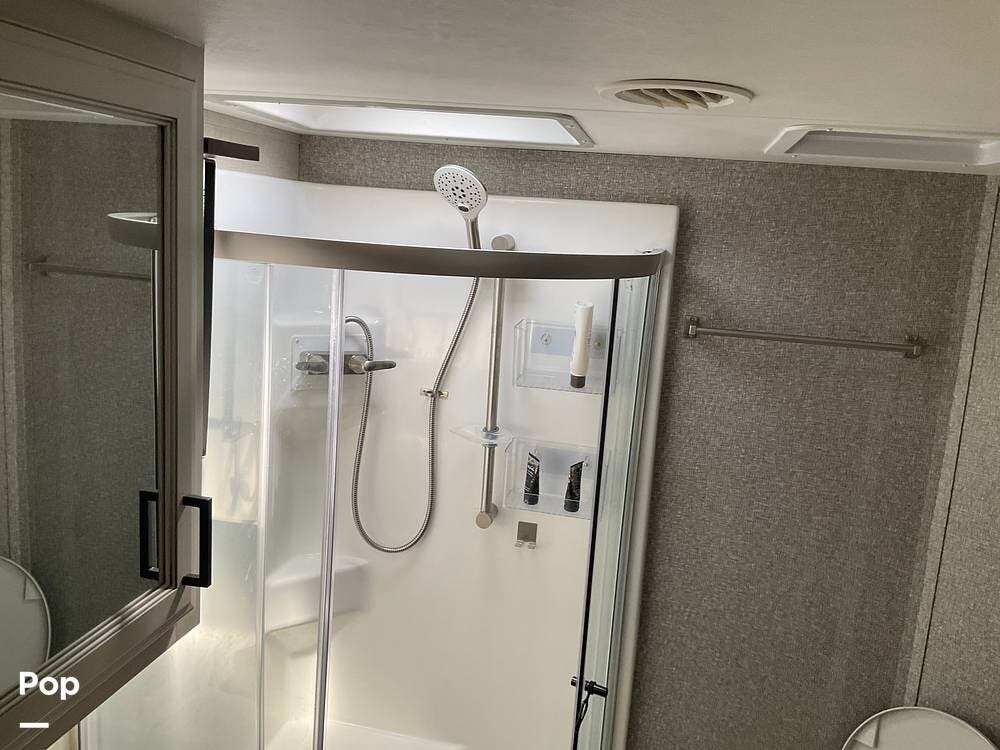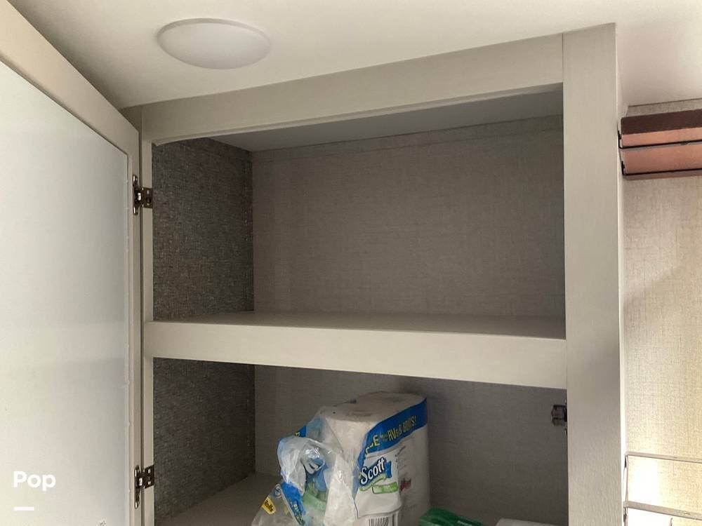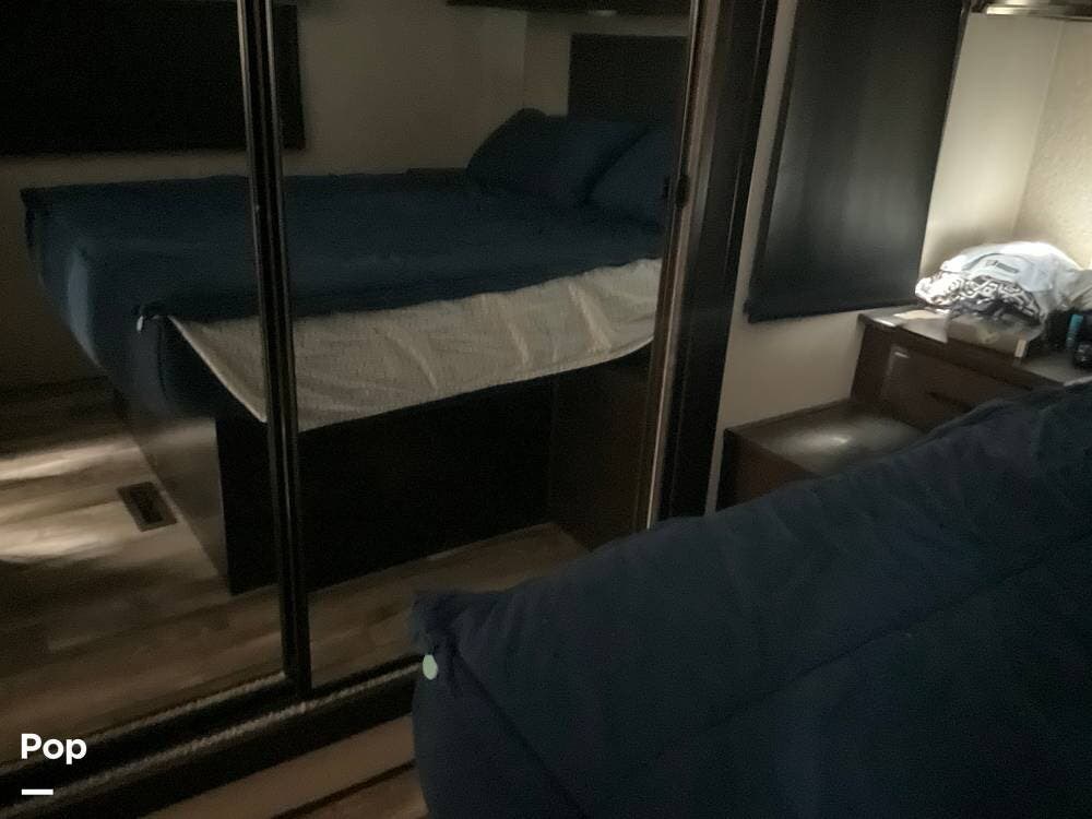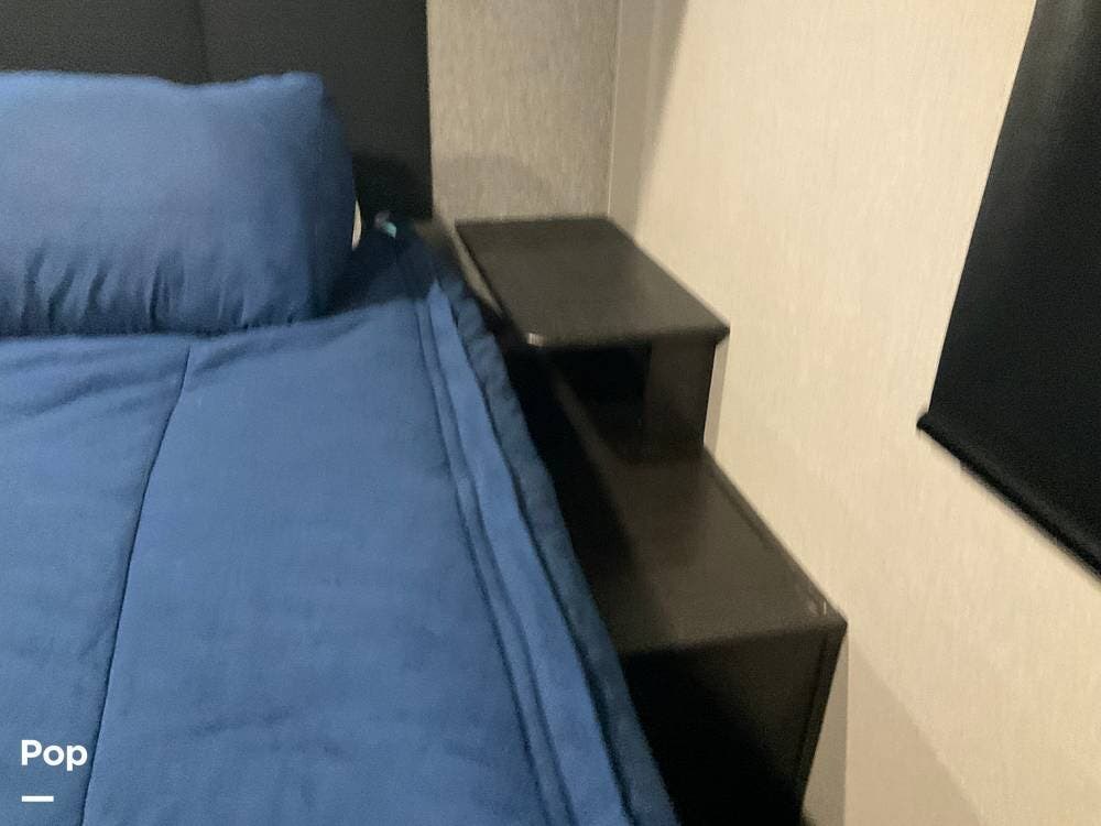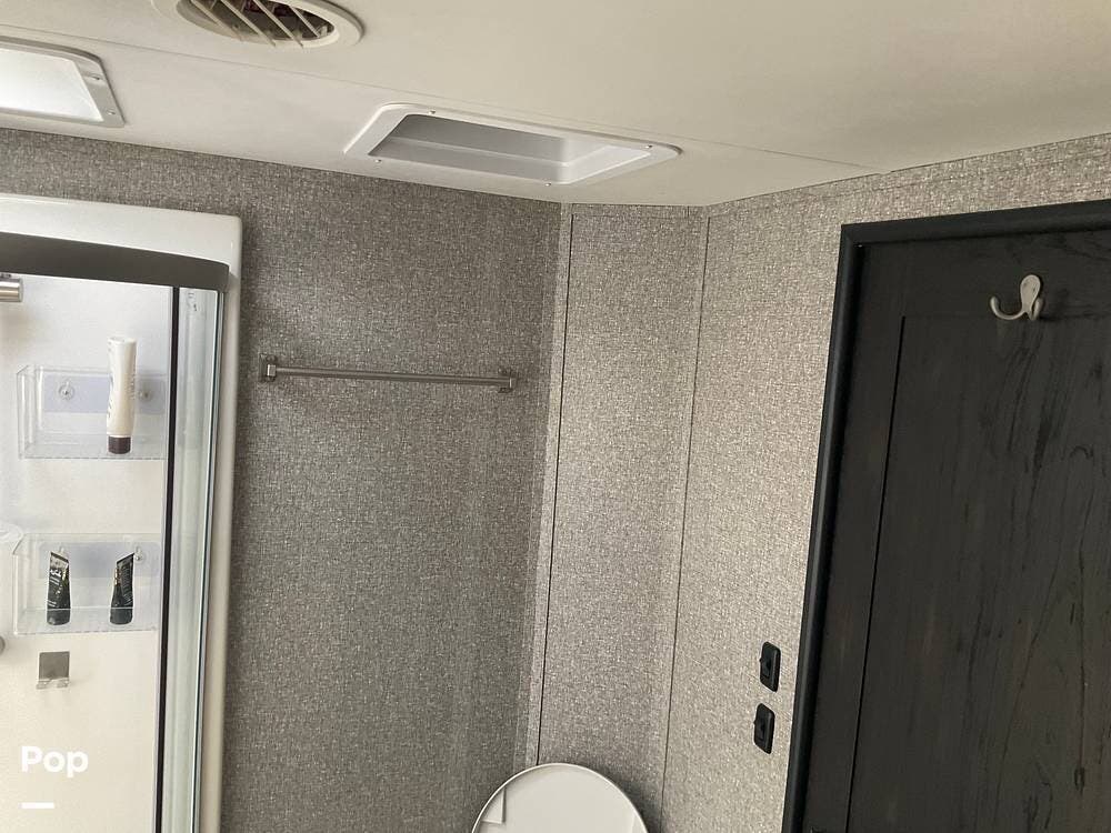 At the far end of the RV is the master bedroom, offering a queen-size bed, a large wardrobe, and its own private master bathroom for added comfort and convenience.