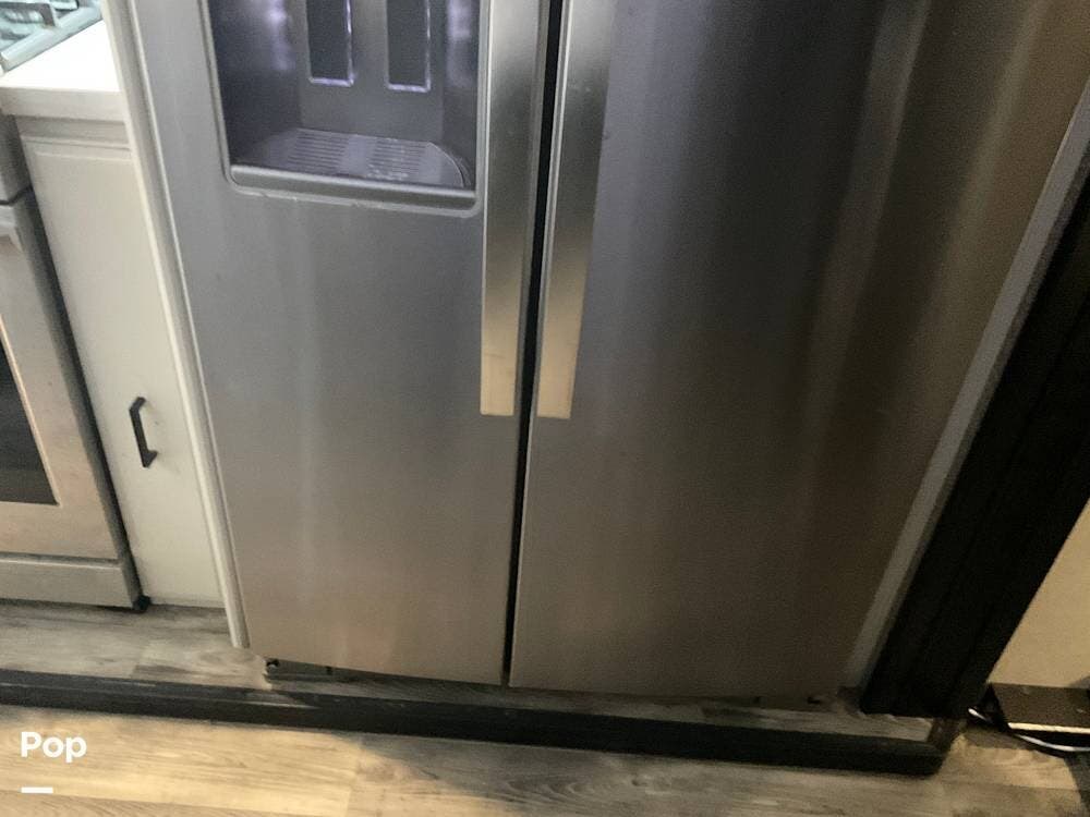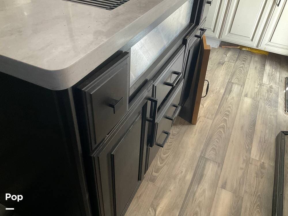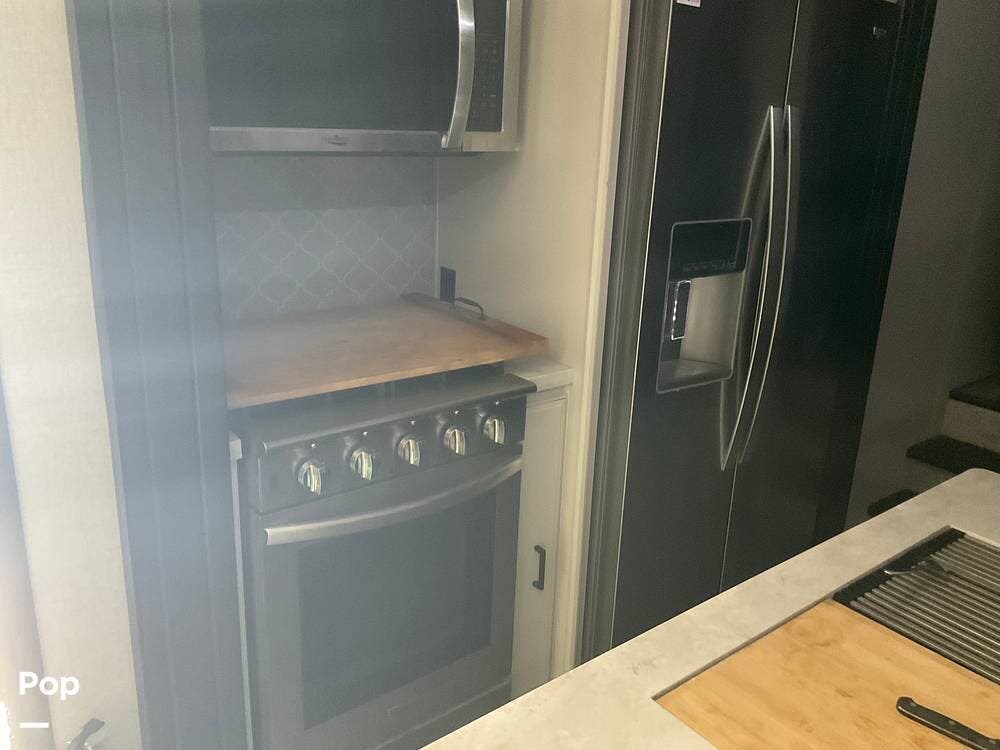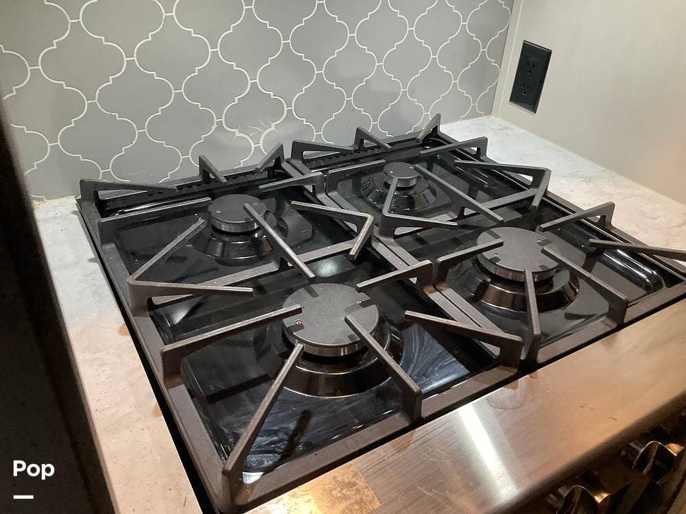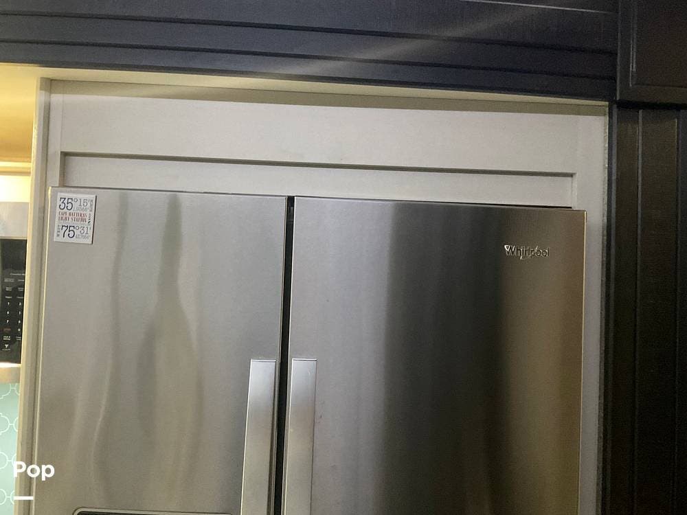 As you step inside this RV, you're welcomed into a well-appointed kitchen. To your right, there's a 21 cu. ft. refrigerator next to a four-burner stove with oven, with a microwave conveniently mounted above. At the center of the kitchen, you'll find a spacious sink, ample counter space, and generous storage.