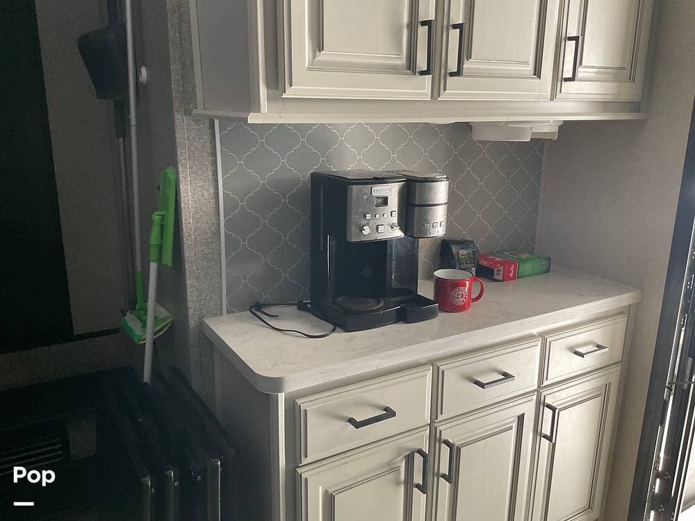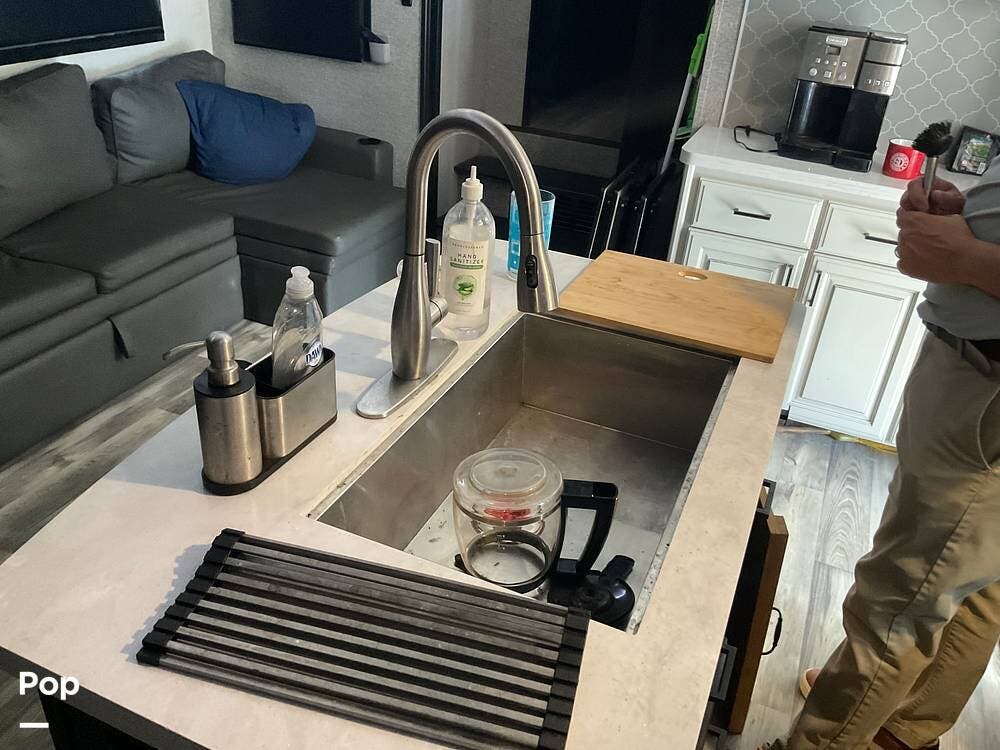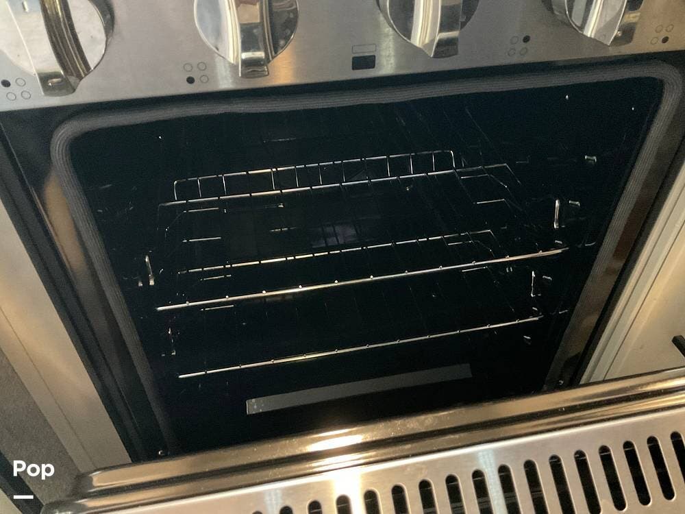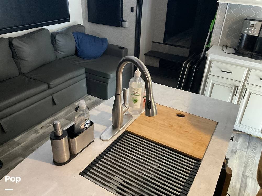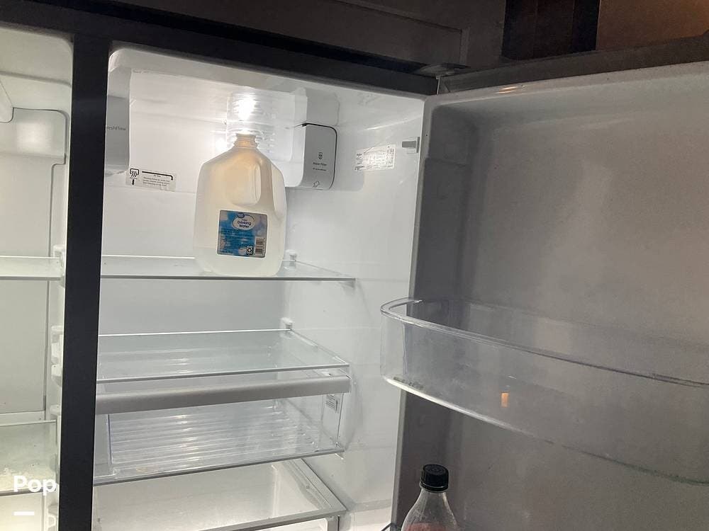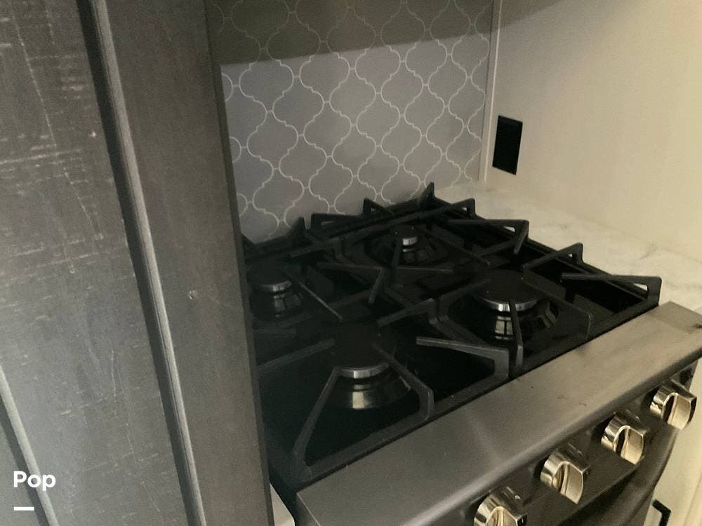 As you step inside this RV, you're welcomed into a well-appointed kitchen. To your right, there's a 21 cu. ft. refrigerator next to a four-burner stove with oven, with a microwave conveniently mounted above. At the center of the kitchen, you'll find a spacious sink, ample counter space, and generous storage.