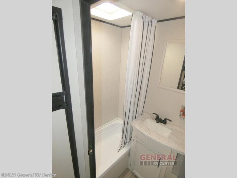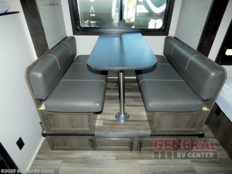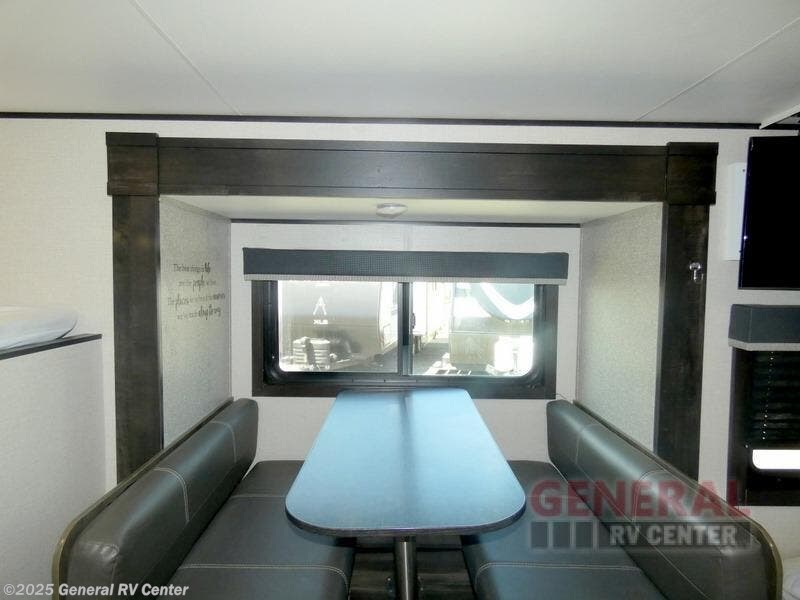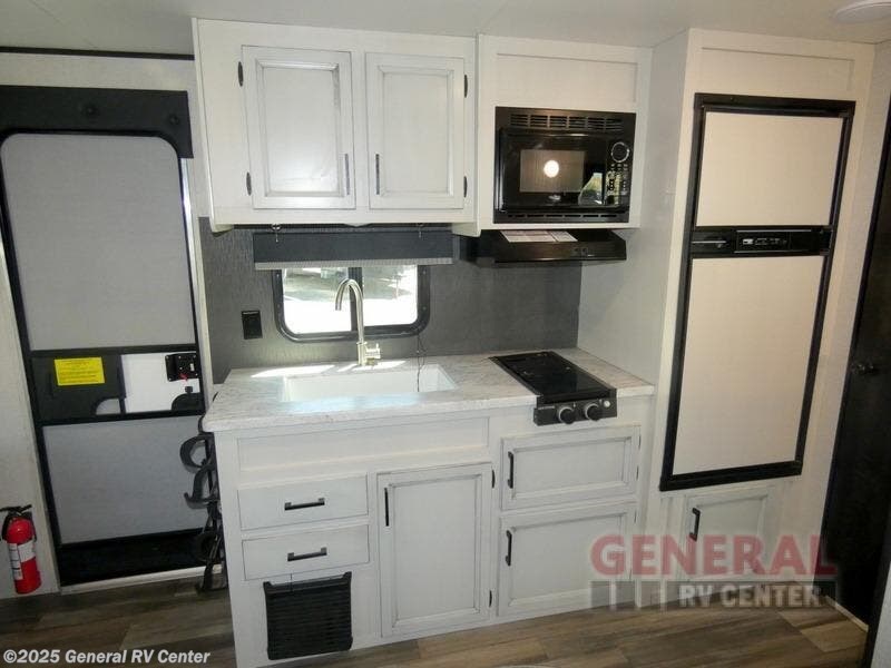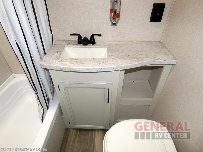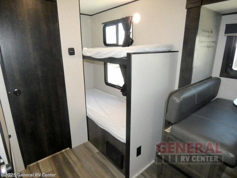 Camping with a group has never been easier than in this travel trailer with bunk beds! You will enjoy the bed up front and there is a wardrobe nearby to keep your clothes tidy. This model also includes a booth dinette slide that will be perfect for meal times, game night, and even sleeping space for one to two people. Whip up some eggs and bacon on the two burner cooktop or in the microwave oven before you head out for the day. The full bath with a tub/shower will be perfect if you're camping with little ones, and there is plenty of counterspace to set out your bathroom necessities.