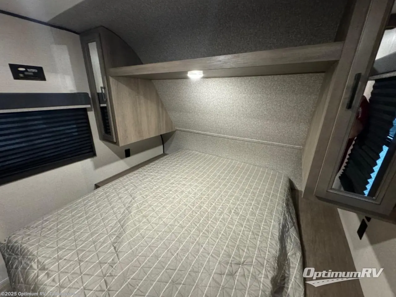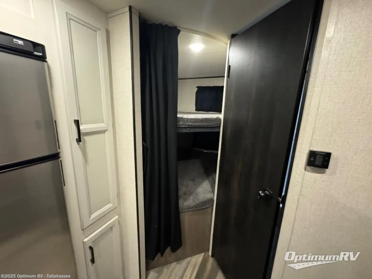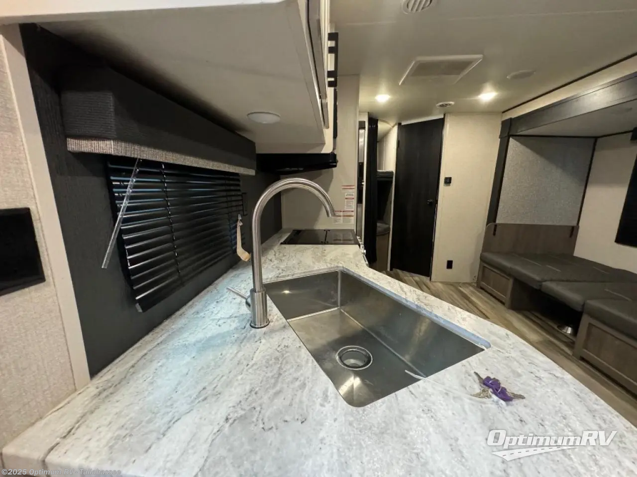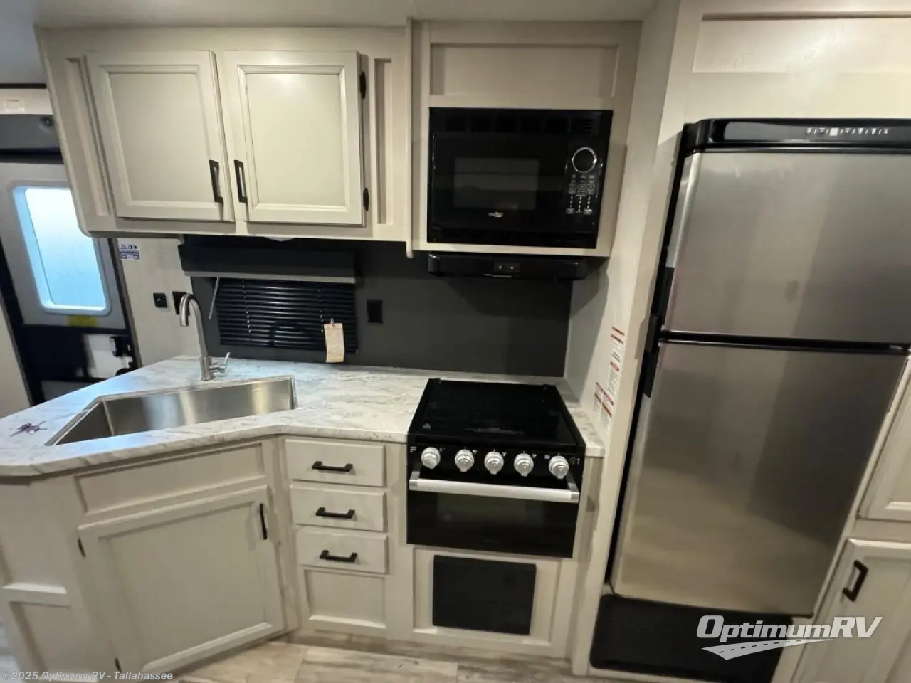 You're going to love every minute spent in this spacious travel trailer. The booth dinette and jack-knife sofa within the large slide out will be perfect for meal times, relaxing, and additional sleeping space. Add the optional LED TV to the entertainment center and you're set up for movie night! This model includes an outside kitchen with a griddle and a refrigerator for cold drinks, plus indoor appliances if the rain has ruined your plans for the day. You will enjoy your own bedroom up front with space-saving sliding doors and two wardrobes for your clothes.