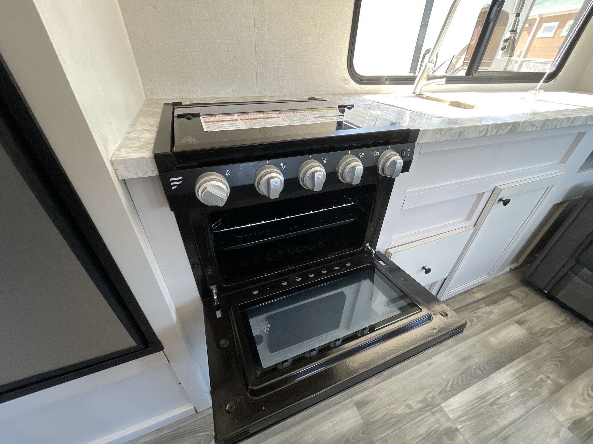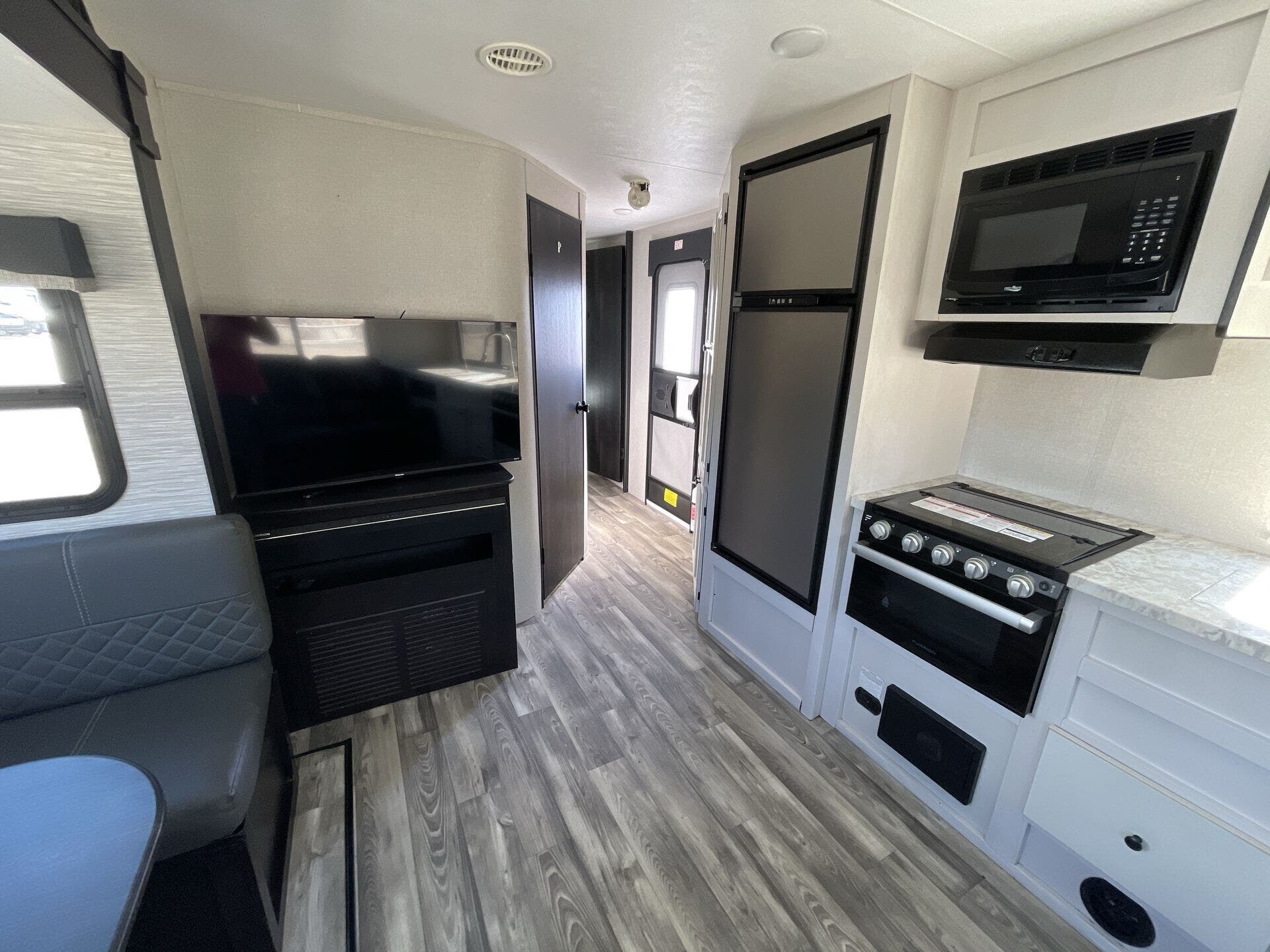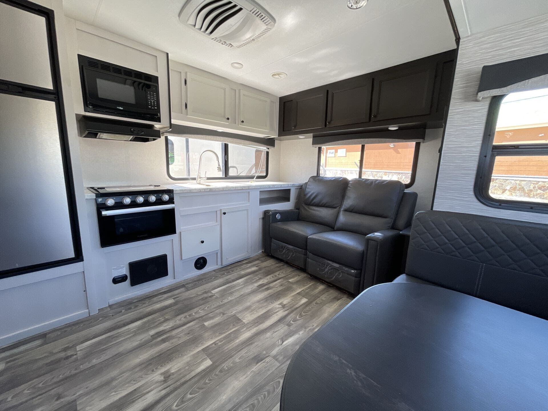 Step inside, and you’ll be greeted by a warm, open living area designed for relaxation and comfort. The rear lounge features large panoramic windows, a cozy tri-fold sofa, and a dinette slide that creates an airy, spacious feel. The kitchen is fully equipped with stainless-steel appliances, ample counter space, and plenty of cabinetry—perfect for preparing your favorite meals on the road. The front bedroom offers a comfortable queen bed with overhead storage and dual wardrobes, while the full bathroom includes a large shower and residential-style fixtures for a touch of home.