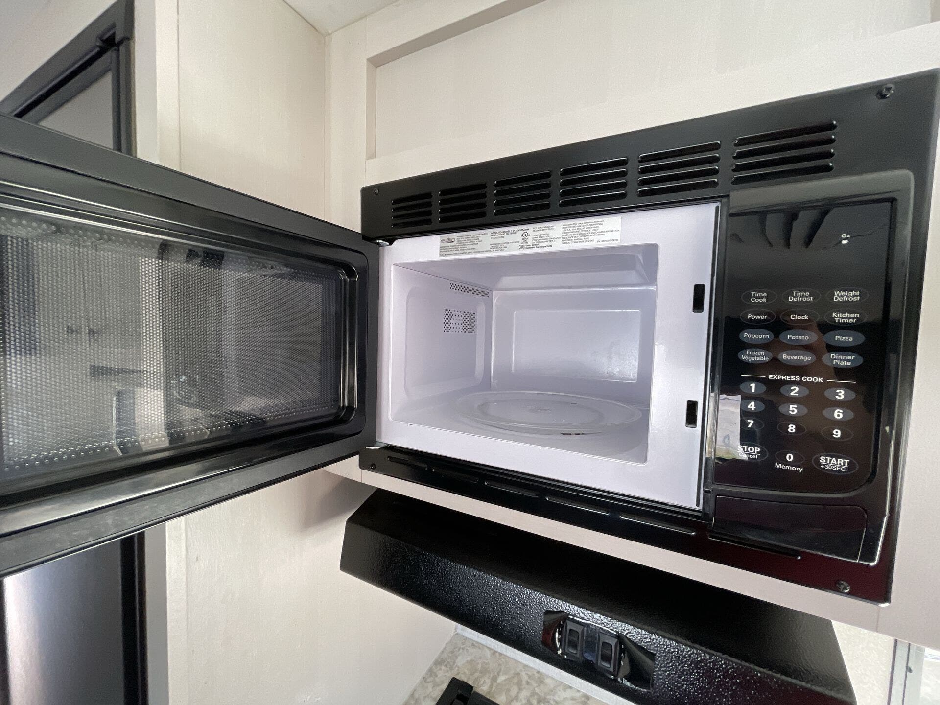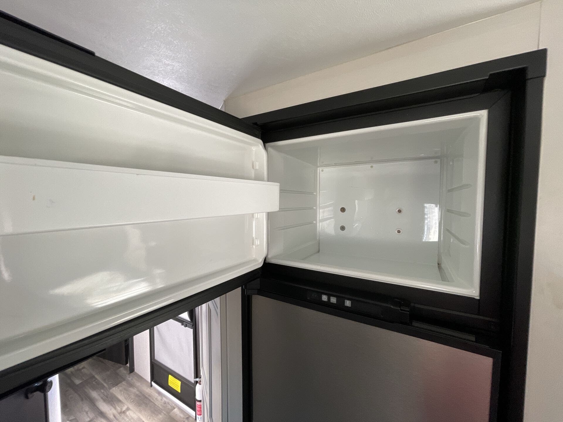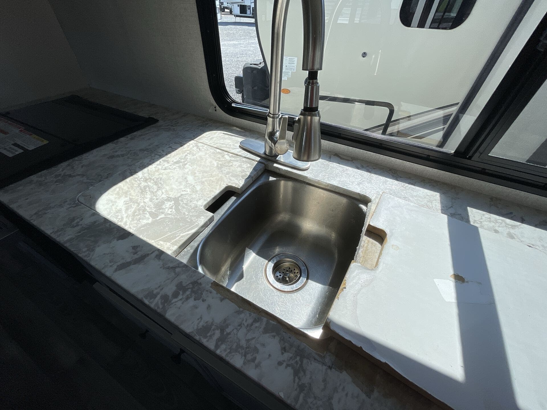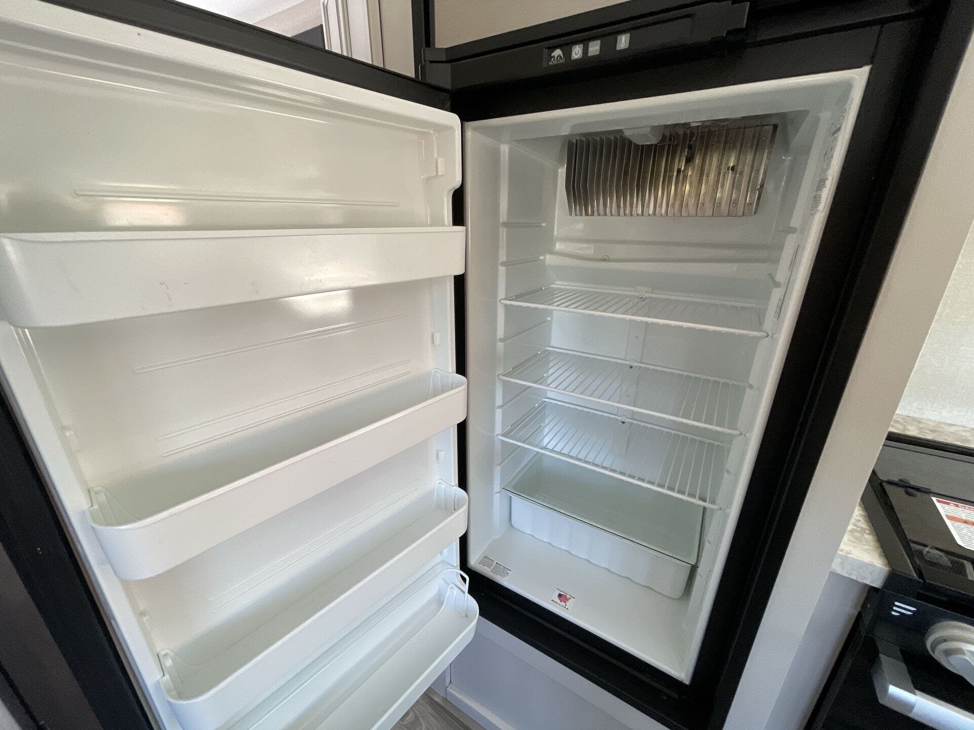 Step inside, and you’ll be greeted by a warm, open living area designed for relaxation and comfort. The rear lounge features large panoramic windows, a cozy tri-fold sofa, and a dinette slide that creates an airy, spacious feel. The kitchen is fully equipped with stainless-steel appliances, ample counter space, and plenty of cabinetry—perfect for preparing your favorite meals on the road. The front bedroom offers a comfortable queen bed with overhead storage and dual wardrobes, while the full bathroom includes a large shower and residential-style fixtures for a touch of home.