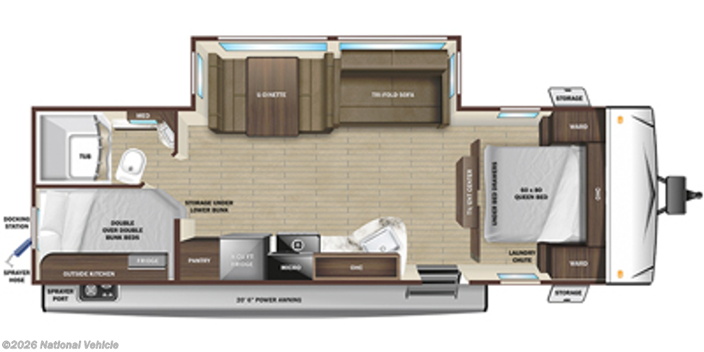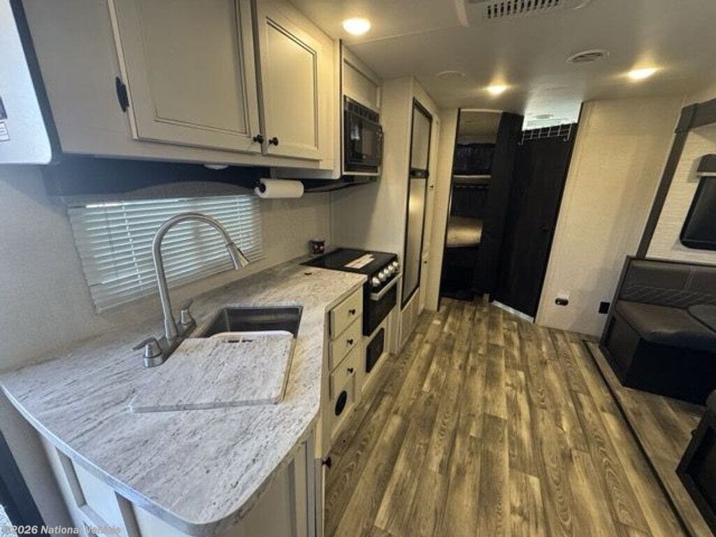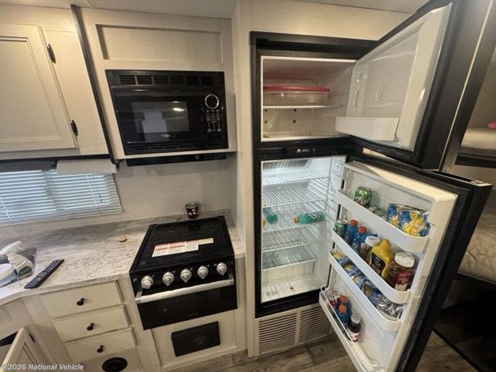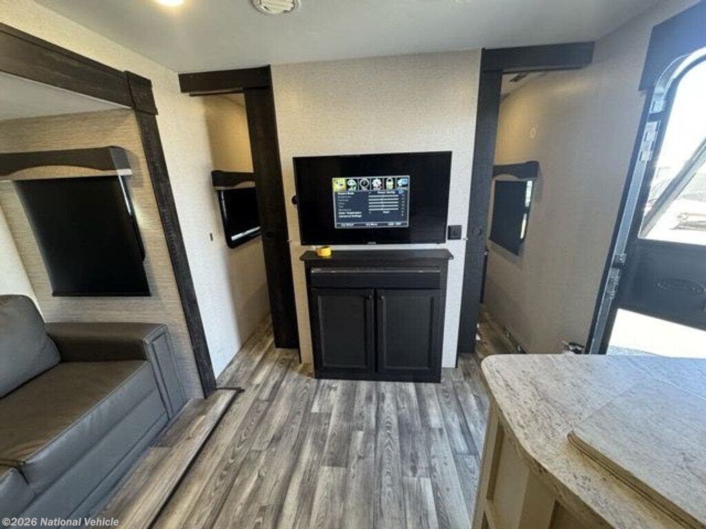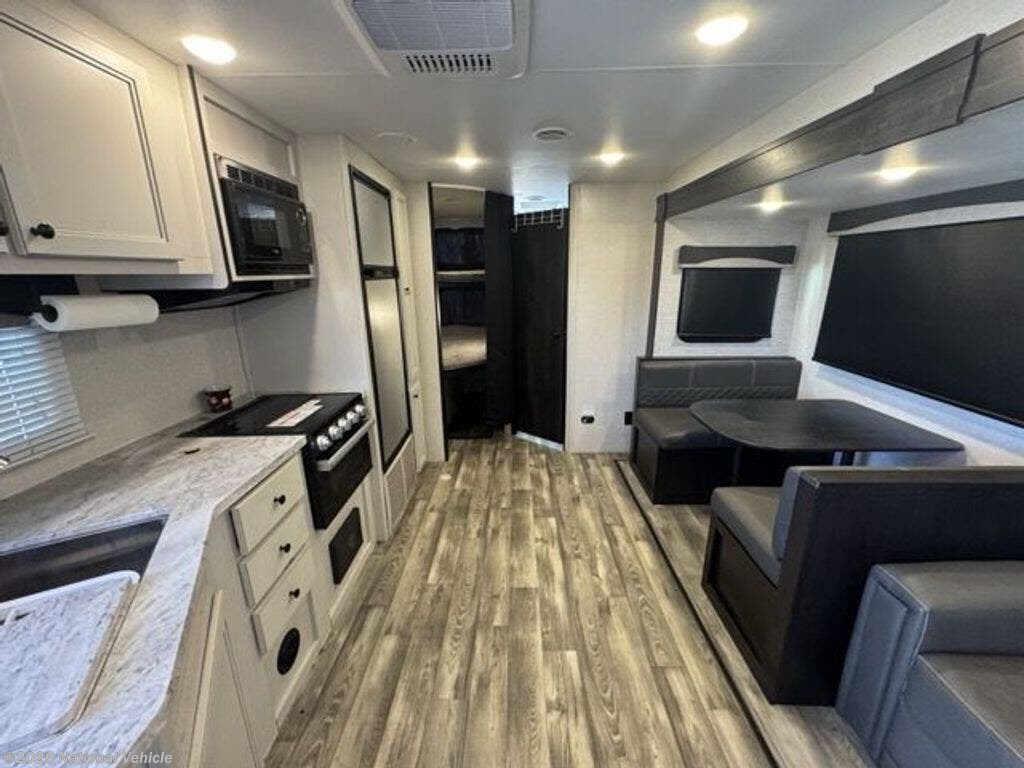 The interior features a popular family floorplan with double-over-double bunks, a private front queen bedroom, and a convertible dinette for additional sleeping space. The living area is bright and inviting thanks to large windows and LED lighting, while the entertainment center provides the perfect setup for relaxing after a day of adventure. The fully equipped kitchen includes a refrigerator, microwave, stovetop, and generous cabinetry, giving you everything you need to prepare meals on the road.