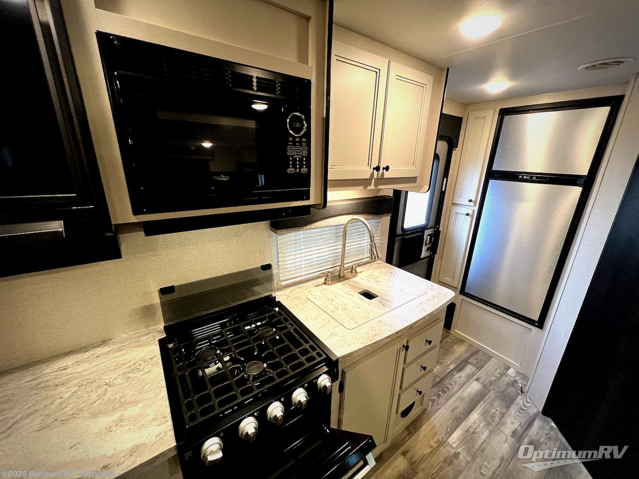 This travel trailer is the perfect couple's getaway! It features a front queen bed with wardrobes on either side for your clothes, a laundry chute on one side, overhead cabinets, and a privacy curtain to draw at night. You can prepare your best meals with the three burner cooktop with a 17" oven, enjoy them at the L-sofa with table which is conveniently across from the entertainment center that has a LED HDTV, and store any leftovers in the 8 cu. ft. refrigerator. The rear corner bathroom has a radius shower to freshen up in each morning, a medicine cabinet to store your toiletries, and a linen closet to keep your towels close.
