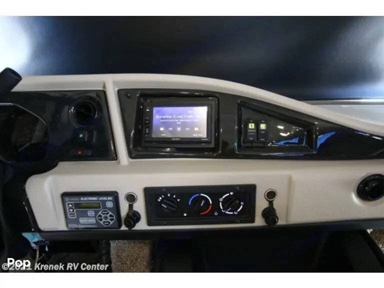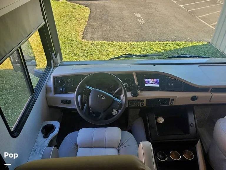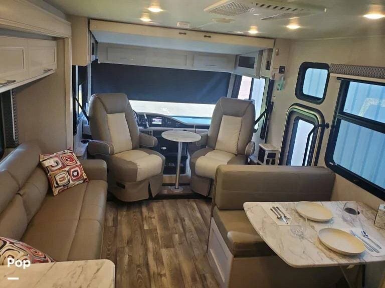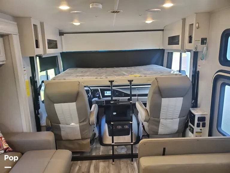 This 2022 Admiral (by Holiday Rambler) 29M Motorhome with gasoline engine has a patio entry door to the rear of the passenger seat (Allowing for use of the drop-down bed and door at the same time).