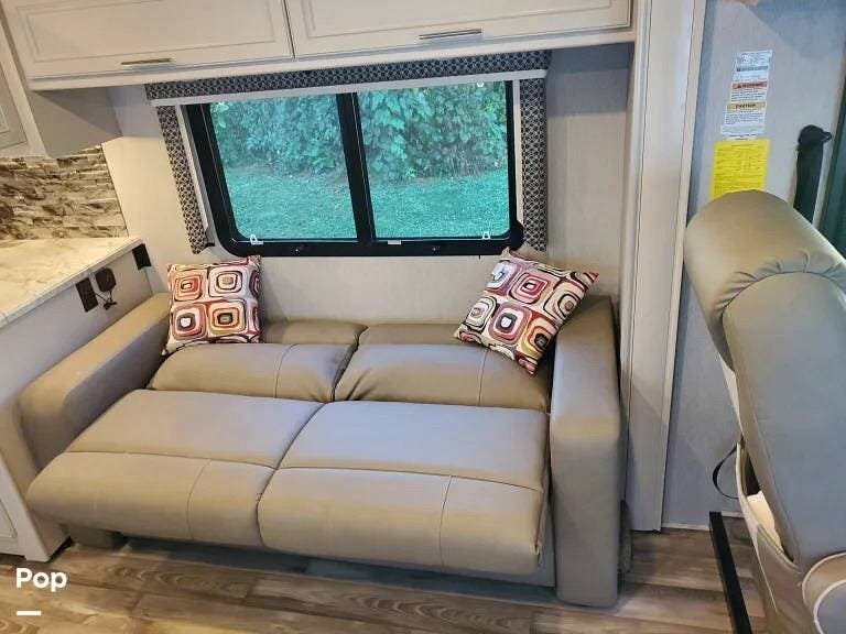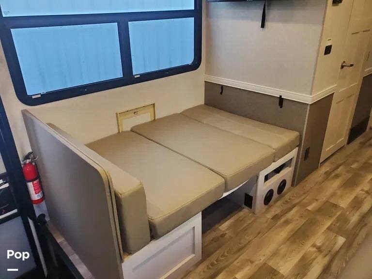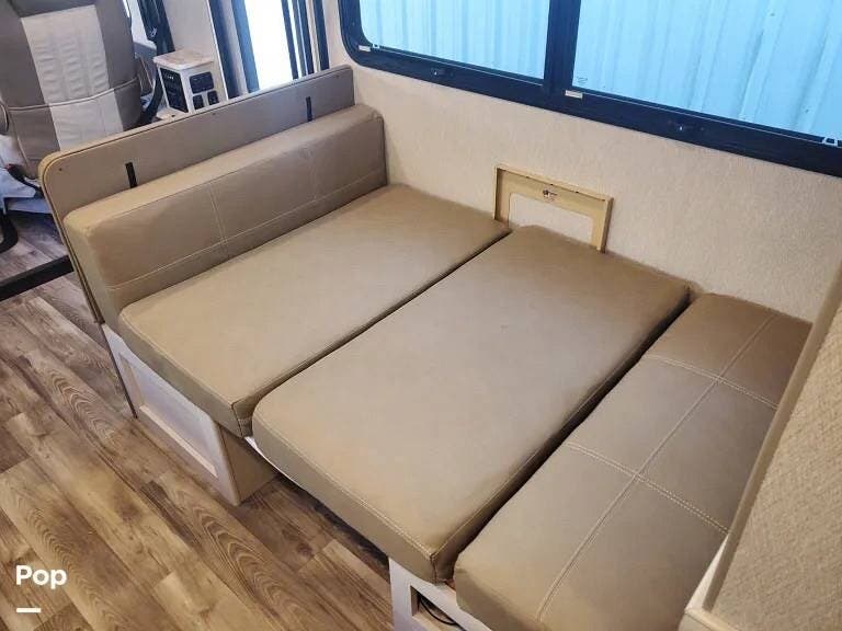 Upon entering, there is an L-shaped dinette on the patio side wall, opposed by a jackknife sofa at the front of the XL slide on the far wall. The center of the slide contains the kitchen and appliances.