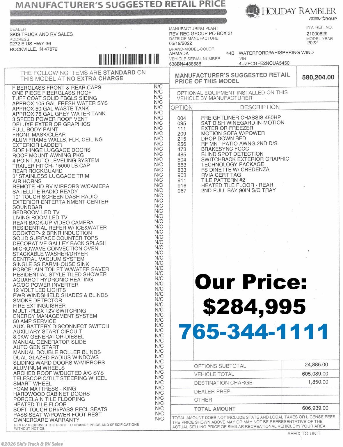 NEW/DEMO Model 2022 Holiday Rambler Armada 44B Luxury Tag Axle Diesel Pusher; Used at Trade Shows; Always Stored Inside; Never Seen Snow or Salt; 44 Foot; 4 Slides w/Toppers; Sleeps 8 ; Cummins 450 HP Diesel Motor; Allison 6-Speed Auto Shift; Titan Bridge Chassis; Front Diamond Shield; LOW MILES: Only 430 Miles; Auto Leveling; Full Body Paint; Aluminum Rims; 105 Gal. Fresh Water Cap.; 50 Gal. Black Water Cap.; 75 Gal. Gray Water Cap.; Three ACs: 15,000 / 15,000/ 15,000 BTUs (Rear AC Inc. Heat Pump); Aqua-Hot Radiant Heat Flooring; 21 C.F. (110V ) Refrigerator; On Demand Water Heater; Convection Microwave; 2-Burner Induction Stovetop; Solid Surface Countertops; Dishwasher; Loaded Touchscreen Control Panel; Central Vac System; Four TV Jacks; 55 In. TV; 40 In. TV; Two 32 In. TVs; AM/FM/CD/DVD; Speakers; Satellite; Free Standing Dinette; Pantry; Stainless Steel Sink; Trifold Sofa; Power Theater Seats; King Bed; Single Bunks (28 x 73 In.); Front Power Bed/Hide-a-Loft ; One Full Bathroom with Large Title Shower; One Half Bathroom; Washer/Dryer; Linen Closet; Two Power Awnings with LED Lights: 24 Ft. / 20 Ft.; Backup Camera; Blind Spot Detection; 8,000W Diesel Generator (8 Hours); Solar Package; Outside Shower; Exterior Storage with Pull Out Drawers; Outside Cooler; Grab Handle; Roof Ladder; Battery Disconnect; Black Tank Flush; Climate Package; Tinted Windows; Roller Shades; Financing Available; SUPER Luxury Diesel Pusher for the Price: $284,995. PLEASE CALL 765-344-1111 TO SCHEDULE A TOUR OR TEST DRIVE OF THIS UNIT. Thanks.