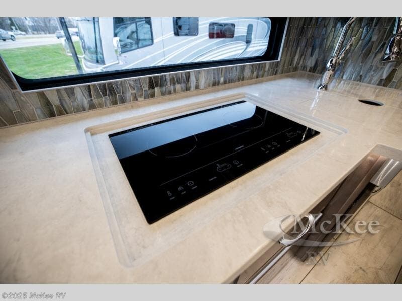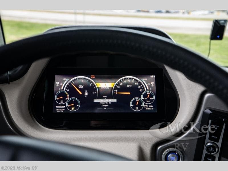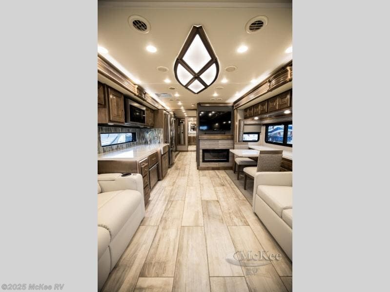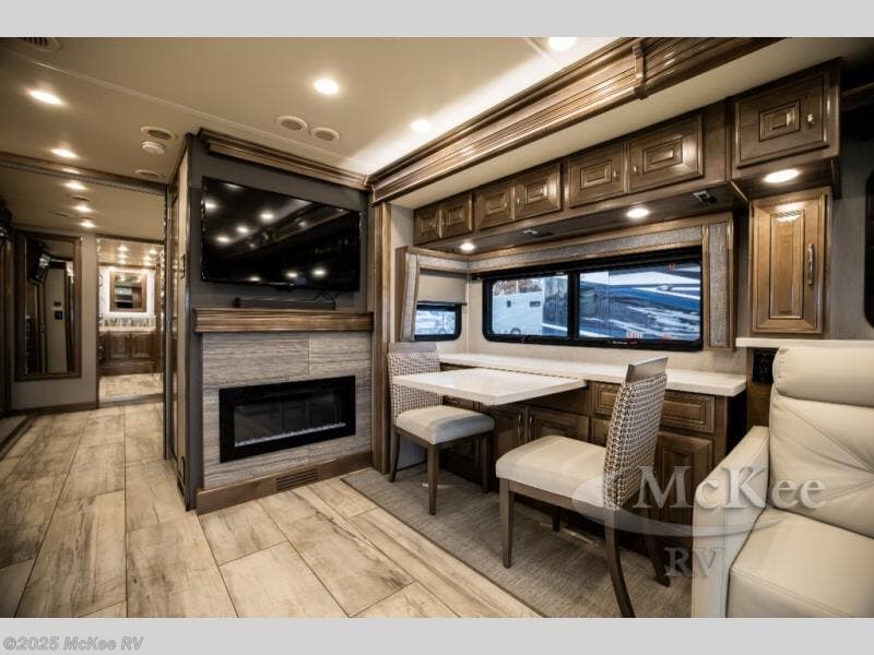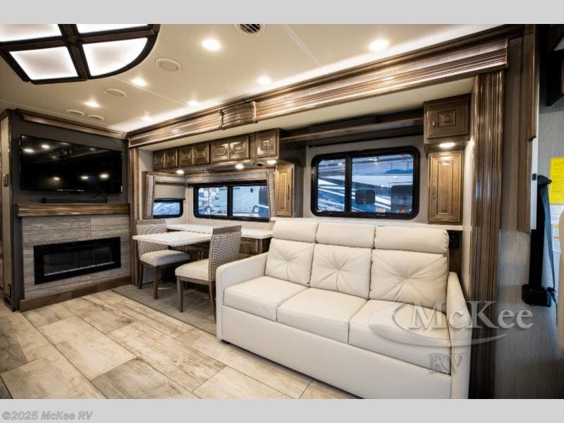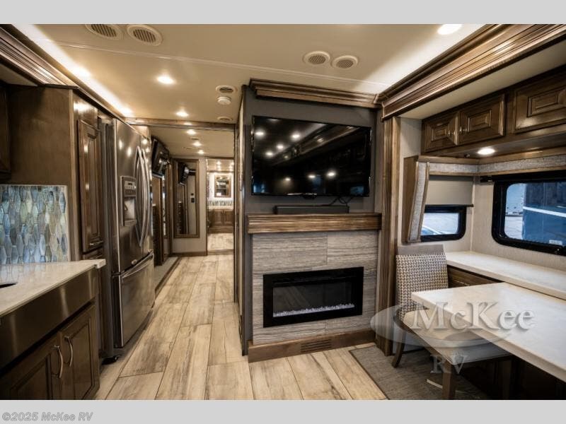 You are going to love this Armada Class A diesel motorhome! As the owners, you'll enjoy a magnificent oasis in the back of this coach with a high-class master suite. The bedroom is connected to a spacious master bathroom that has a dual-sink vanity, a separated toilet room within the bathroom, a 56" x 38" tile shower with seat, two linen closets, plenty of storage for toiletries, and a washer/dryer. Now isn't that amazing? The bedroom is also filled with comfort as it contains an Encore Series king bed, opposing slides, a 32" LED TV, two wardrobes, and a dresser. Not only is there a full bathroom back in the master suite, but there is an additional half bath out in the main living area which will be useful for anyone else traveling with you. The living area is ultra comfortable with its 67" sofa sleeper with pull-out full bed and ottomans, 64" loveseat with drawer, free-standing dinette with credenza, fireplace, and 55" pop-up LED TV. There is even an additional TV above the cab.