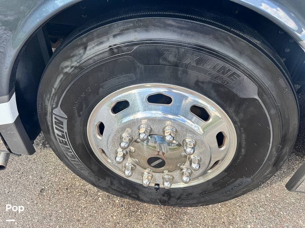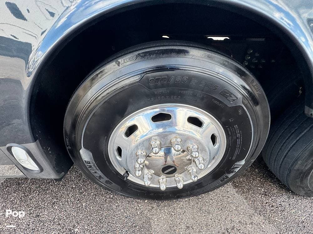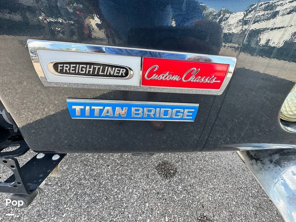 It rides on a Freightliner custom modular chassis with air brakes, air ride, V-Ride rear suspension system, passive rear-steerable tag axle, independent front suspension with a 60-degree turning radius, custom-tuned Sachs shocks, DriveTech, and Opti-view digital instrumentation.