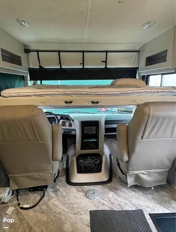 Above the cab area is a power-operated drop-down bed for additional sleeping space.