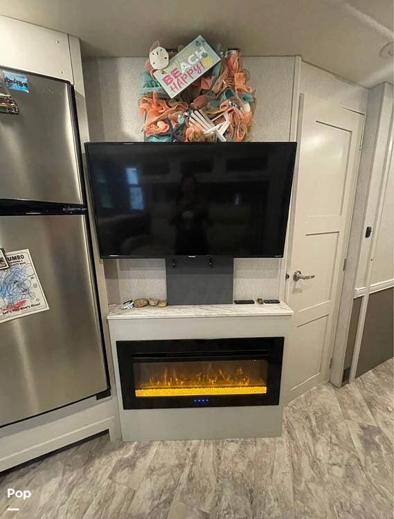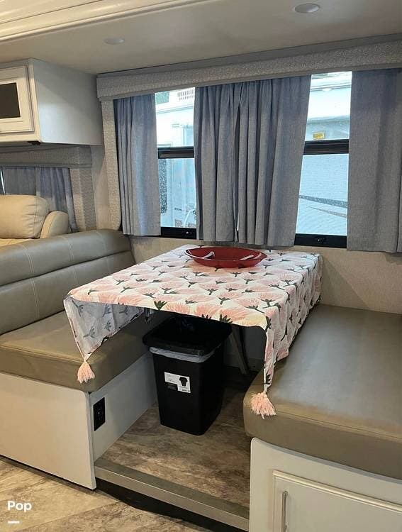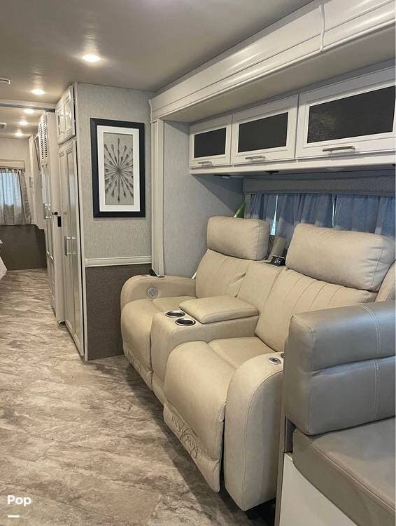 Relax on the theater seats or at the booth-style dinette/sleeper, and enjoy the large flat-screen TV and fireplace.