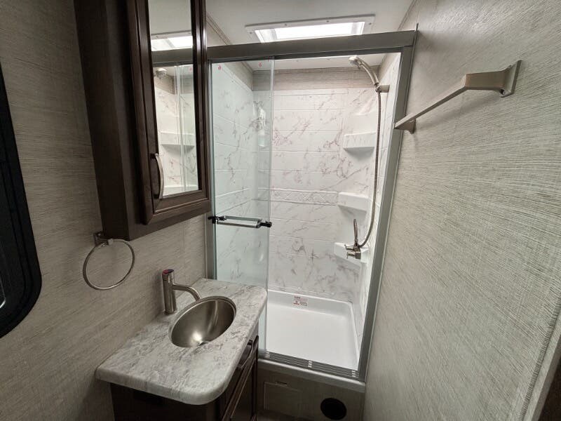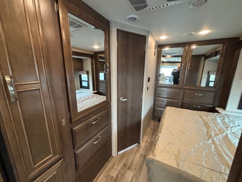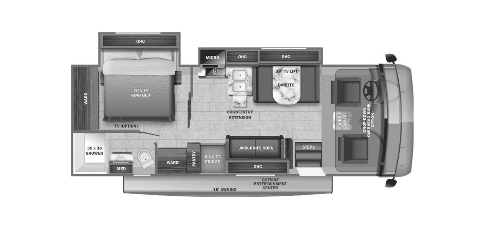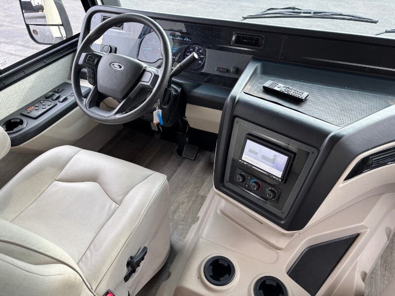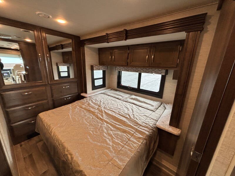 Features Include: 7.3L V8 Gas Engine, 210-Amp Alternator, Jounce Bumpers, Panoramic Windshield, Tilt Steering Wheel, Swivel Cab Seats, Porch Light, Remote Keyless Entry, Linoleum Flooring, Pressed Countertops, Stainless Steel Sink, Sink Cover, Cooktop with Oven, Satellite Dish Prep, Entertainment System, FM DVD Player, King Size Bed (27A), Bedspread, Nightstands, Large Wardrobes, Stainless Steel Sink, Glass Shower Door, 190w Solar Panel, 30-Amp Service Cord, 1000w Inverter, Two AC Units, 30k Ducted Furnace, Bead Foam Insulation, Roof Ladder, Pass Through Storage, Third Brake Light