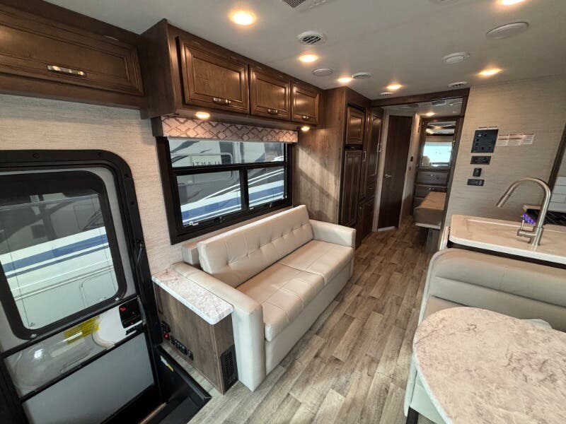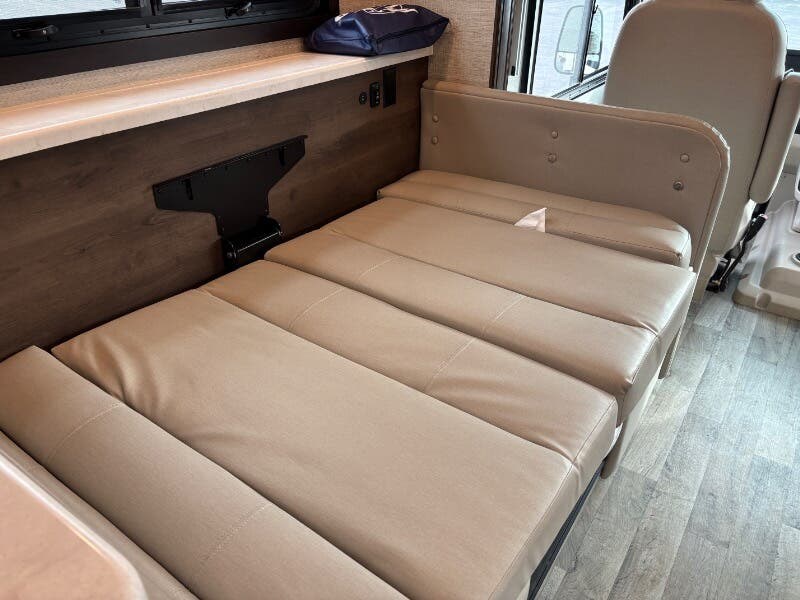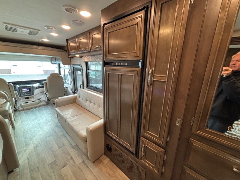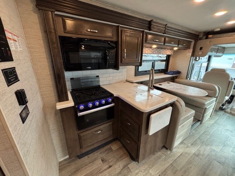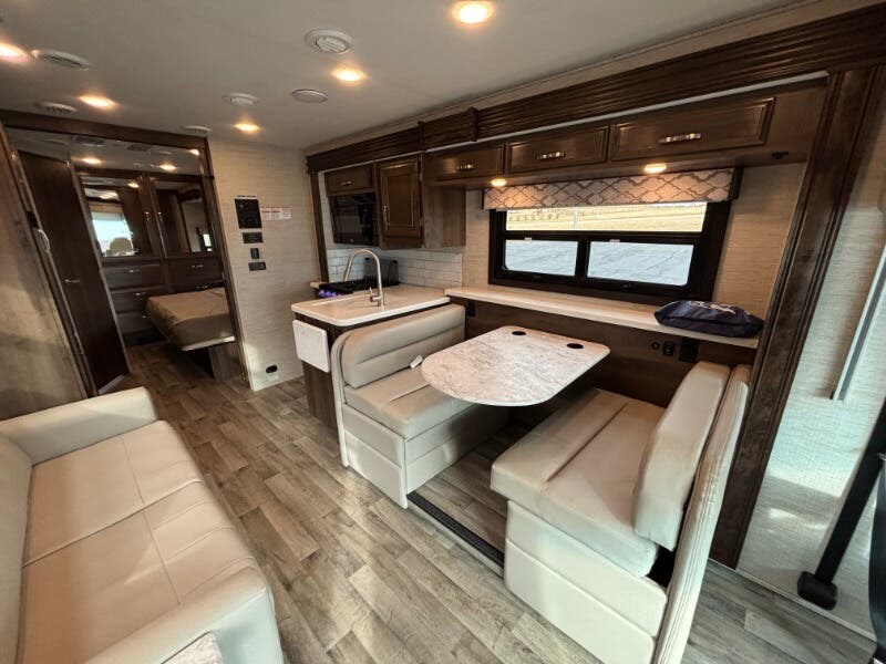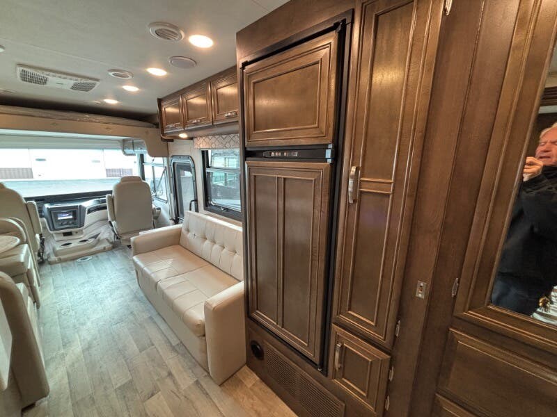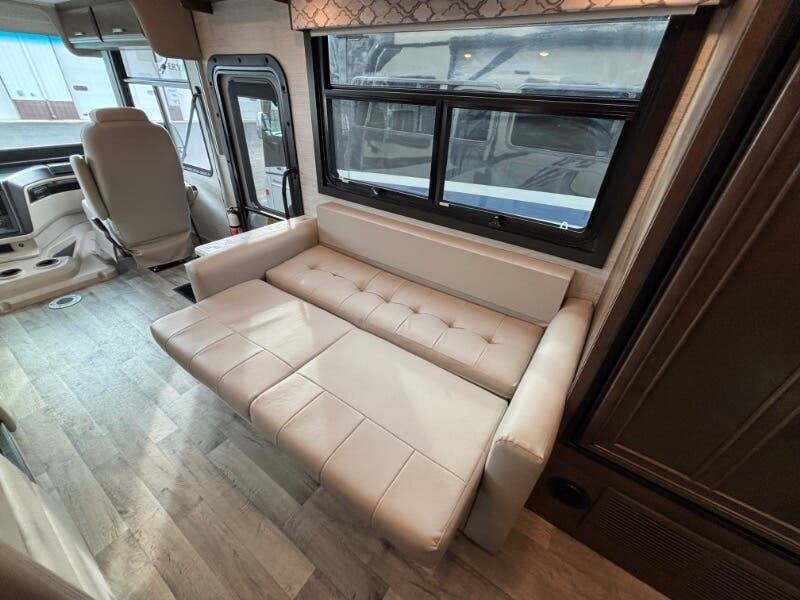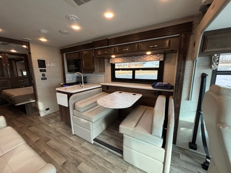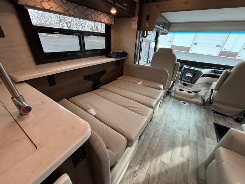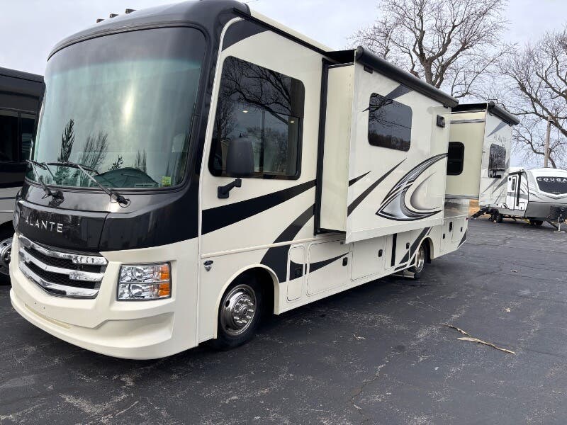 The 2022 Jayco Alante 27A is a Class A RV that combines comfort, functionality, and modern conveniences, perfect for those seeking adventure on the road. This model is built on the Ford F-53 chassis and powered by a robust 7.3L V8 gas engine, delivering 350 horsepower and 468 lb-ft of torque. It features a TorqShift 6-speed overdrive with tow mode, a 210-amp alternator, and four-wheel anti-lock disc brakes, ensuring a smooth and reliable driving experience. The vehicle is equipped with durable 19.5-inch Goodyear radial tires and a 5000-pound receiver with a 7-pin connector for towing. Cab features include: - Panoramic windshield for expansive views - Power windshield shade - Soft touch vinyl wrap dash - Tilt steering wheel - Swivel cab seats with a 6-way power driver seat - Sony infotainment system with Apple CarPlay and Android Auto - Backup and side cameras with a monitor - Removable cockpit table The Alante offers a welcoming living space enhanced by its power patio awning with LED lights, remote keyless entry, and electric-powered entry step. Inside, enjoy an 84-inch ceiling height with high-intensity LED lighting, frameless tinted glass windows, and blackout night roller shades for privacy. Interior amenities include: - Linoleum flooring - Sofa comfort lounge - LED lit hardwood fascia - Cherry wood cabinetry with hardwood doors and drawer fronts - Safety belts in designated positions Dining and kitchen highlights: - Legless dinette table with pressed countertops - Flip-up counter extension with LED lighting - Stainless steel sink with a water filtration system - 8cf flush mount refrigerator - Cooktop with oven and a residential size microwave - Outdoor grill with LP quick connect Entertainment options abound with a comprehensive electronics package, featuring: - CO and smoke detectors - Winegard 2.0 WiFi 4G antenna - Satellite dish prep - Entertainment system with LED HD smart TV, Blu-ray player, and outdoor speakers - Outdoor TV on swivel bracket Sleeping accommodations include: - A walk-around queen-size bed and a king-size bed option in the 27A trim - Nightstands and large wardrobes for storage - Bedroom TV and underbed storage The bathroom boasts a stainless steel sink, glass shower door with decorative shower surround, a porcelain foot flush toilet, and a power roof vent with wall switch. For mechanical needs, the Alante is outfitted with: - A 190W solar panel with dual controller and two 6V AGM house batteries - 30-amp service cord and a 56-pound propane tank - 4.0 Onan Marquis Gold Genset generator and energy management system - Two AC units, including a 15K AC unit - Girard tankless hot water system and exterior utility center Constructed with strength and durability in mind, the coach features: - Stronghold VBL roof, floor, and sidewalls - Bead foam insulation and fiberglass walls with vinyl graphics - Seamless fiberglass crowned roof with a roof ladder - Automatic hydraulic leveling jacks and slideout topper awnings - Pass-through storage with lockable slam-latch cargo doors The 2022 Jayco Alante 27A is an exemplary choice for those looking for a Class A motorhome that delivers a deluxe travel experience, with every detail thoughtfully designed for comfort and convenience. ??