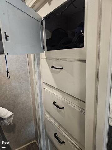 When you walk into this coach, you're greeted with rich hardwood and high-quality upholstery and fabrics, featuring theater seating across from a dinette sleeper, and a large drop-down bed.