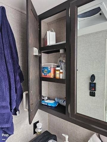 The mid-bath layout features a large rectangular shower, a sink, a medicine cabinet, a toilet, and cabinet storage. Towards the rear, a queen walk-around bed is fronted by a large wardrobe and dresser, a TV, and ample storage.