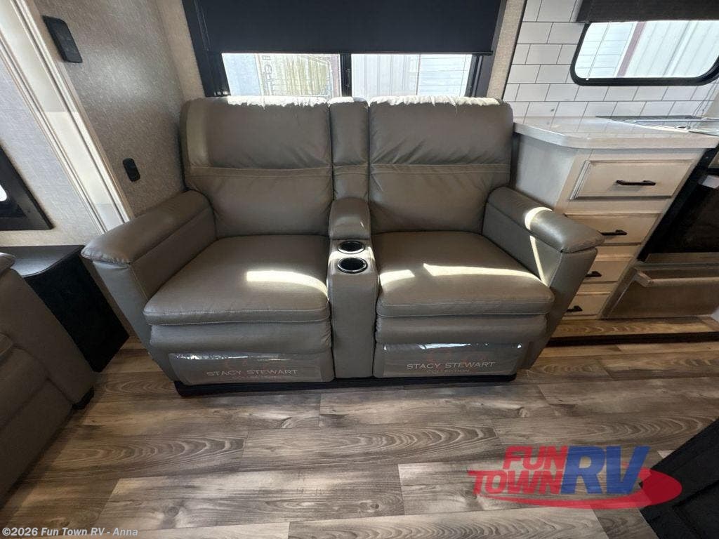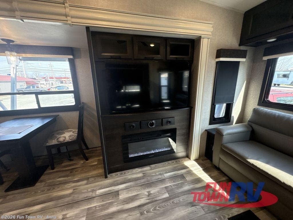 Trips to the lake are made luxurious in this spacious fifth wheel for four! The rear living area includes a tri-fold sofa, a ceiling fan to keep cool, plus a theater seat across from the entertainment center and fireplace. You will love the walk-in pantry and 21 cu. ft. residential refrigerator to store food for the whole week, plus there is a convenient coat closet/pantry for even more storage. The full bath features a shower with a seat, a linen closet, plus a medicine cabinet to keep all your necessities organized. You will feel right at home in the front private bedroom with its queen bed slide out, a chest with a TV option, plus a walk-in closet with shelves and washer and dryer prep. You can't go wrong with this fifth wheel!