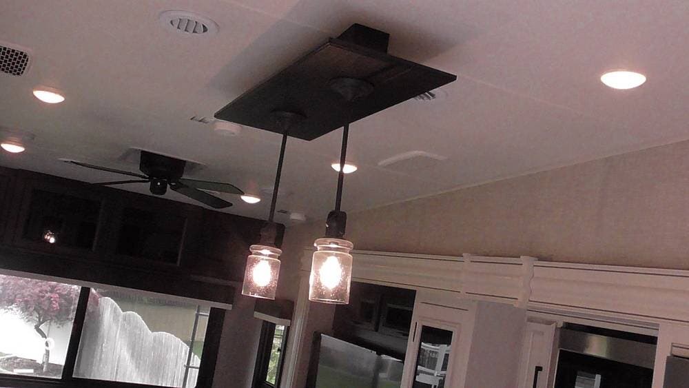 The rear opposing slide-outs truly open up the main living area! You will enjoy watching television in the stadium-style chairs.