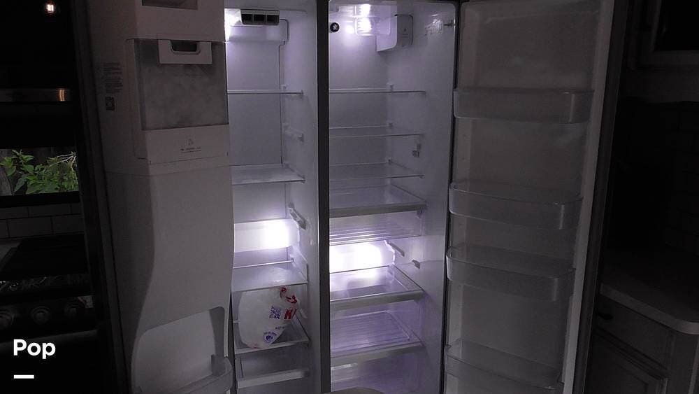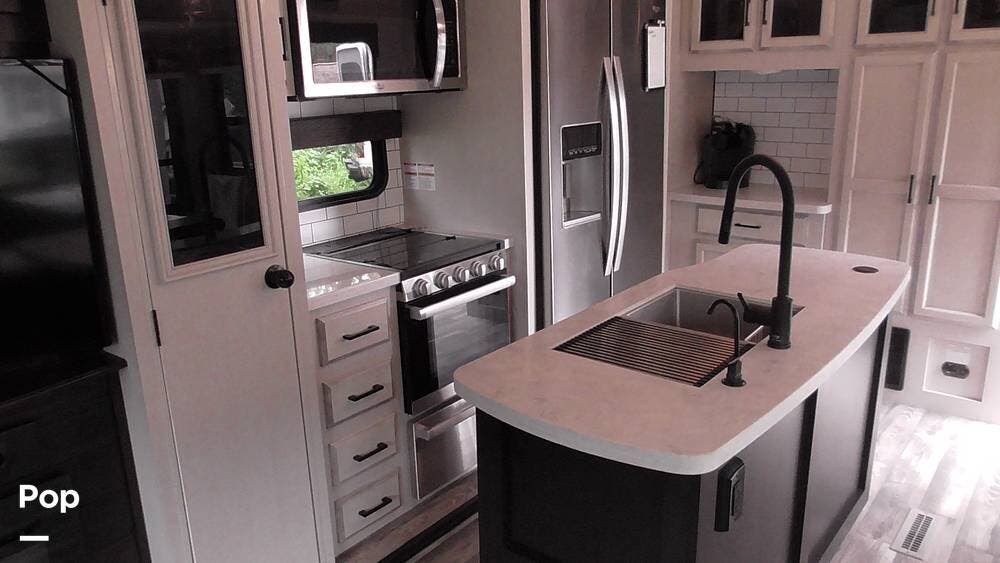 This recreational vehicle has a fully functional kitchen, including a stovetop, oven, and a spacious refrigerator with a freezer. The center island features double sinks and ample storage space.