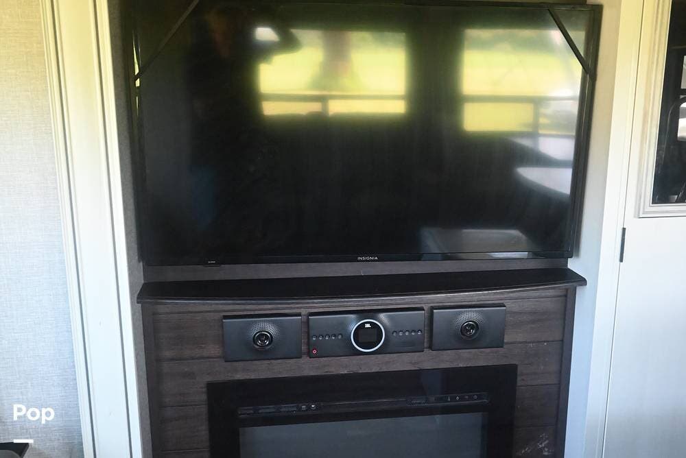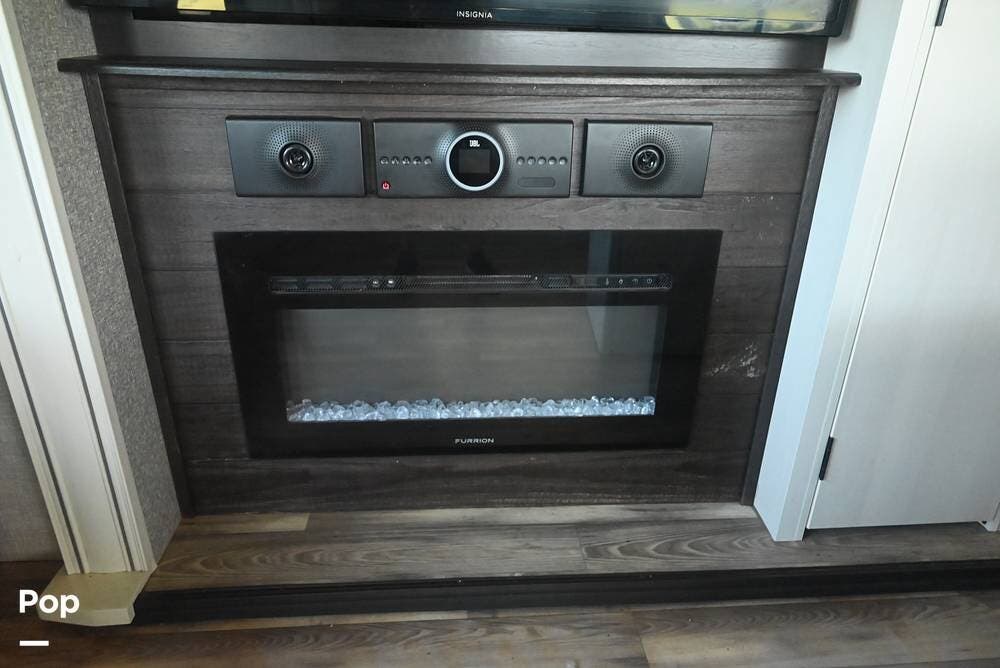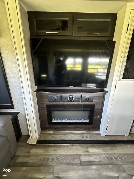 Entertainment area with an electric fireplace, a large flat screen TV above, and a sound system. Twin recliners and pull-out sofa.