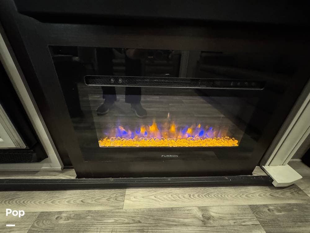 For winter comfort, the entertainment center features a 5,000 BTU electric fireplace for heat and ambiance.