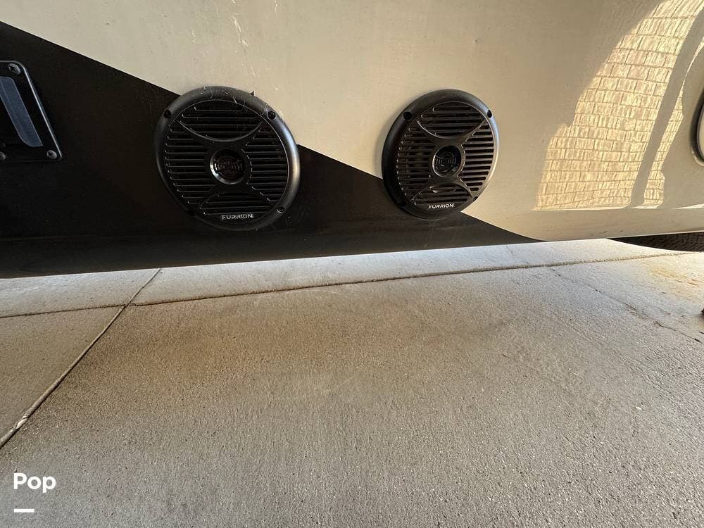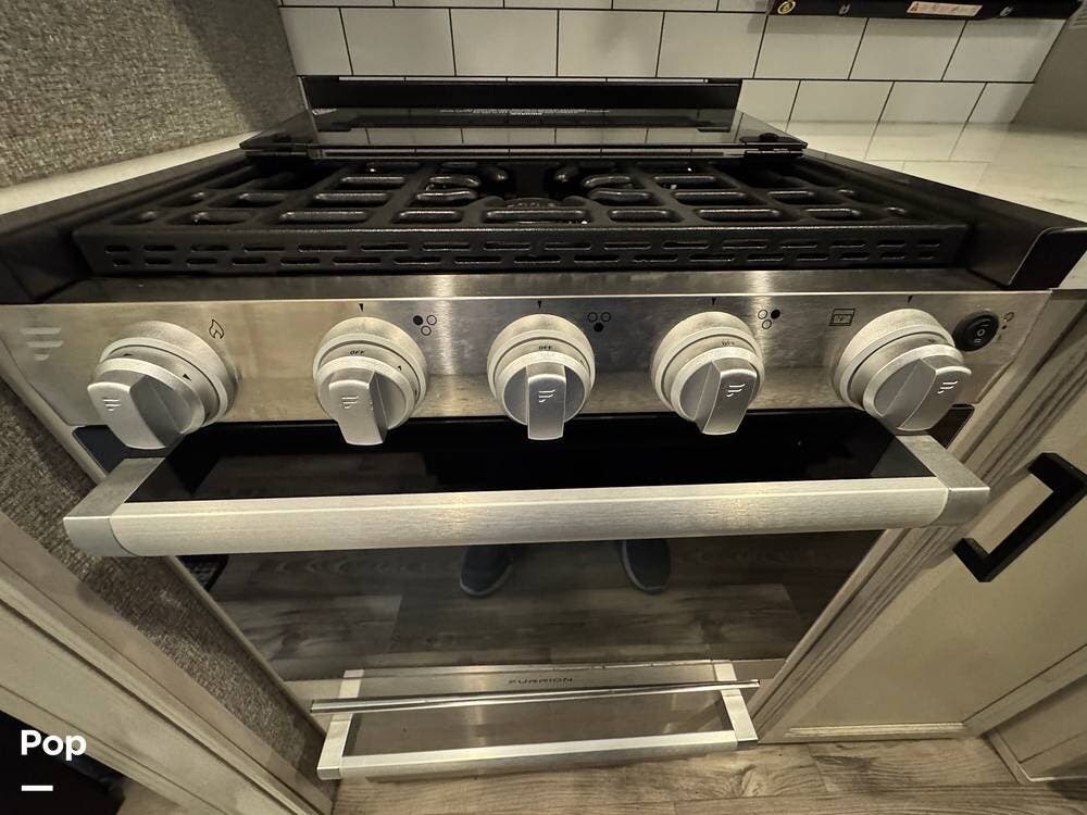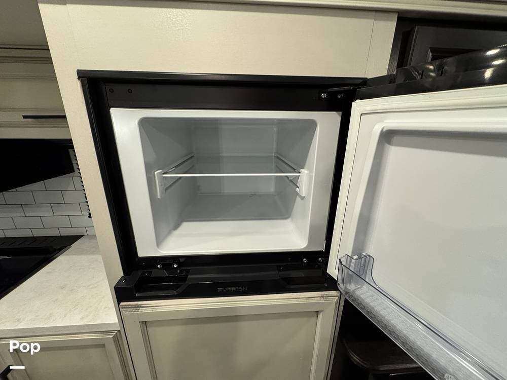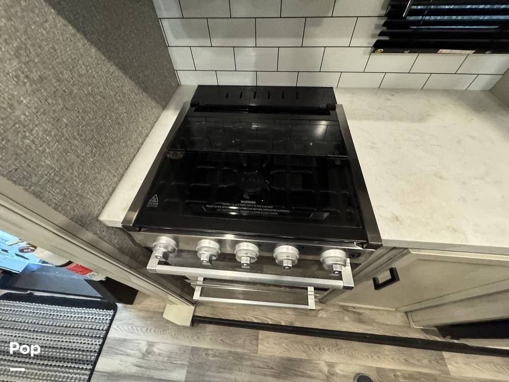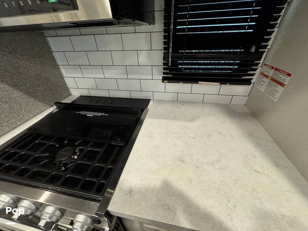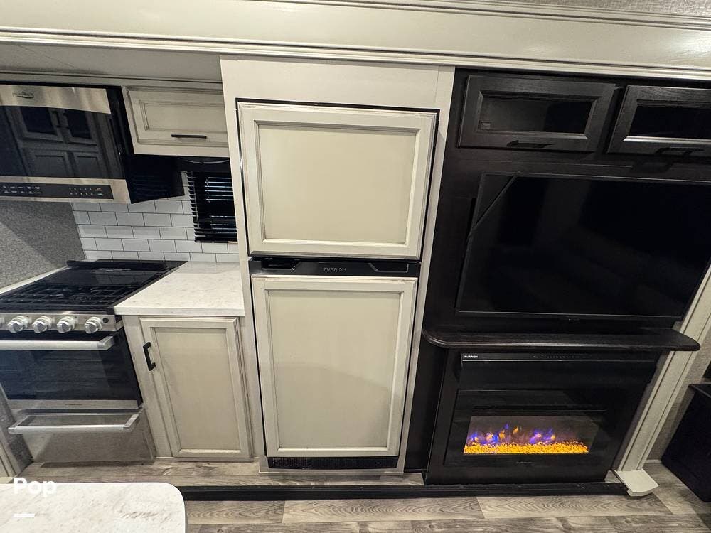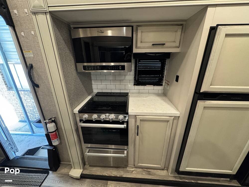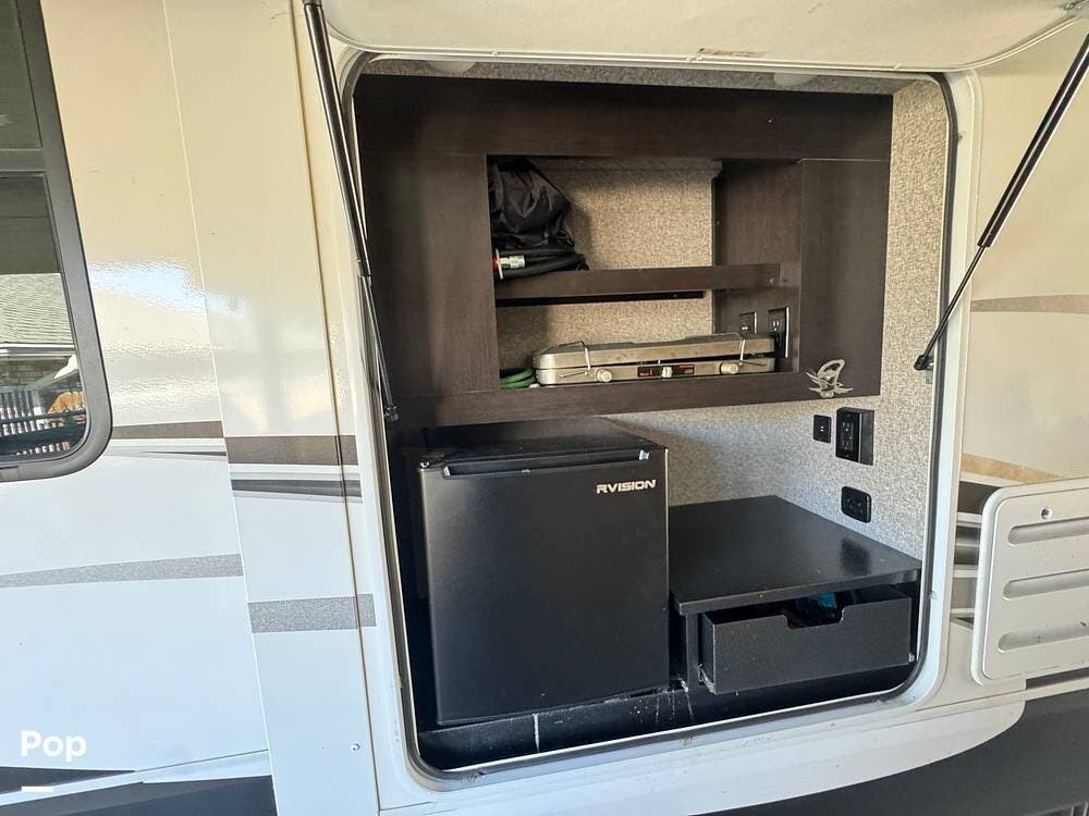 Outside, there is a 15 ft. electric patio awning with integrated LED lighting and an outside kitchen that includes a mini fridge, a cooktop, and cabinets.