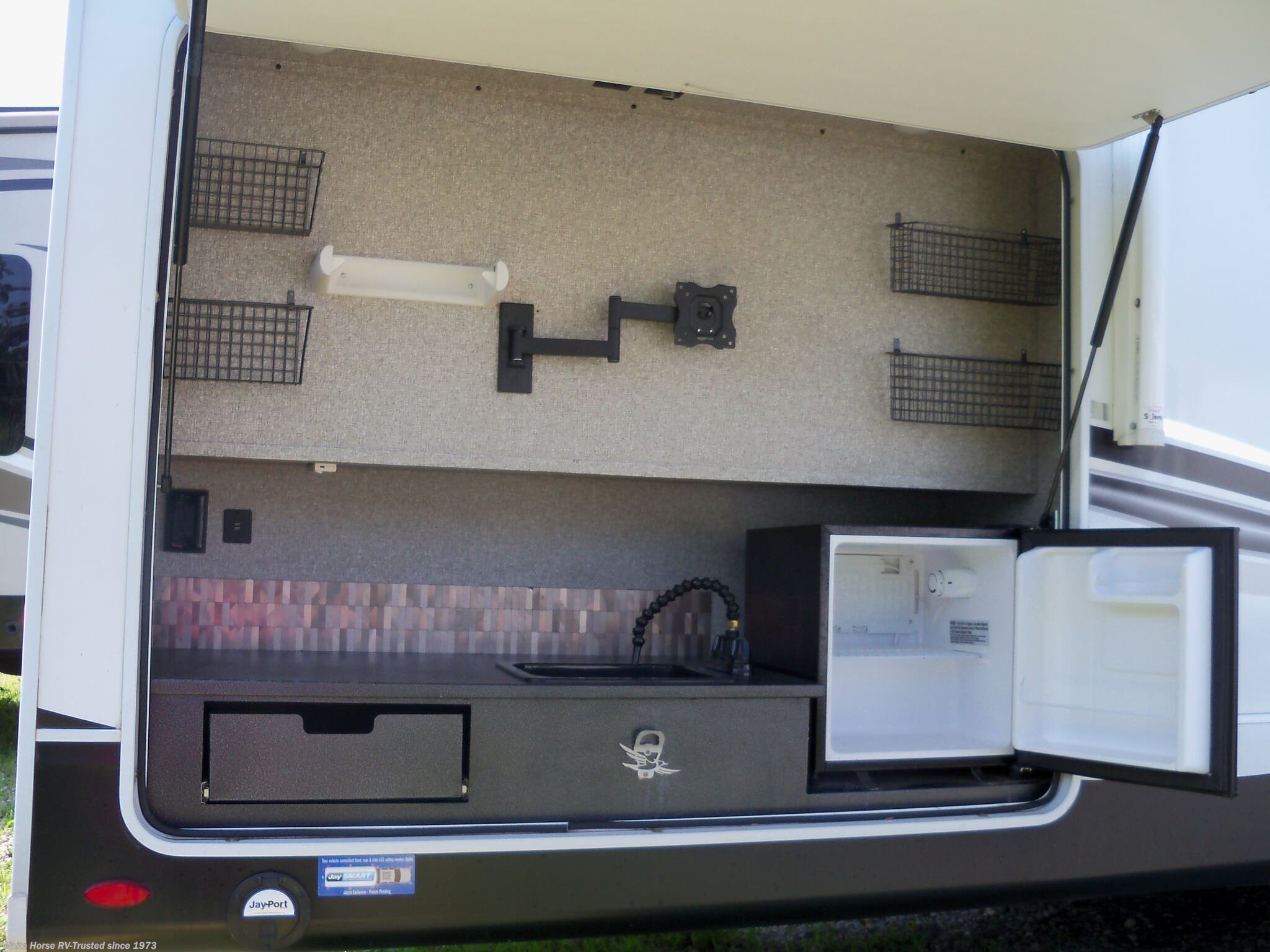 Awning, Exterior Speakers, Ladder, Leveling Jacks, Outside Kitchen, Power Roof Vent, Skylight, Slideout -