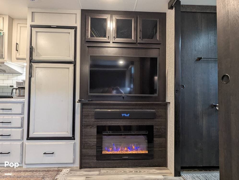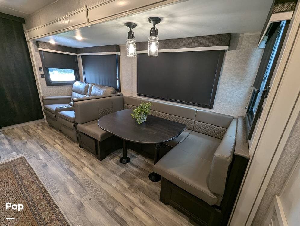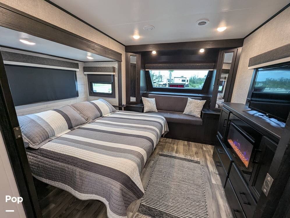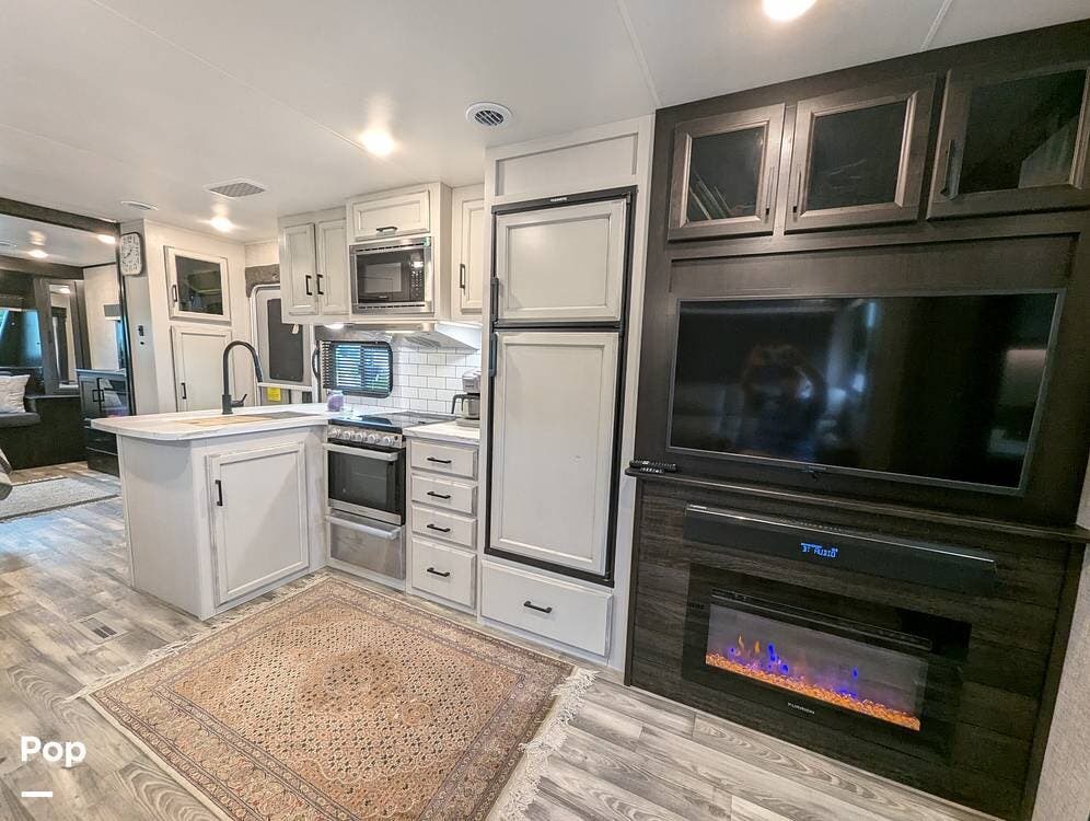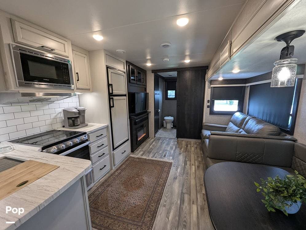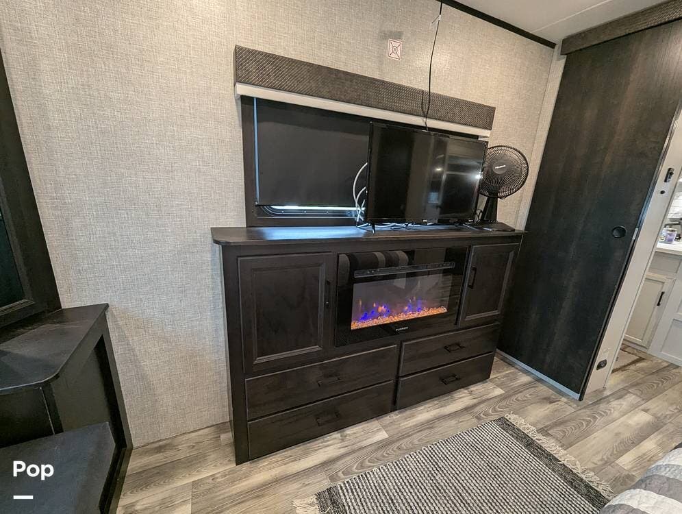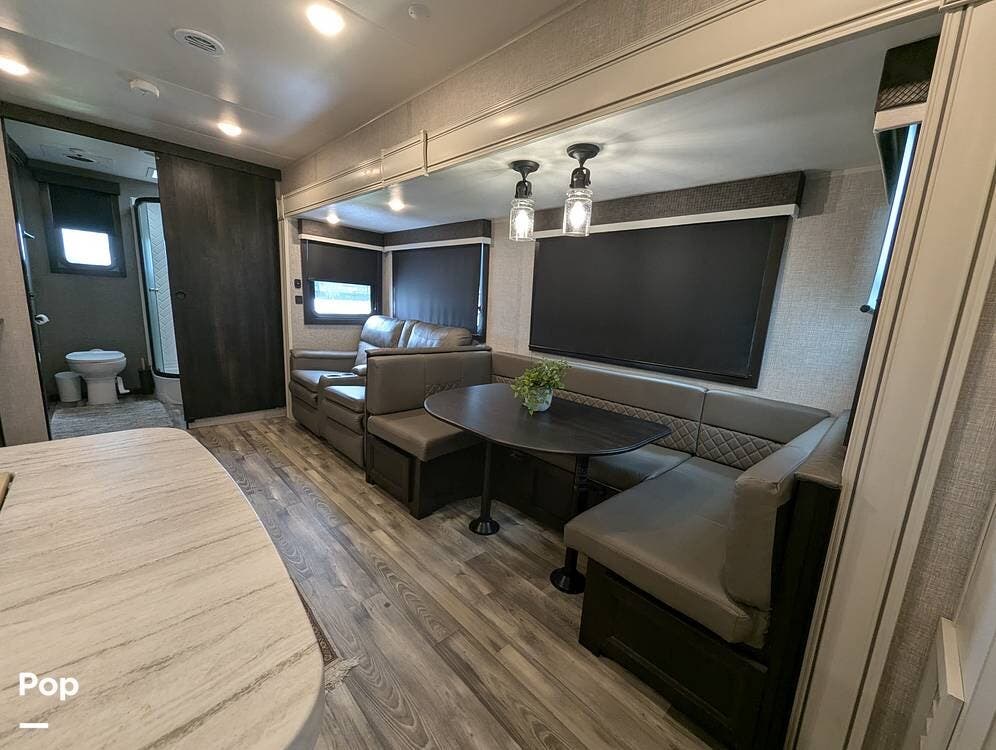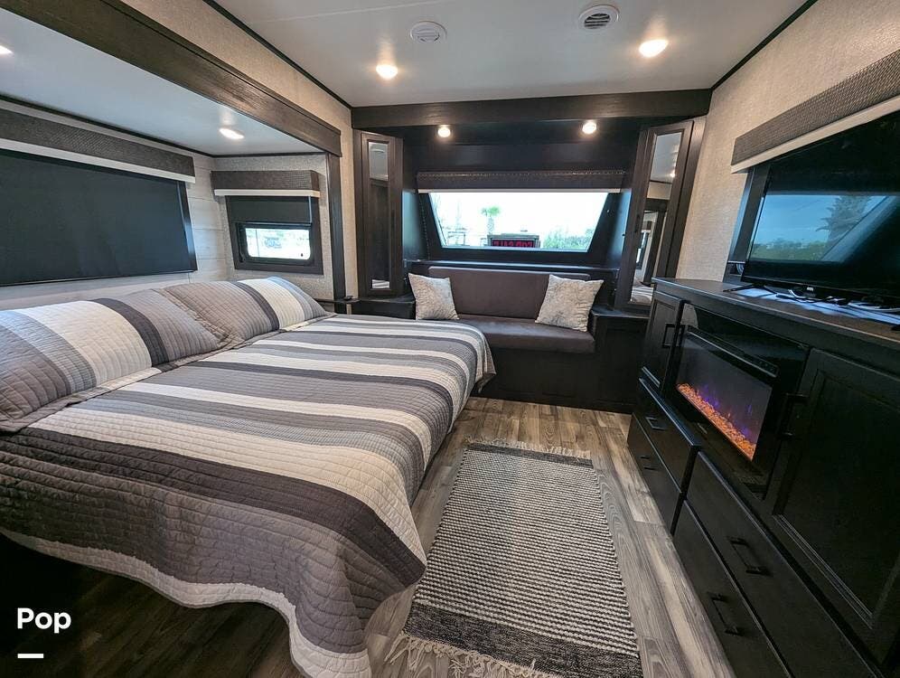The living area is comfortable, featuring twin recliners, a large-screen TV, and a cozy fireplace for those chilly mornings. The U-shaped dinette converts to a sleeper for two.