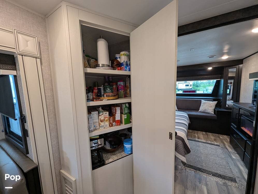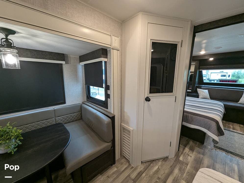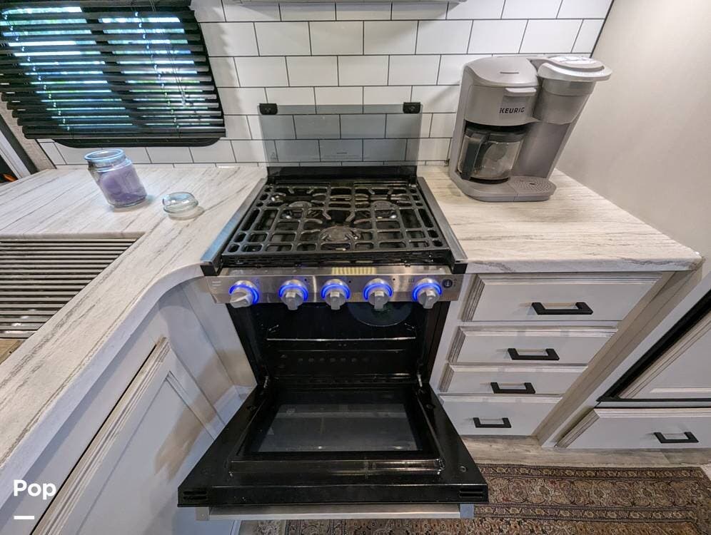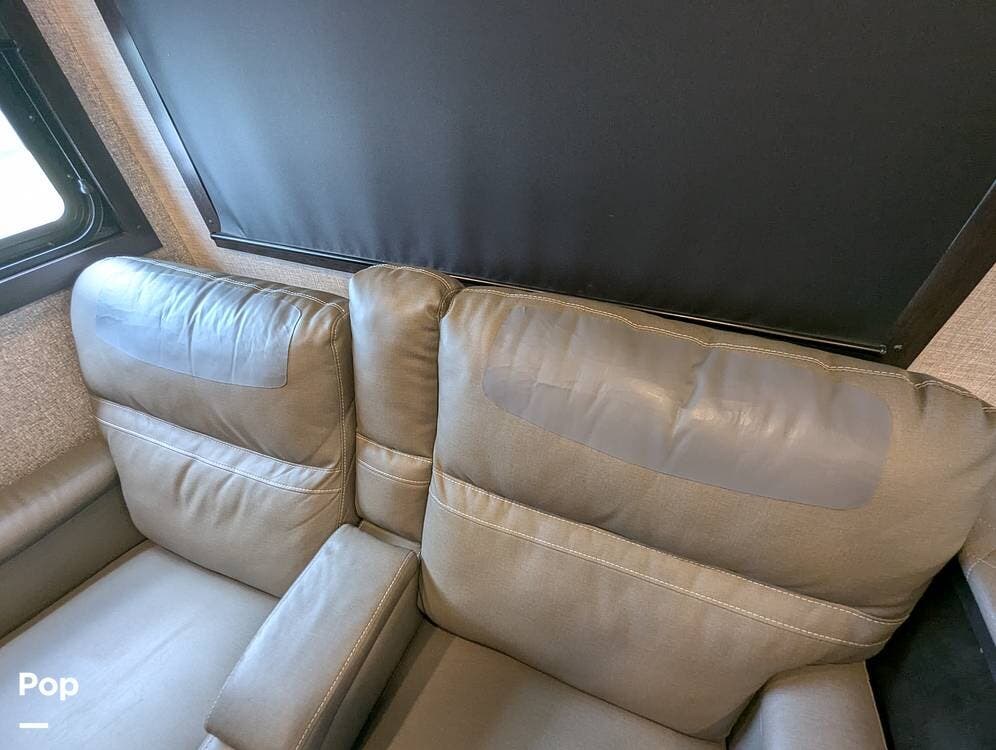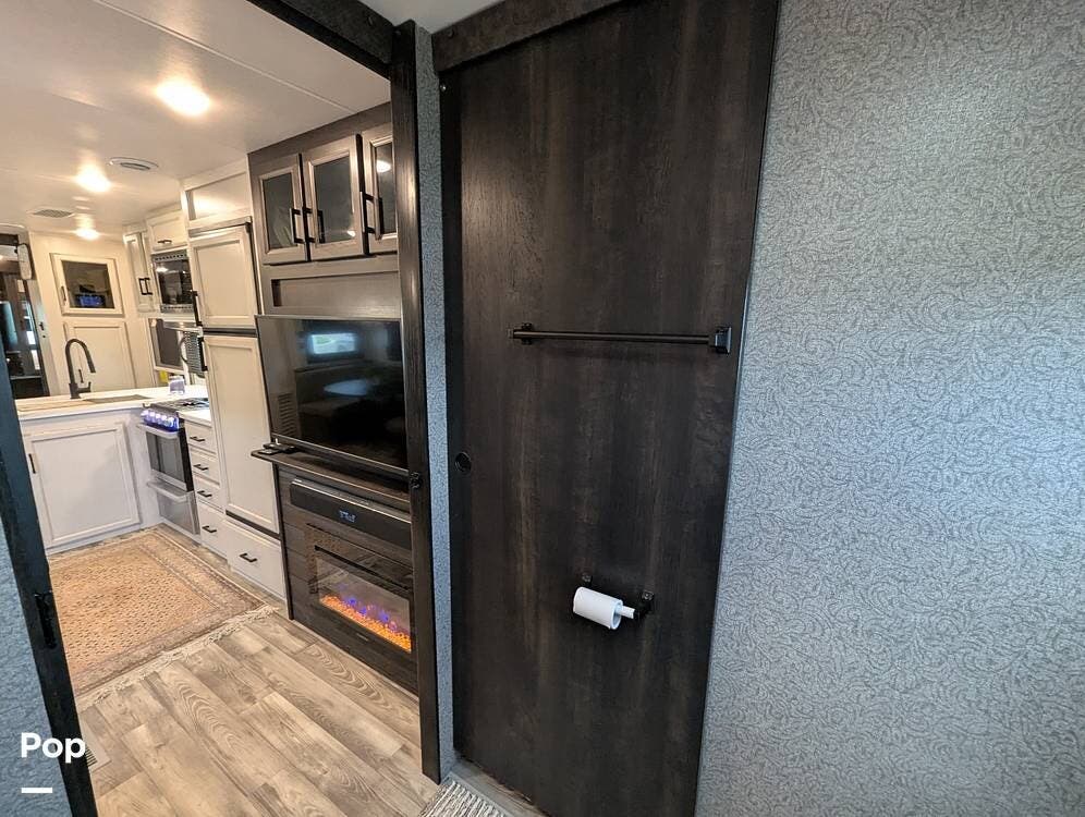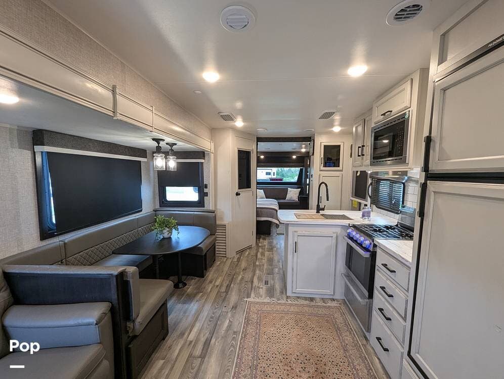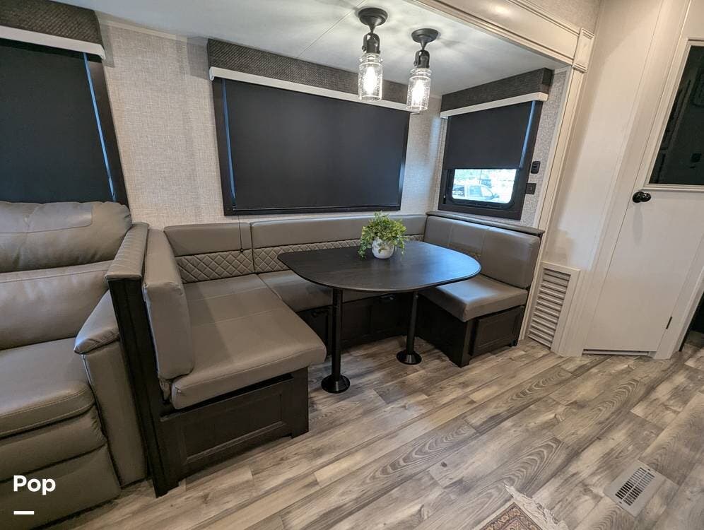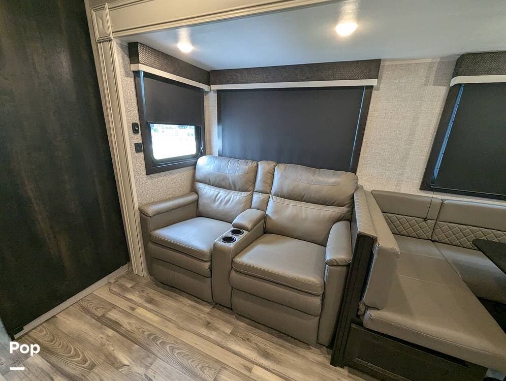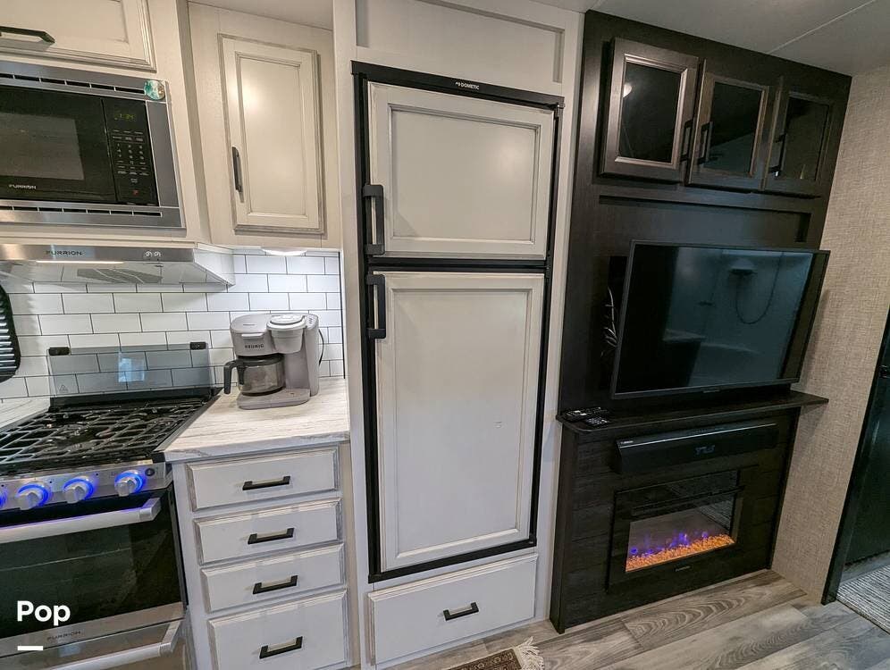 The living area is comfortable, featuring twin recliners, a large-screen TV, and a cozy fireplace for those chilly mornings. The U-shaped dinette converts to a sleeper for two.