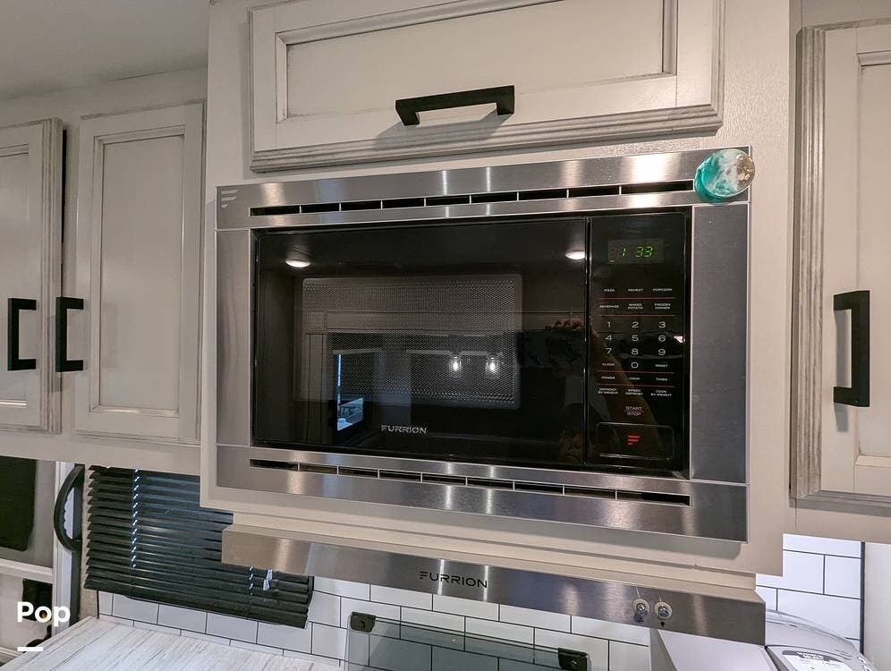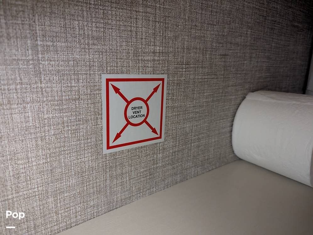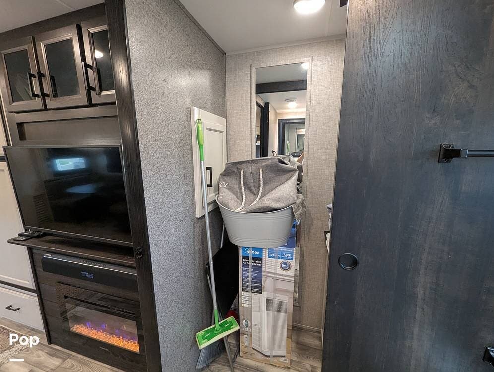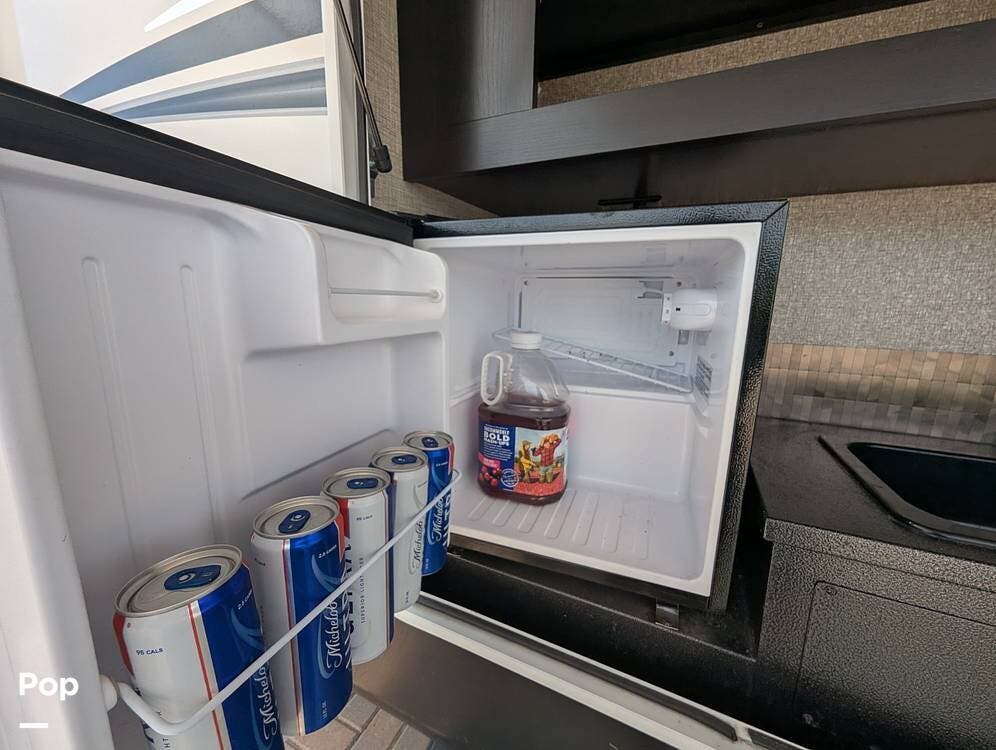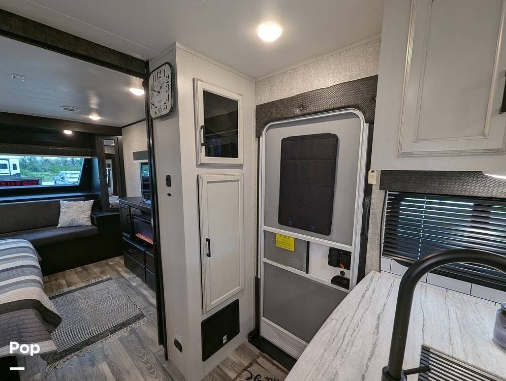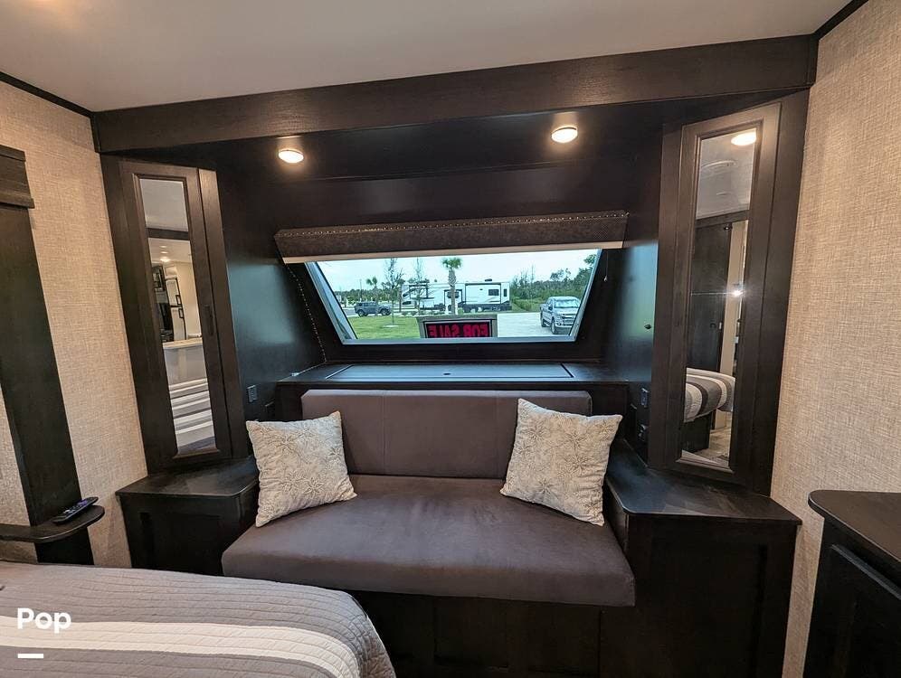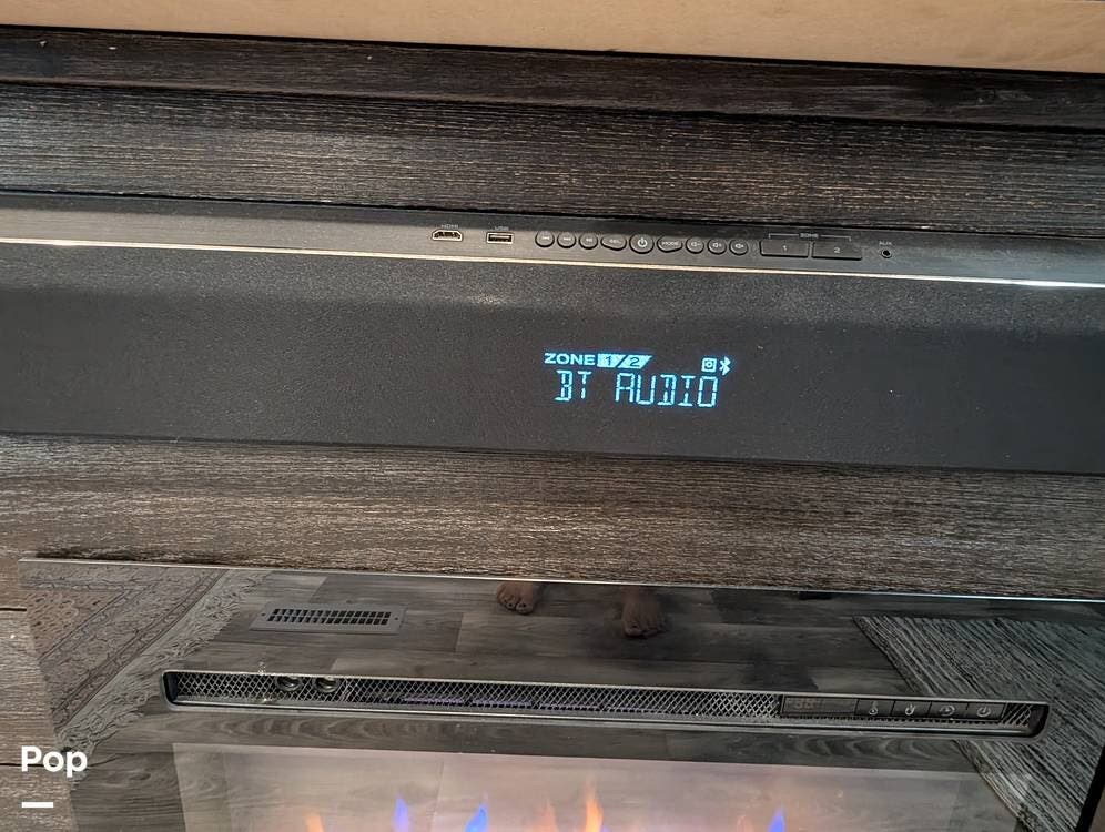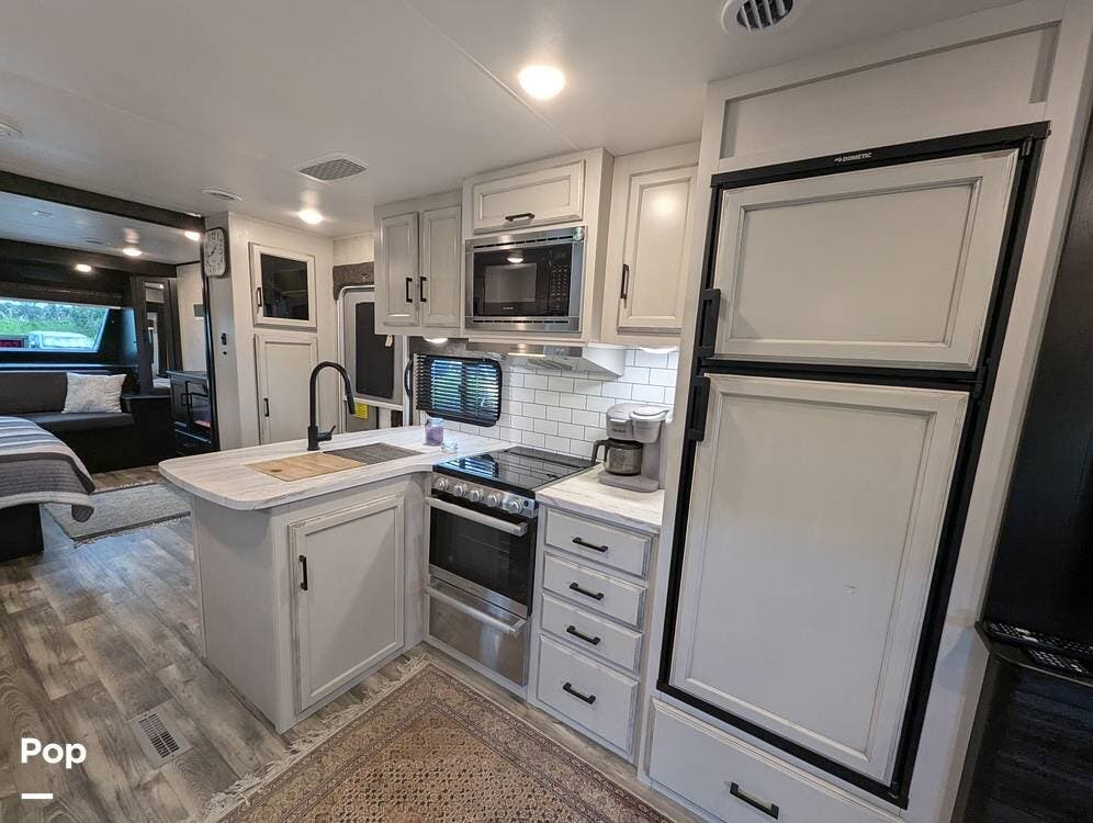 The living area is comfortable, featuring twin recliners, a large-screen TV, and a cozy fireplace for those chilly mornings. The U-shaped dinette converts to a sleeper for two.