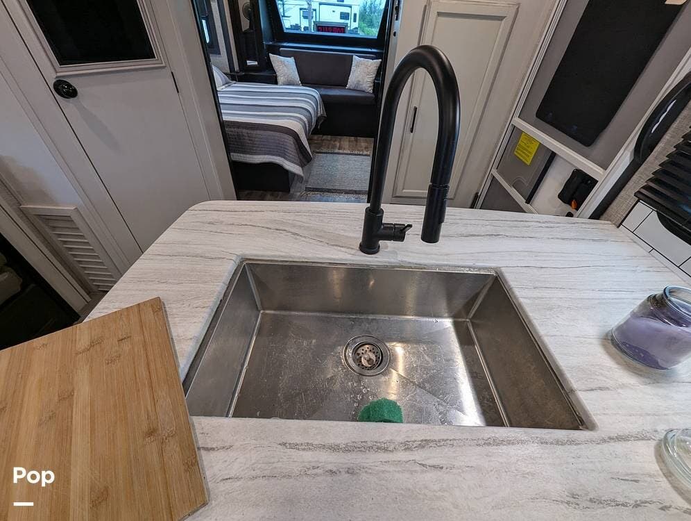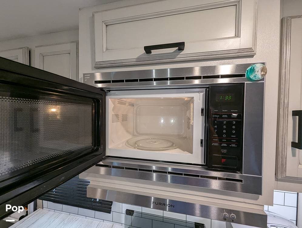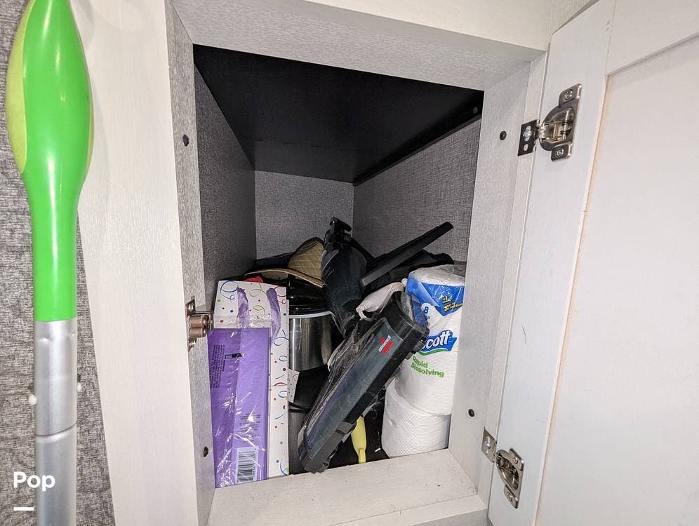 This camper is 38' LOA and has all the amenities you will need. The galley has a stove and oven, a microwave, a large sink, and a nice pantry for storage.